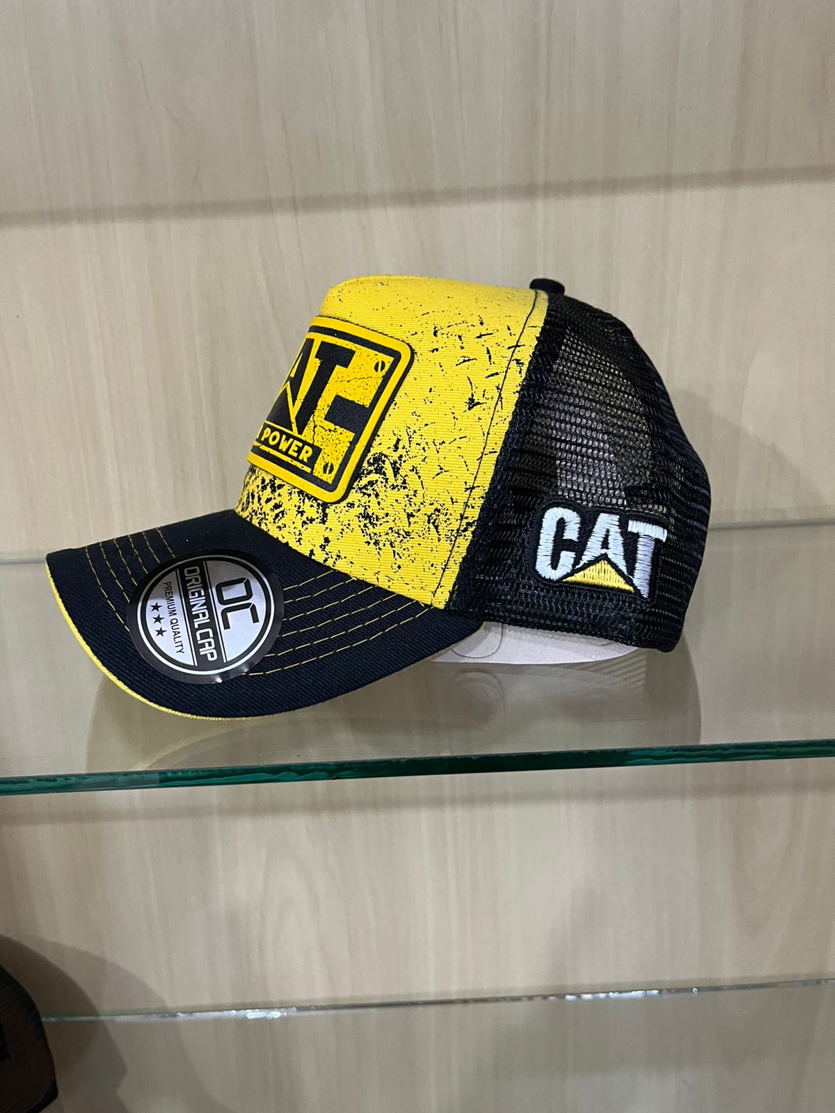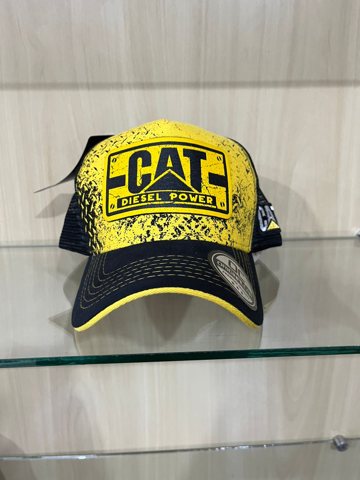 O grande destaque é o patch frontal emborrachado na cor amarela, emoldurado em preto, que exibe o logo icônico da CAT e a inscrição “DIESEL POWER”. A parte traseira é confeccionada em tela preta de alta qualidade (estilo Trucker), garantindo ventilação ideal e conforto. Um detalhe adicional de qualidade é o logo CAT bordado em relevo branco e amarelo na lateral da tela. A aba curva possui costuras reforçadas em linha amarela e conta com o adesivo de originalidade da marca. Possui fechamento traseiro ajustável (snapback) para um encaixe perfeito.