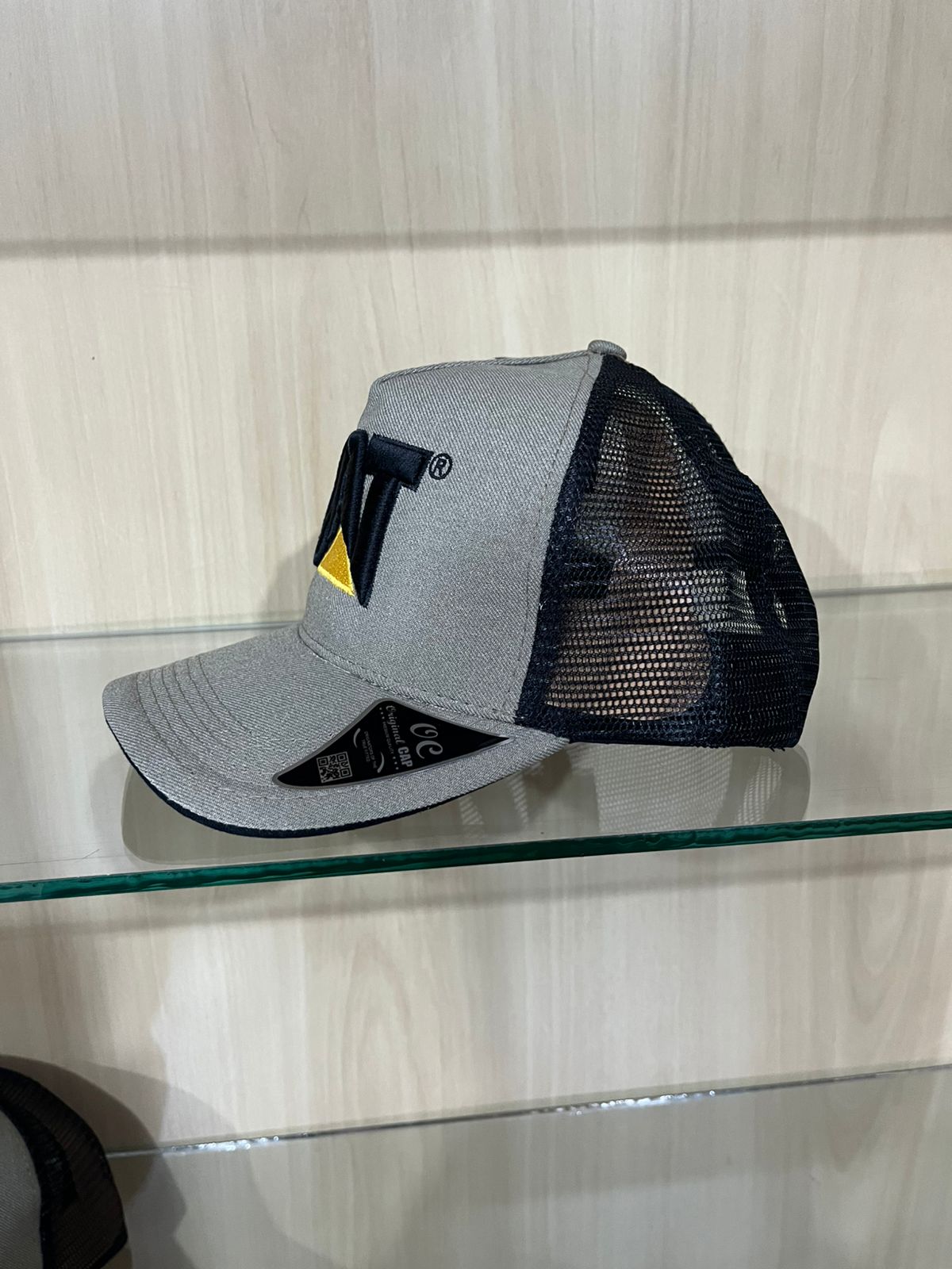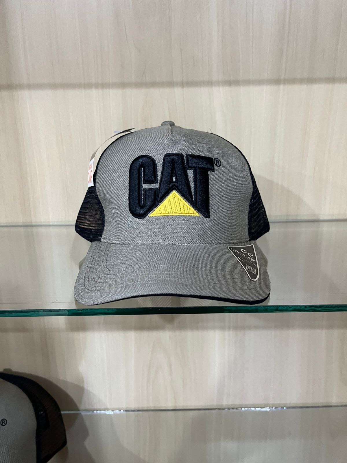 Boné estilo Trucker com frente em tecido cinza mescla e tela respiratória preta. Apresenta o icônico logo “CAT” bordado em destaque na cor preta com o triângulo amarelo, unindo design moderno e a força da marca.