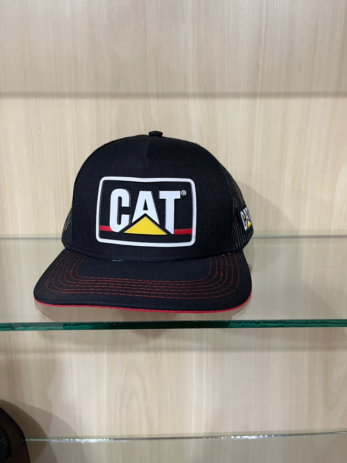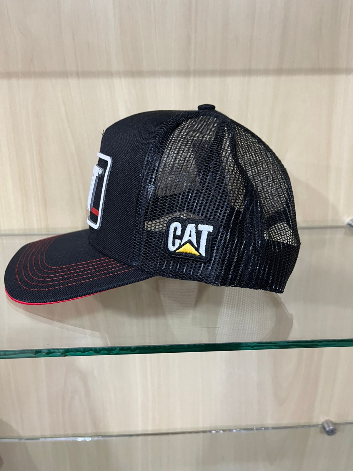 Boné estilo Trucker na cor preta com detalhes vibrantes em vermelho na aba e costuras. Apresenta patch frontal emborrachado da CAT e logo bordado na lateral da tela, unindo o estilo industrial a um design esportivo e moderno.