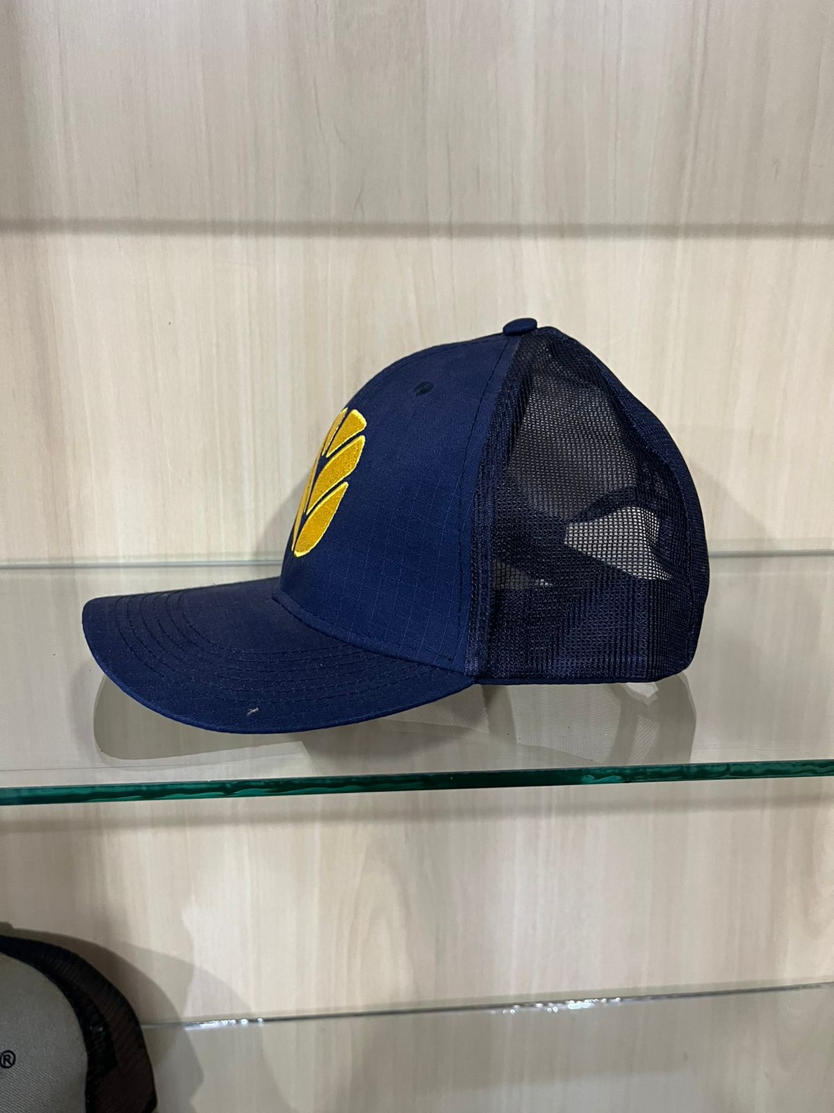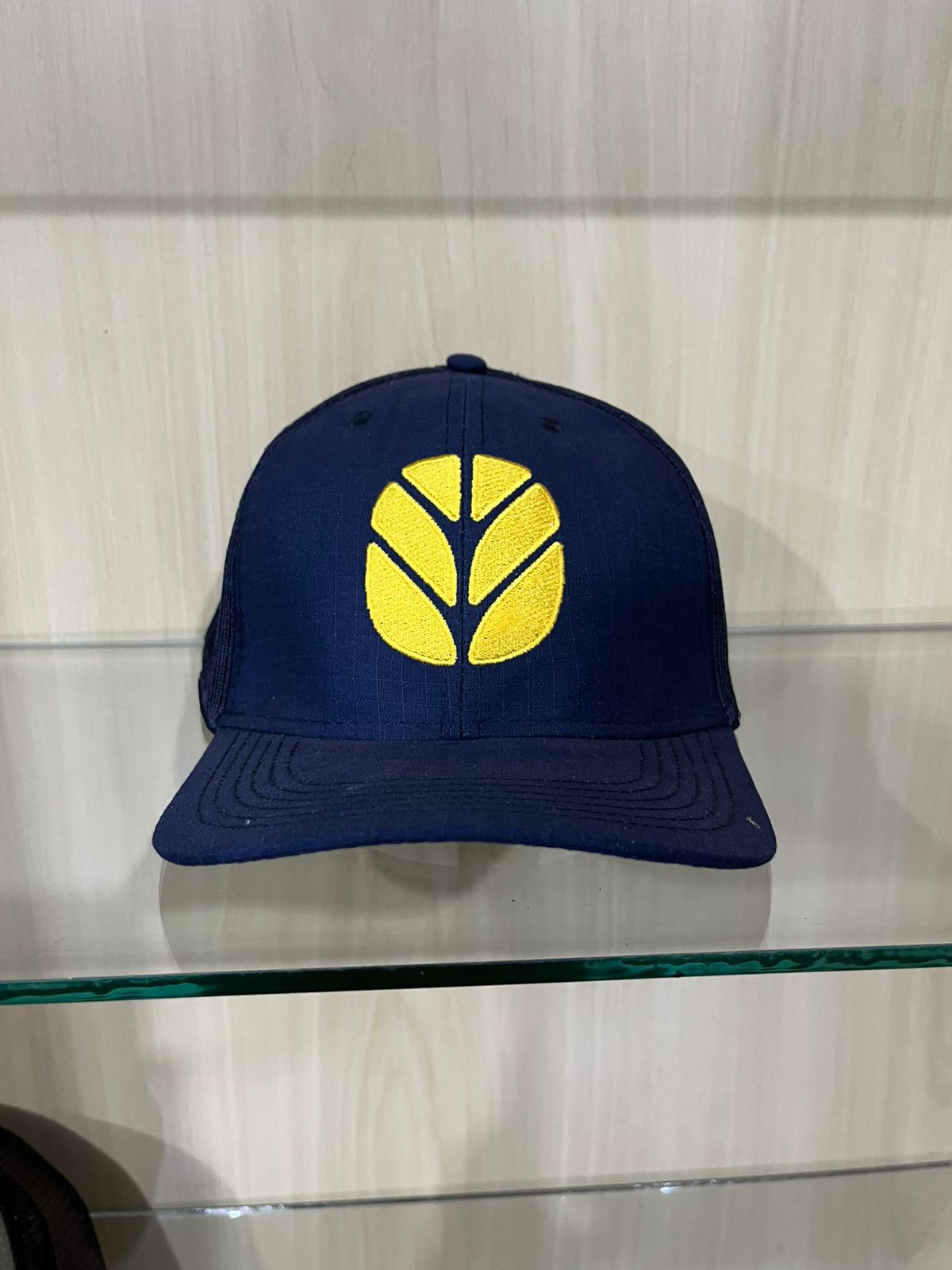 O grande destaque é o logo da “folha” New Holland bordado em alto relevo e com preenchimento denso na cor amarela, centralizado na parte frontal estruturada. A parte traseira em tela azul marinho garante a ventilação necessária para longas jornadas sob o sol, mantendo o conforto térmico. A aba curva conta com costuras reforçadas que preservam o formato da peça. Possui fechamento traseiro ajustável (snapback), garantindo um encaixe perfeito e seguro.
