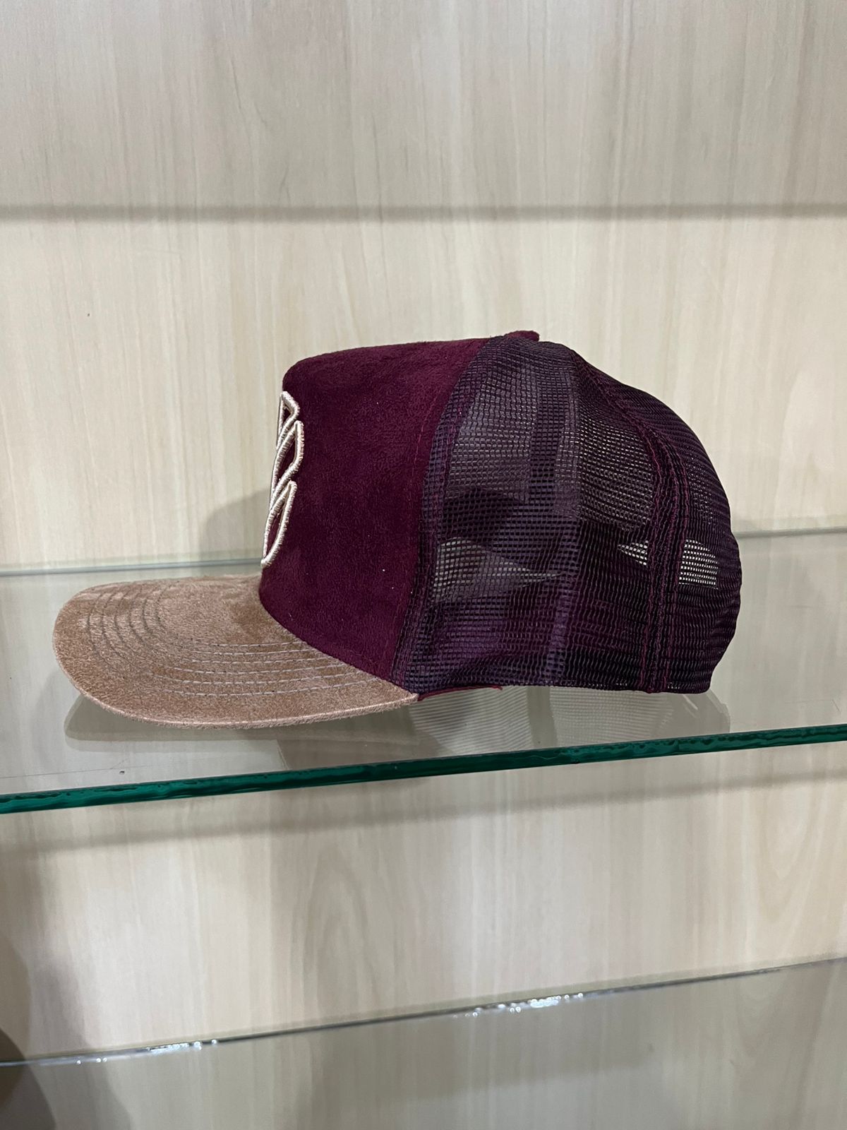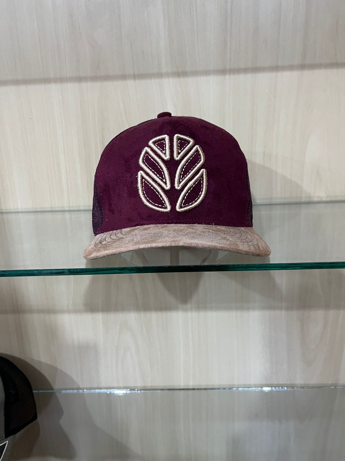 O diferencial desta peça reside no trabalho artístico do logo frontal: a icônica folha da New Holland é apresentada apenas em seu contorno, bordado com linha bege em alto relevo, o que confere profundidade e um visual moderno ao acessório. A parte traseira em tela (mesh) na cor vinho garante a ventilação necessária com total conforto térmico. A aba curva em camurça bege possui costuras reforçadas em linha clara, completando o design refinado. Possui fechamento traseiro ajustável (snapback) para um encaixe perfeito.