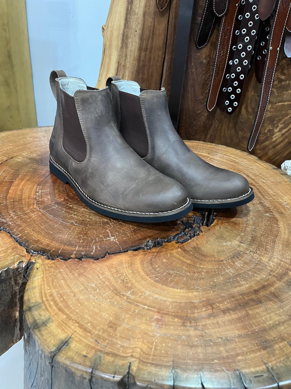 Bota masculina estilo Chelsea na cor marrom stone com acabamento rústico. Possui fechamento em elástico lateral para facilitar o calce, bico redondo e solado de borracha preto com vira pespontada.