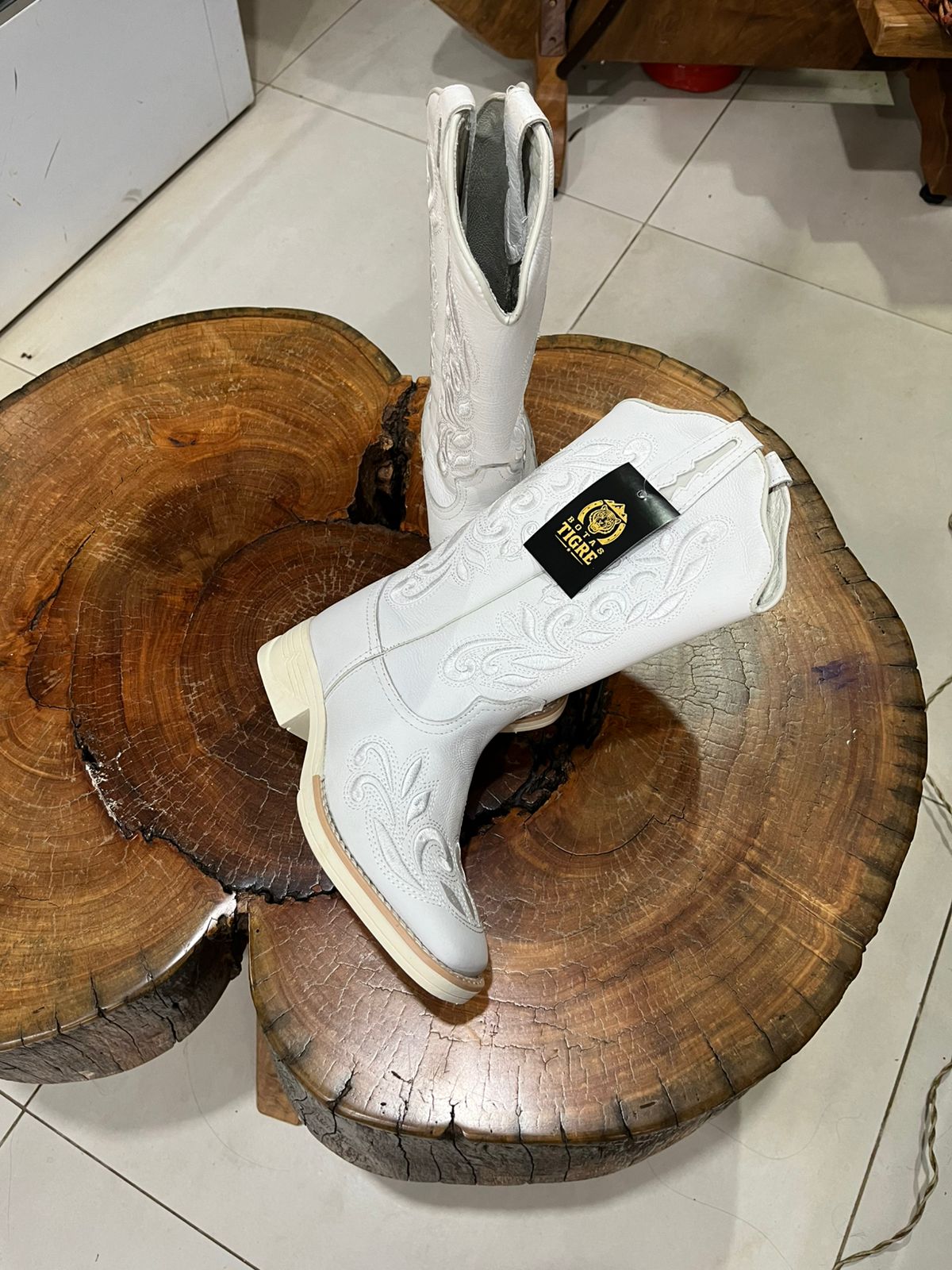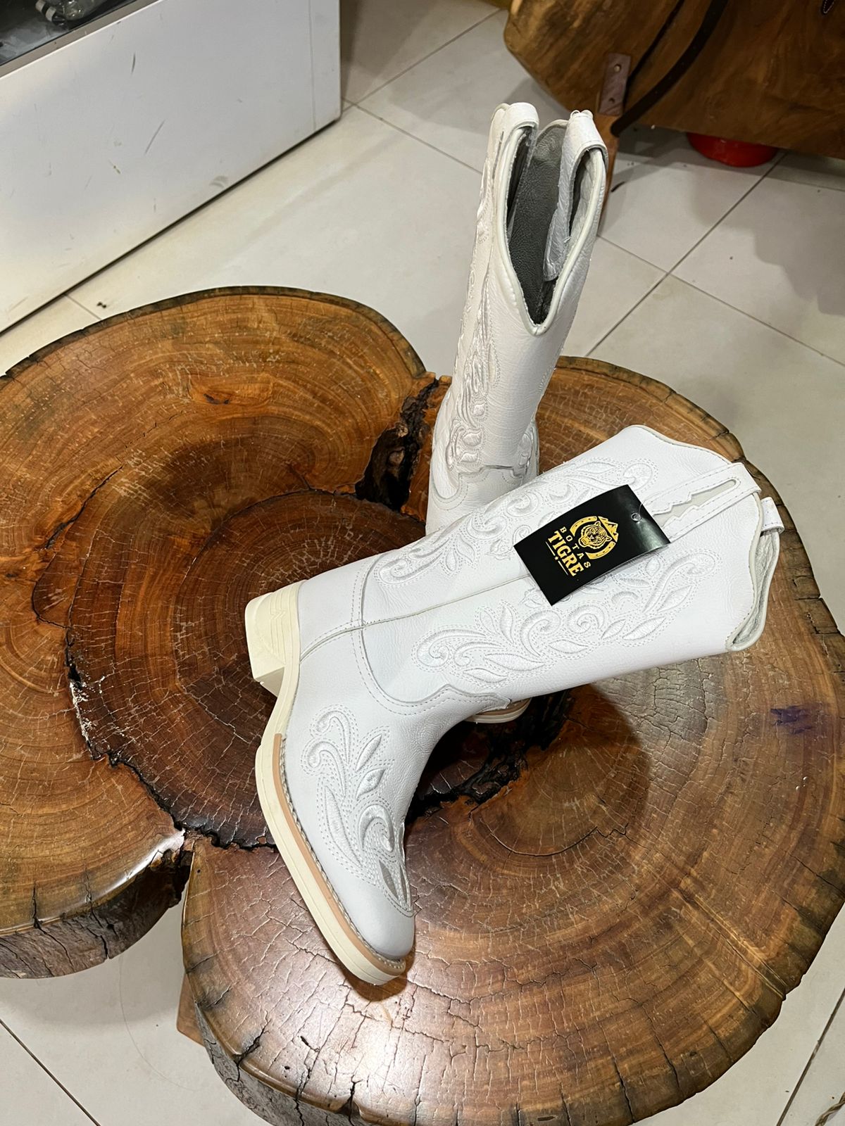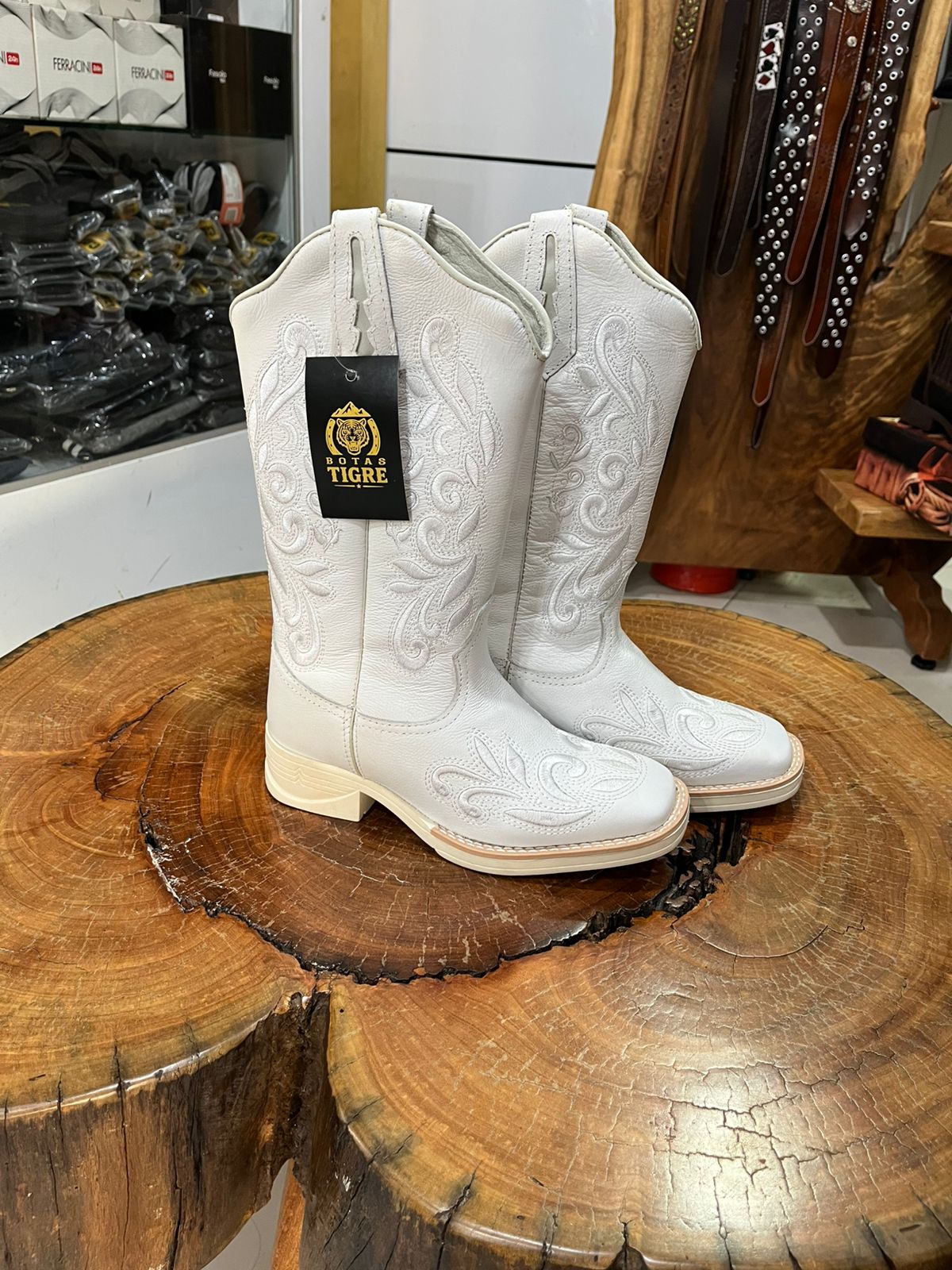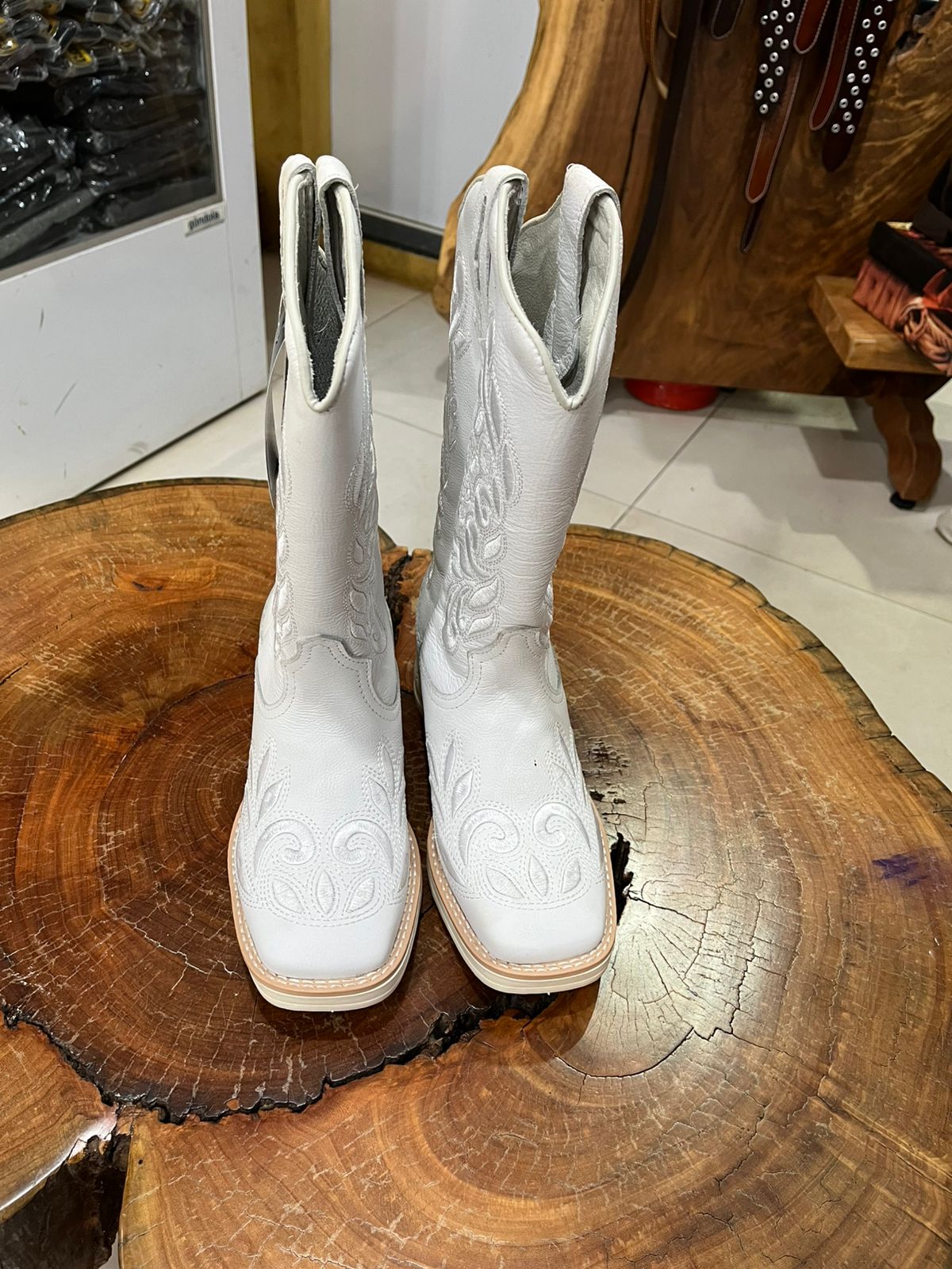 Esta bota de cano alto é a escolha perfeita para quem busca um visual country moderno, limpo e extremamente elegante. Totalmente na cor branca, o modelo apresenta um design monocromático onde o charme reside nos detalhes: ricos bordados em estilo arabesco e floral percorrem todo o cano e o peito do pé, executados com linha branca para criar uma textura em relevo discreta e luxuosa.