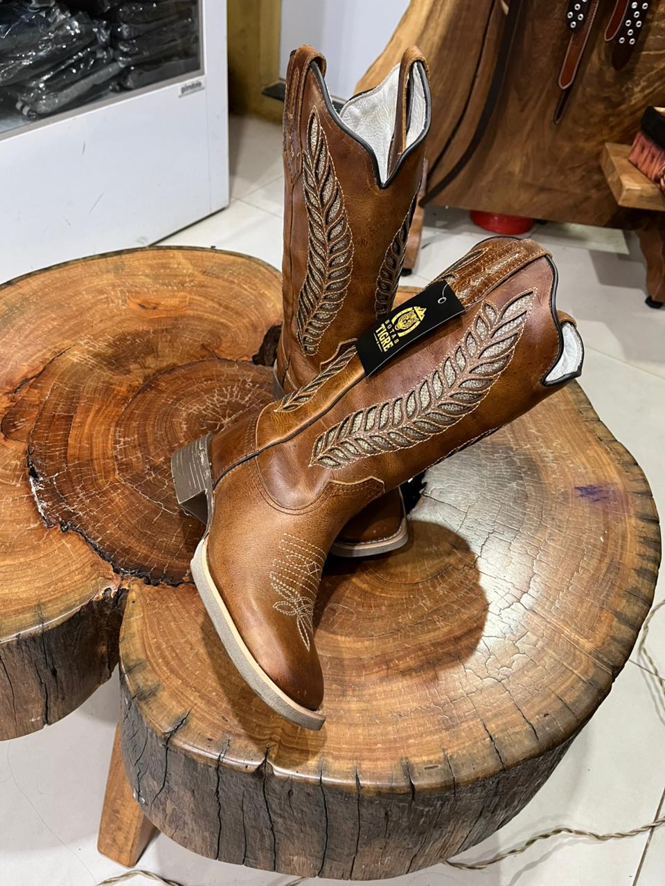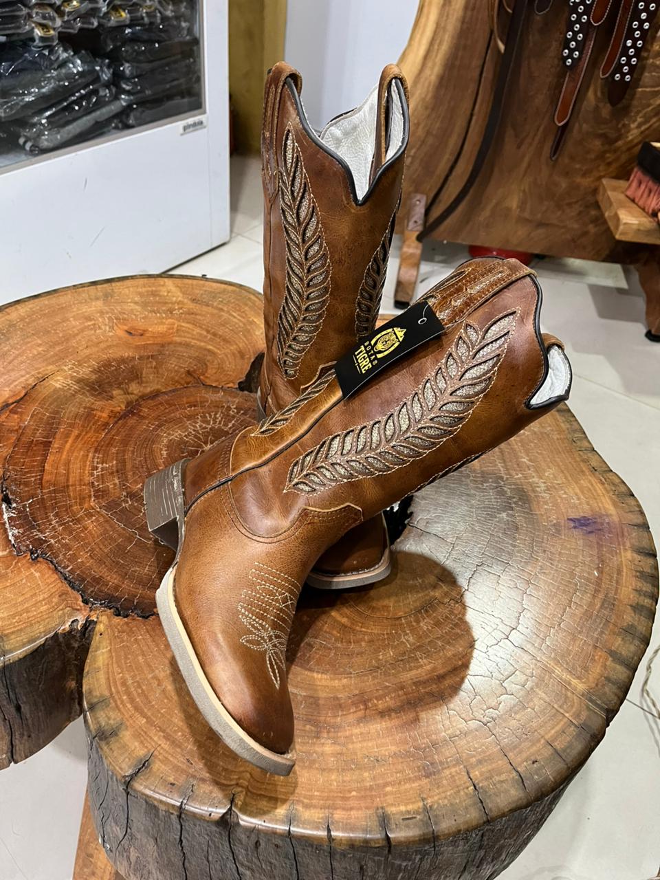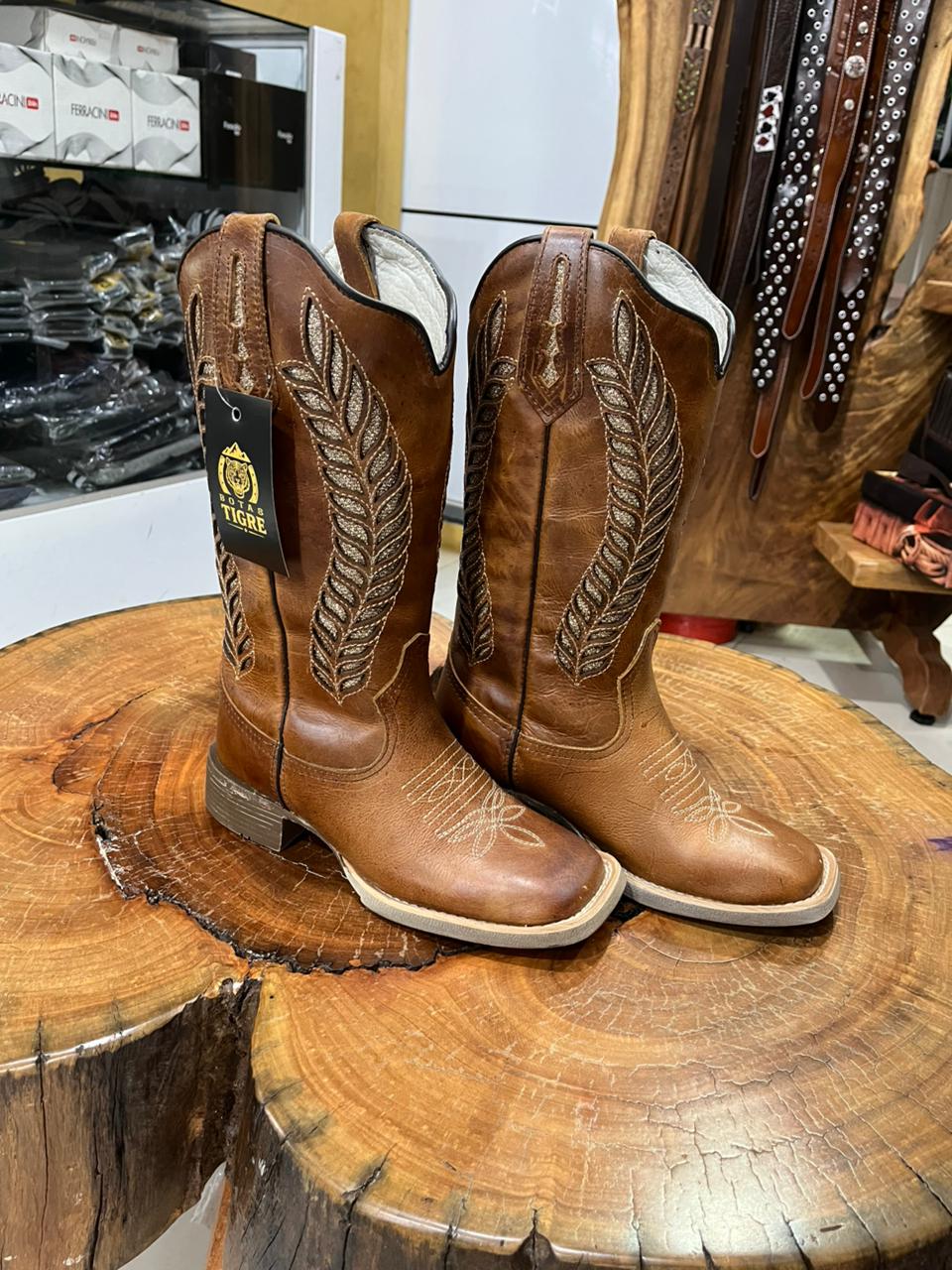 Adicione sofisticação e brilho ao seu visual country com esta bota texana feminina de cano alto na cor marrom café profundo. O modelo combina a rusticidade do pé com textura de escamas e a elegância do cano liso. O verdadeiro destaque visual está no cano, que exibe pespontos claros decorativos desenhando recortes western e um imponente bordado em formato de pluma, enriquecido com a aplicação de strass que garantem um brilho especial a cada movimento. Pespontos claros decorativos ornam o peito do pé. Equipada com puxadores laterais integrados para facilitar o calce e salto médio. O solado escuro resistente e a vira clara com pesponto completam o design, unindo tradição e modernidade com muita atitude. Ideal para compor produções cheias de personalidade em rodeios, shows ou festas.