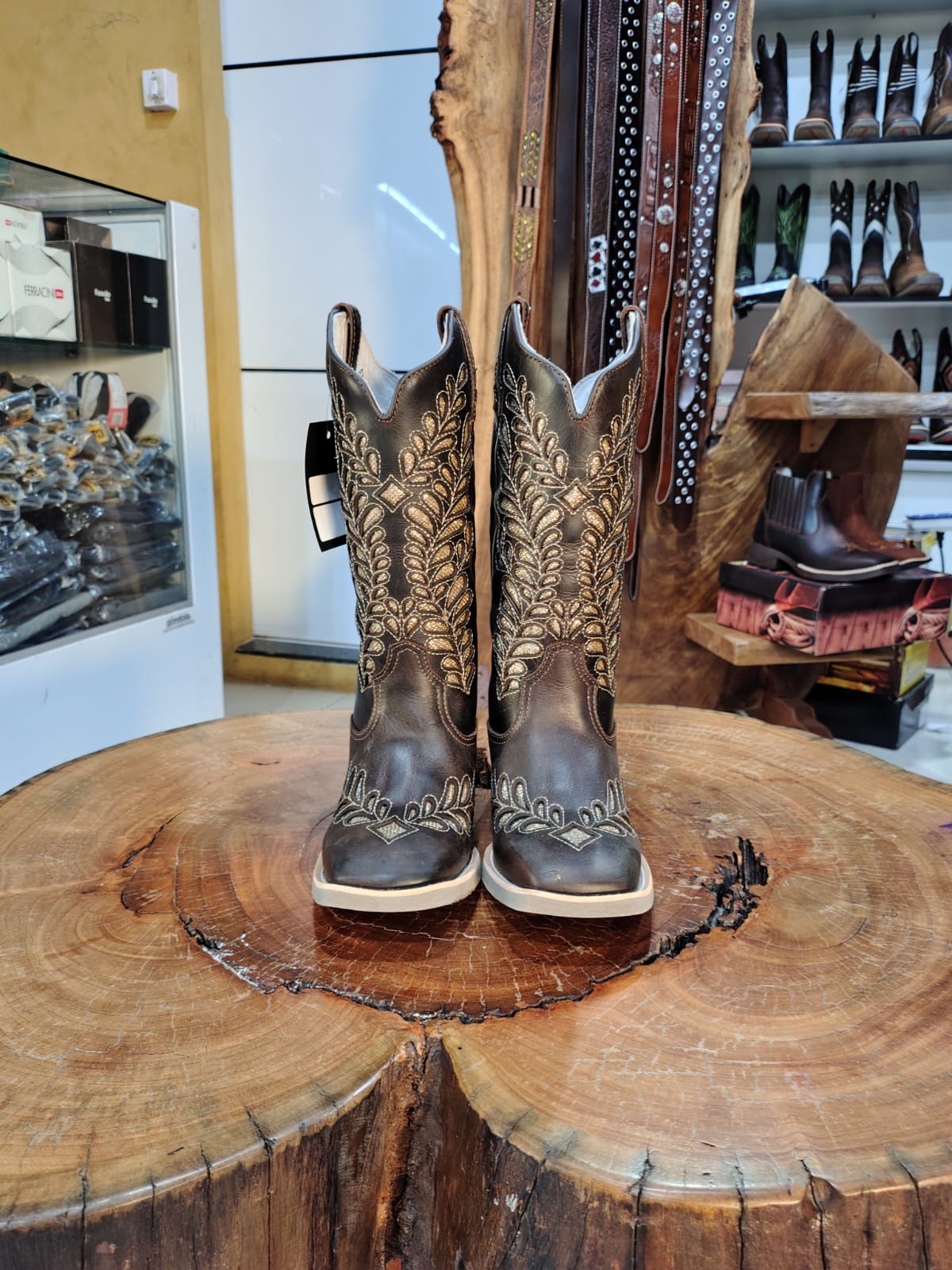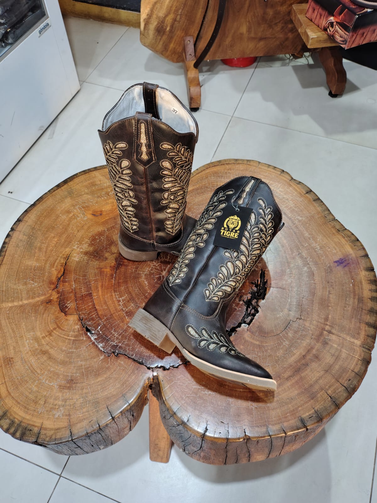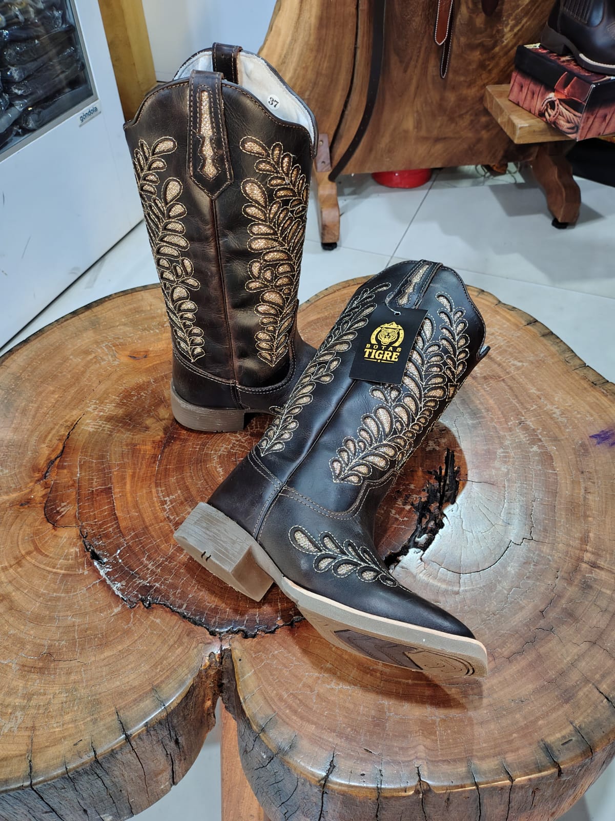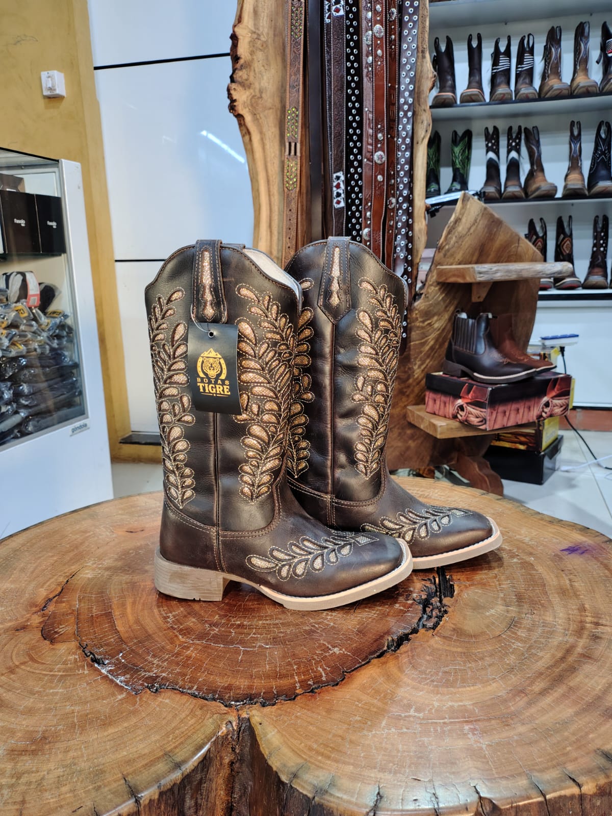 Esta bota é a união perfeita entre a força do estilo country e o glamour dos detalhes brilhantes. Confeccionada em couro na cor marrom café com acabamento rústico, o modelo serve como uma base elegante para um trabalho artesanal sofisticado. O bico quadrado garante o conforto e a durabilidade clássica, enquanto a silhueta de cano alto oferece elegância para qualquer composição.