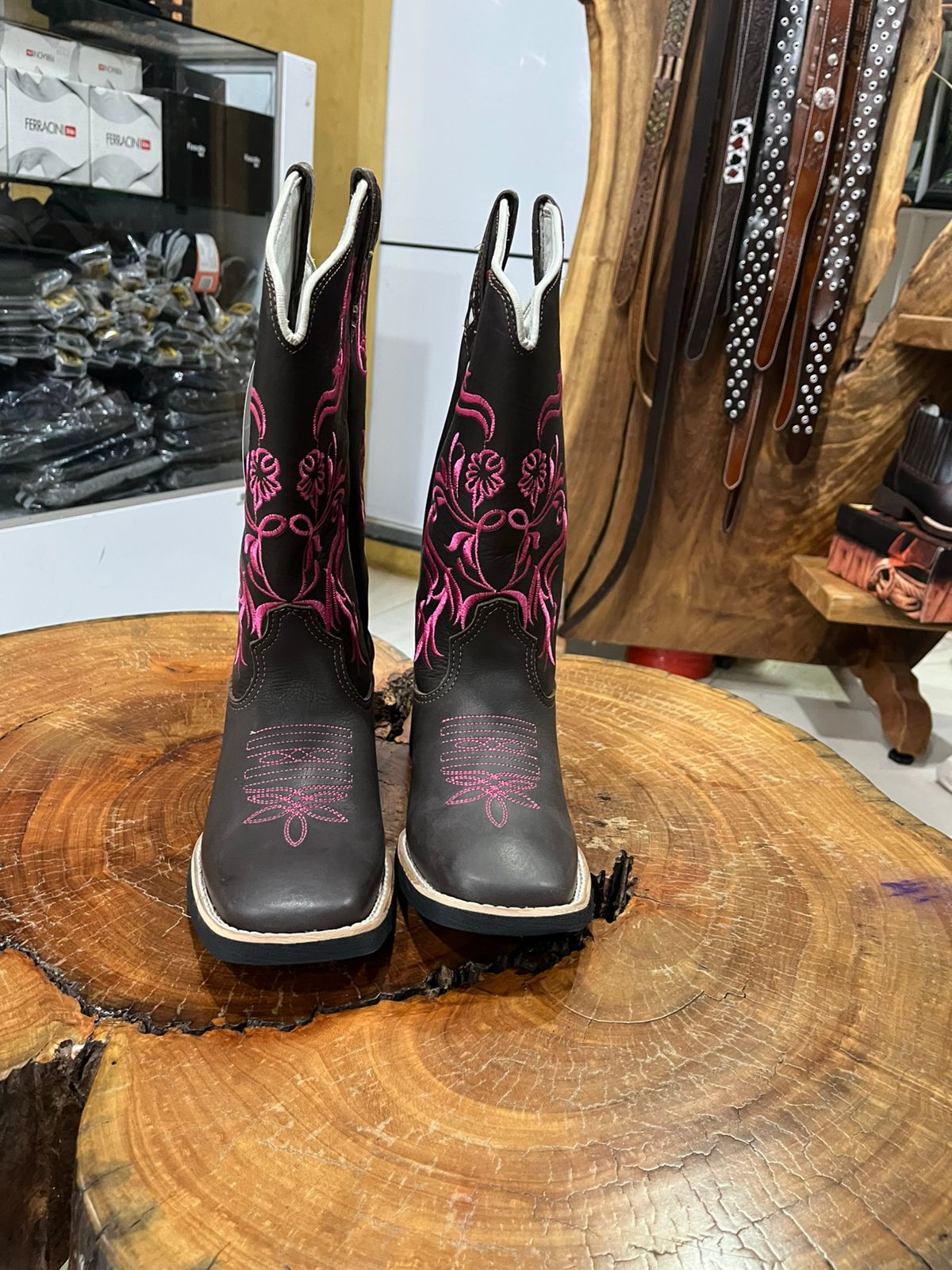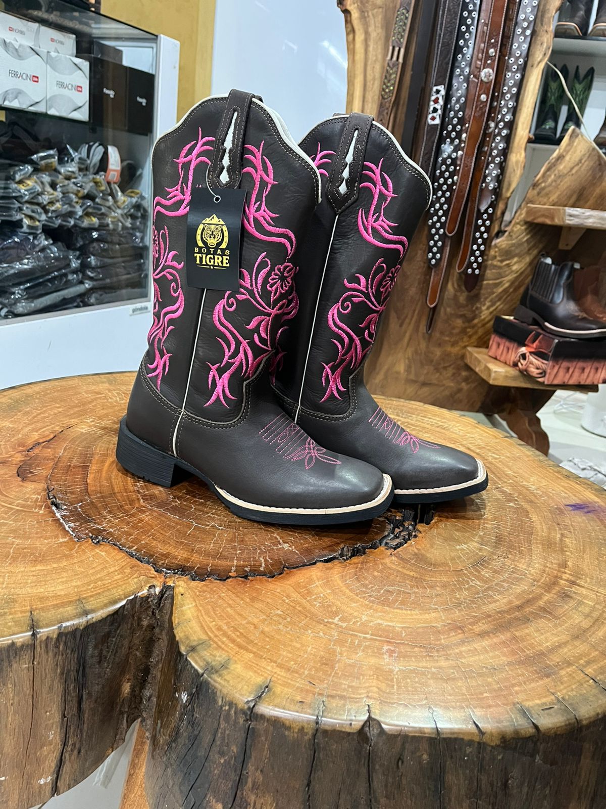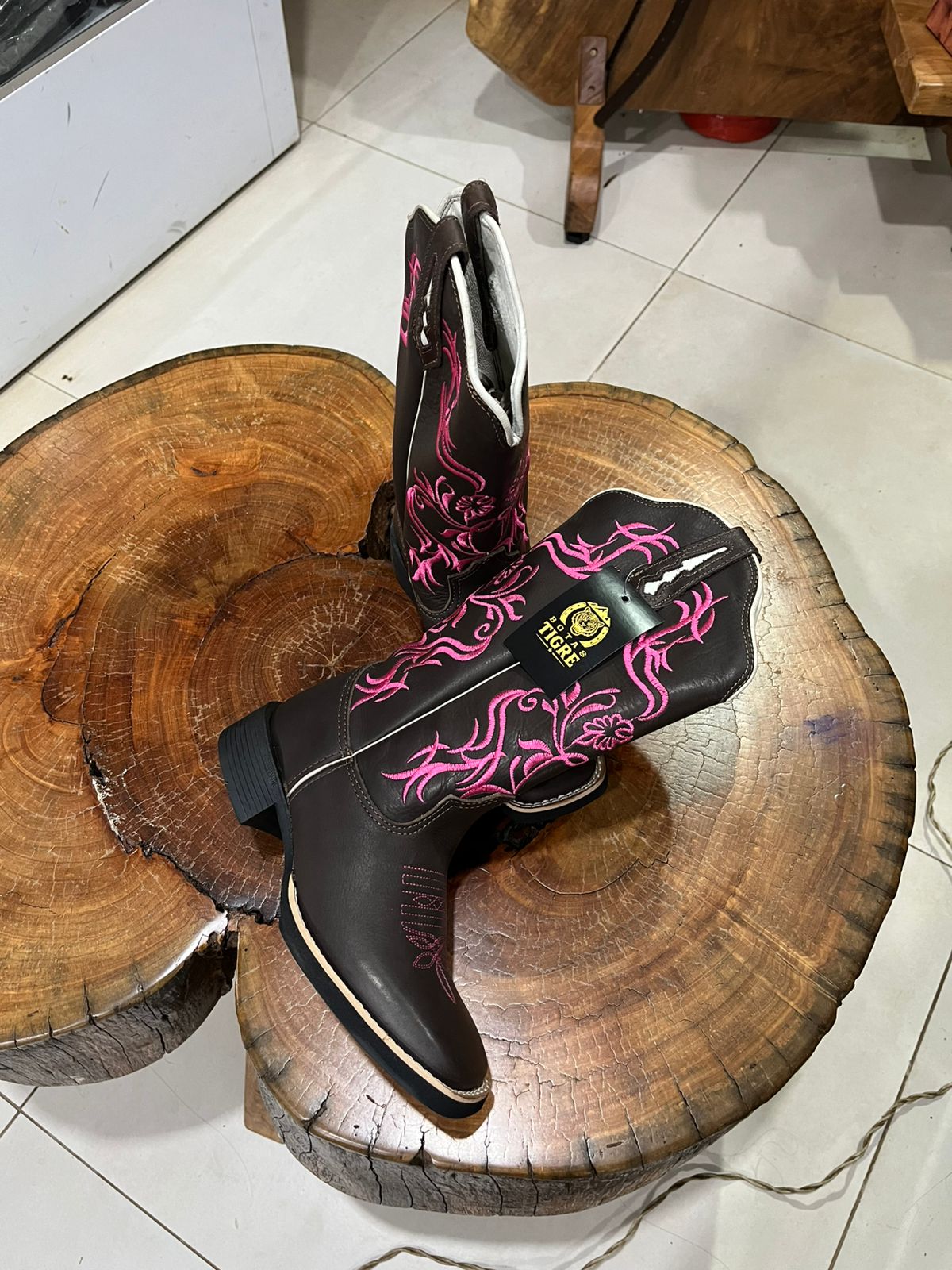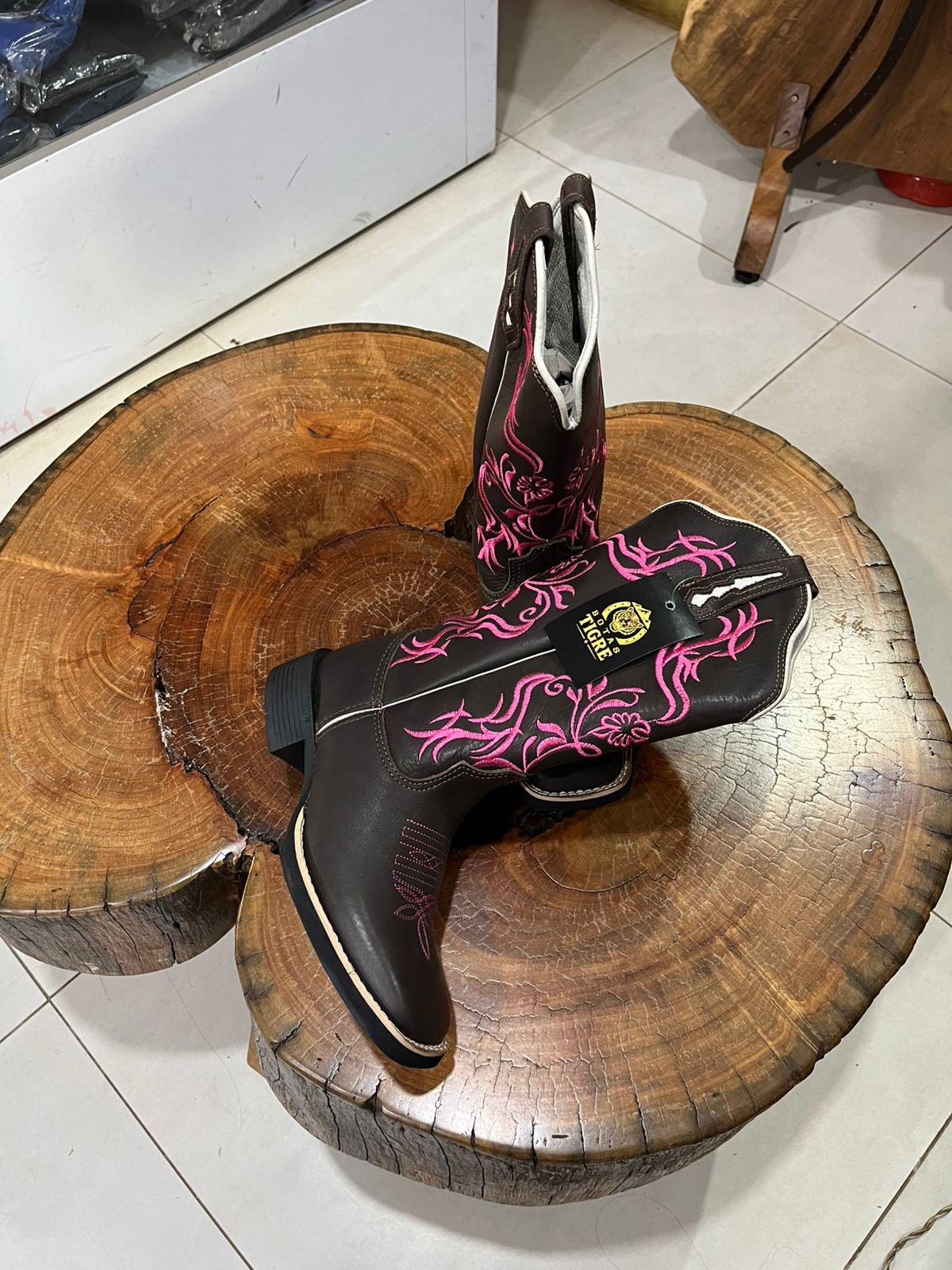 Adicione um toque de cor e autenticidade ao seu visual country com esta bota texana feminina de cano alto. Confeccionada em um tom marrom café profundo, esta peça apresenta uma silhueta clássica e bico quadrado contemporâneo que garante conforto. O grande diferencial está no minucioso e vibrante trabalho de bordado: intrincados arabescos e formas florais na cor rosa pink preenchem o cano e ornam o peito do pé, criando um contraste fascinante sobre o fundo marrom. A bota possui puxadores laterais integrados para facilitar o calce e salto baixo rústico. O solado preto resistente e a vira clara com pesponto completam o design, unindo tradição e modernidade com muita atitude. Ideal para compor produções cheias de personalidade em rodeios, shows ou festas.