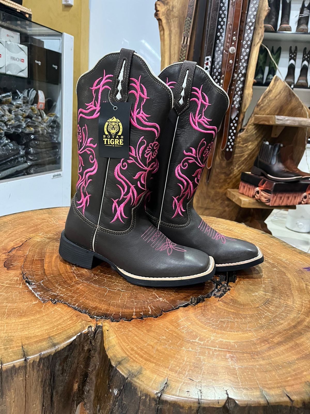 Bota Texana Feminina Marrom Café com Bordado Rosa Pink