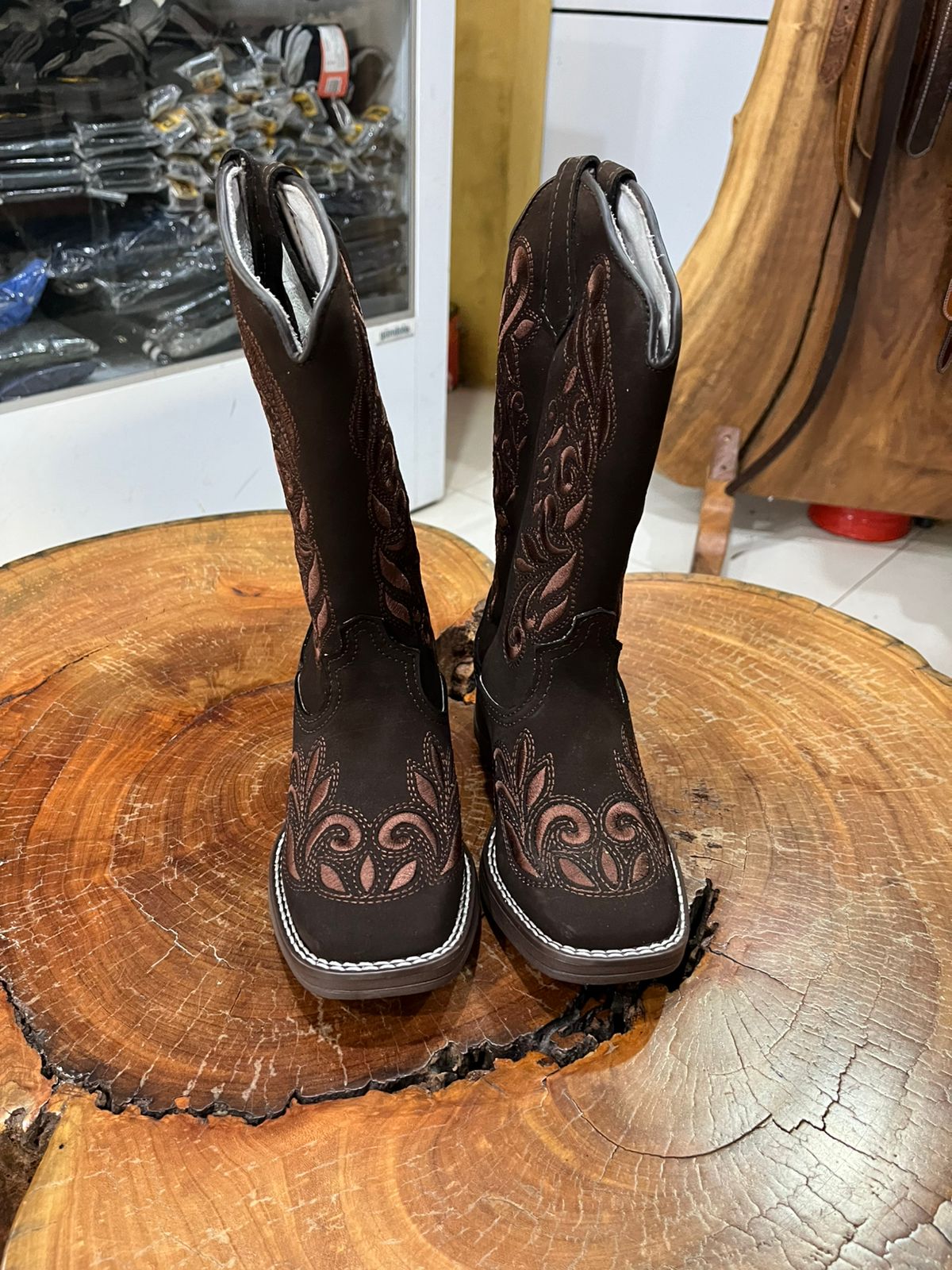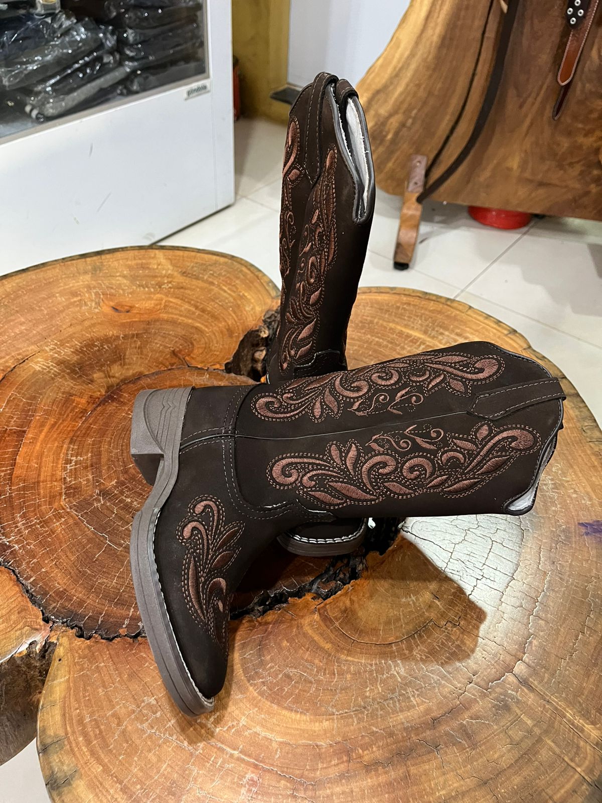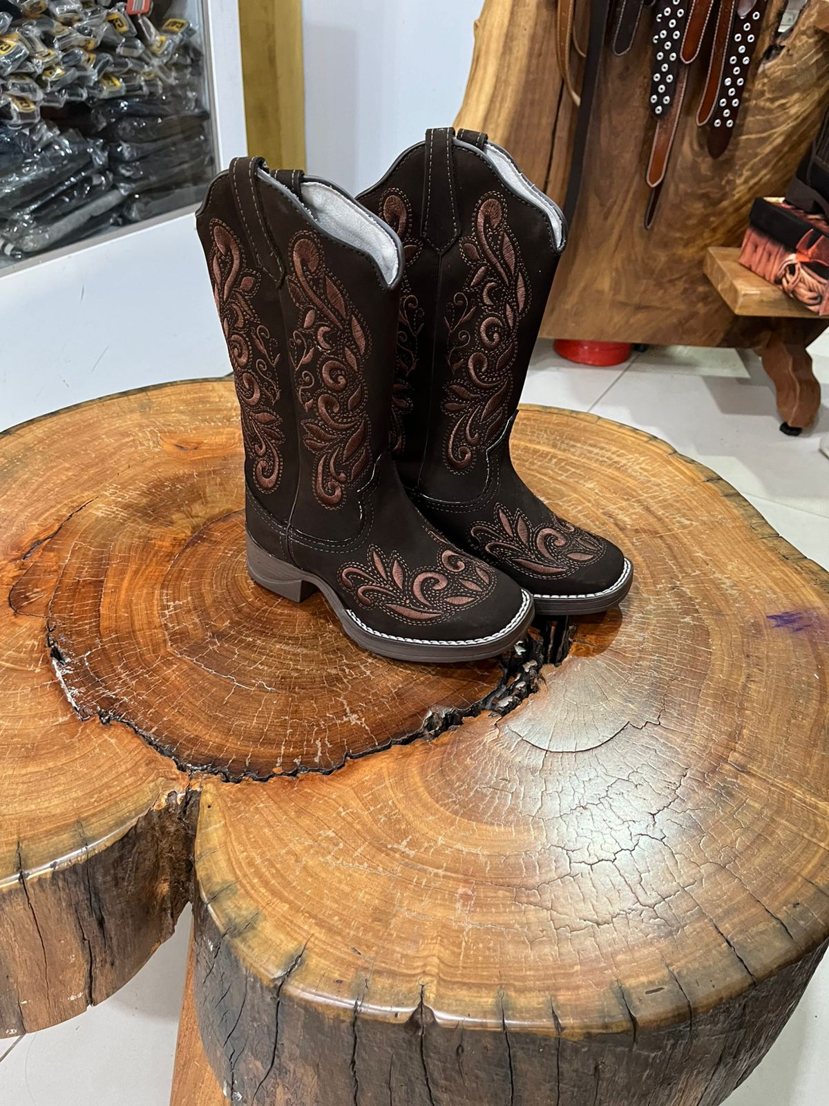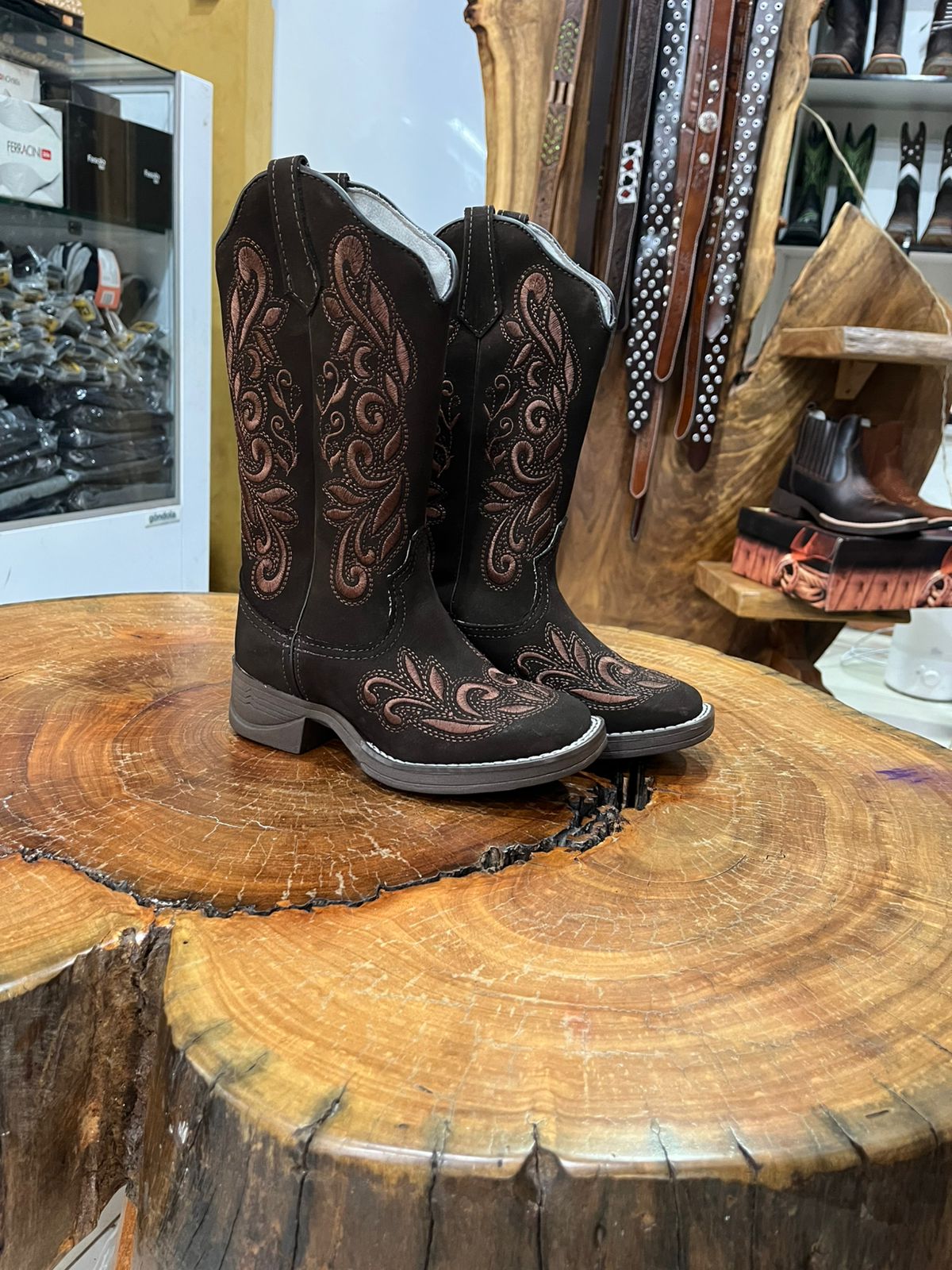 Esta bota de cano alto combina a força do estilo sertanejo com o brilho sofisticado dos detalhes em strass. O modelo apresenta uma tonalidade marrom café profunda, que serve de base para um trabalho artístico de bordados em estilo arabesco e floral. O grande diferencial desta peça são os pontos de brilho (strass) aplicados sobre os bordados, tanto no cano quanto no peito do pé, criando um efeito luminoso que se destaca em qualquer ambiente.
