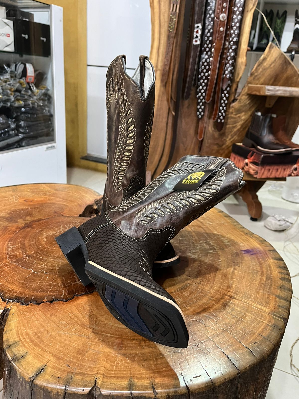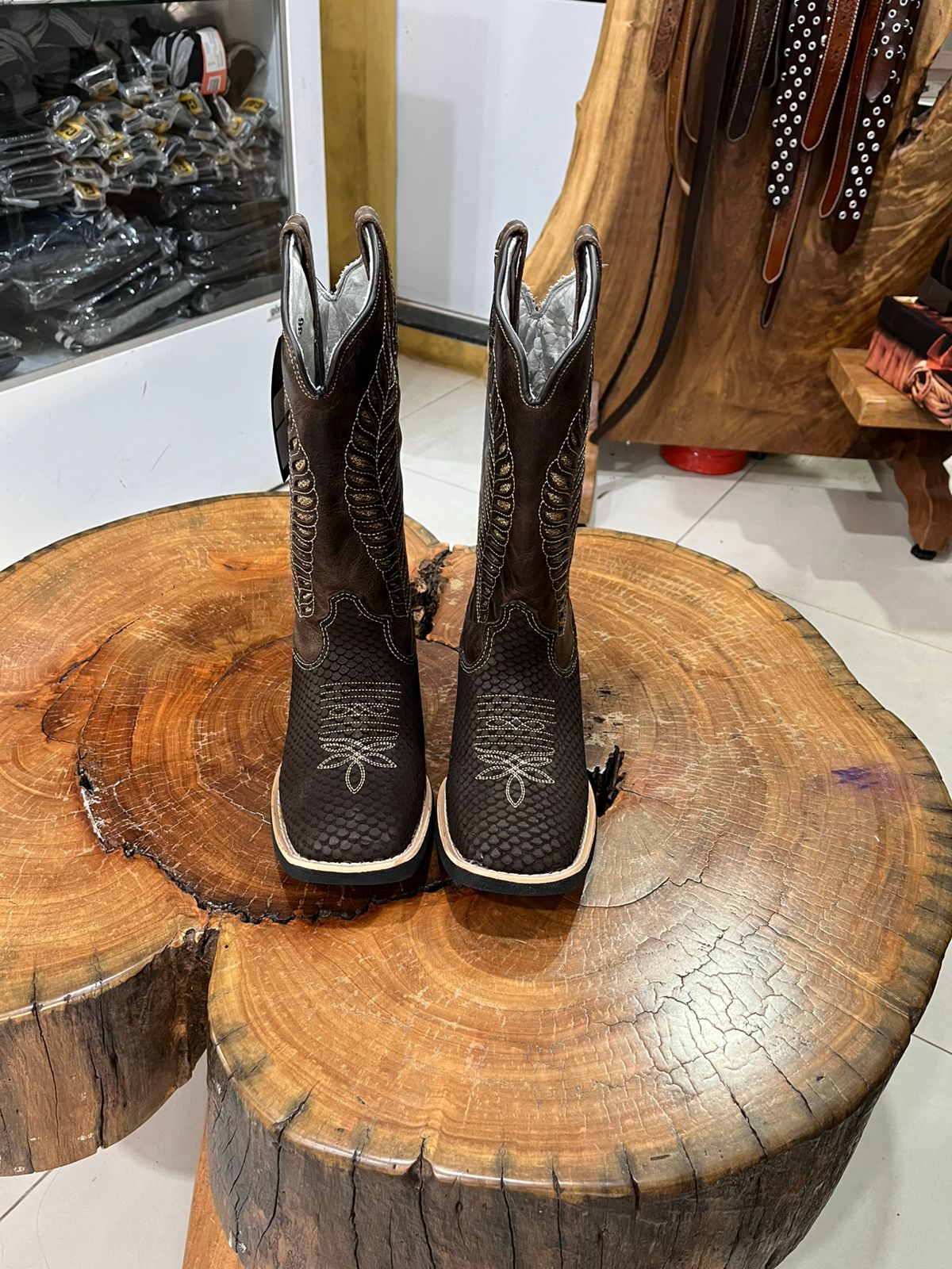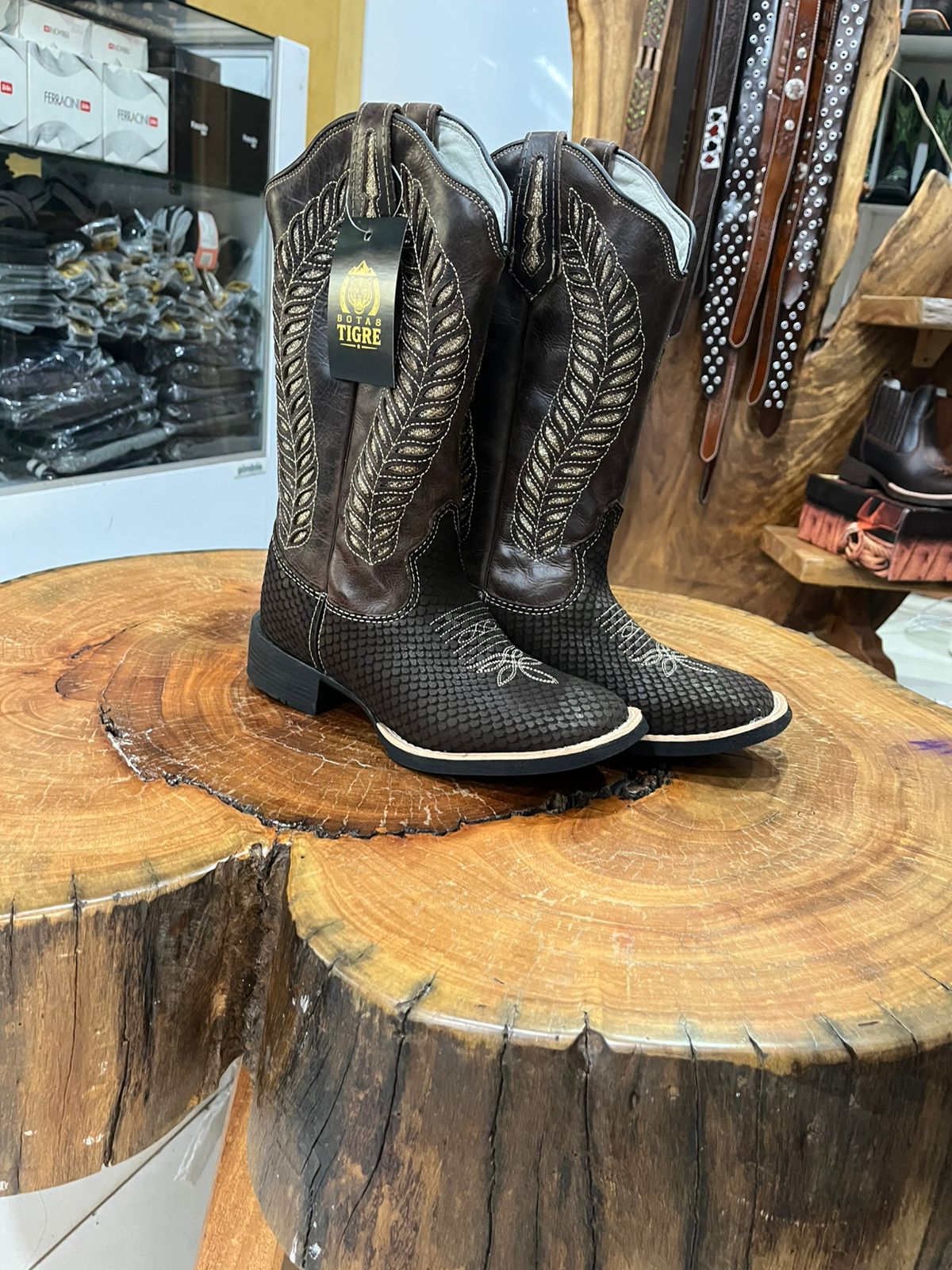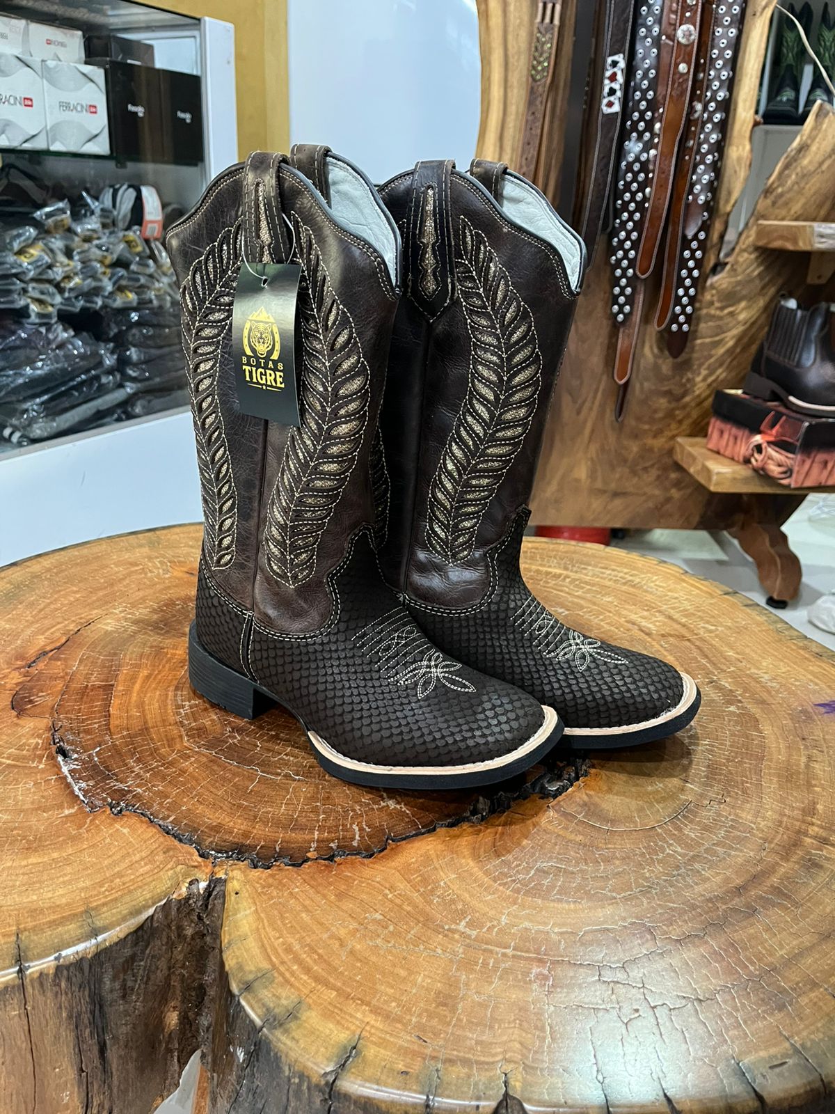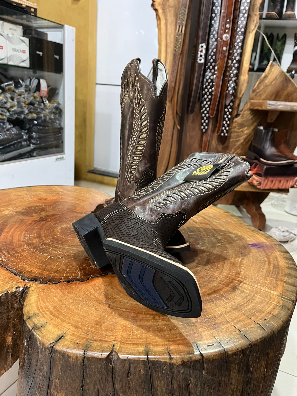 Esta bota de cano alto é uma verdadeira obra de arte do estilo country, unindo diferentes texturas e um brilho sofisticado. A parte inferior apresenta uma textura marcante em relevo que simula escamas, enquanto o cano alto segue um acabamento liso em marrom café profundo. O grande diferencial visual está no cano, que exibe bordados laterais imponentes em formato de plumas, adornados com a aplicação de strass que garantem um brilho especial a cada movimento.