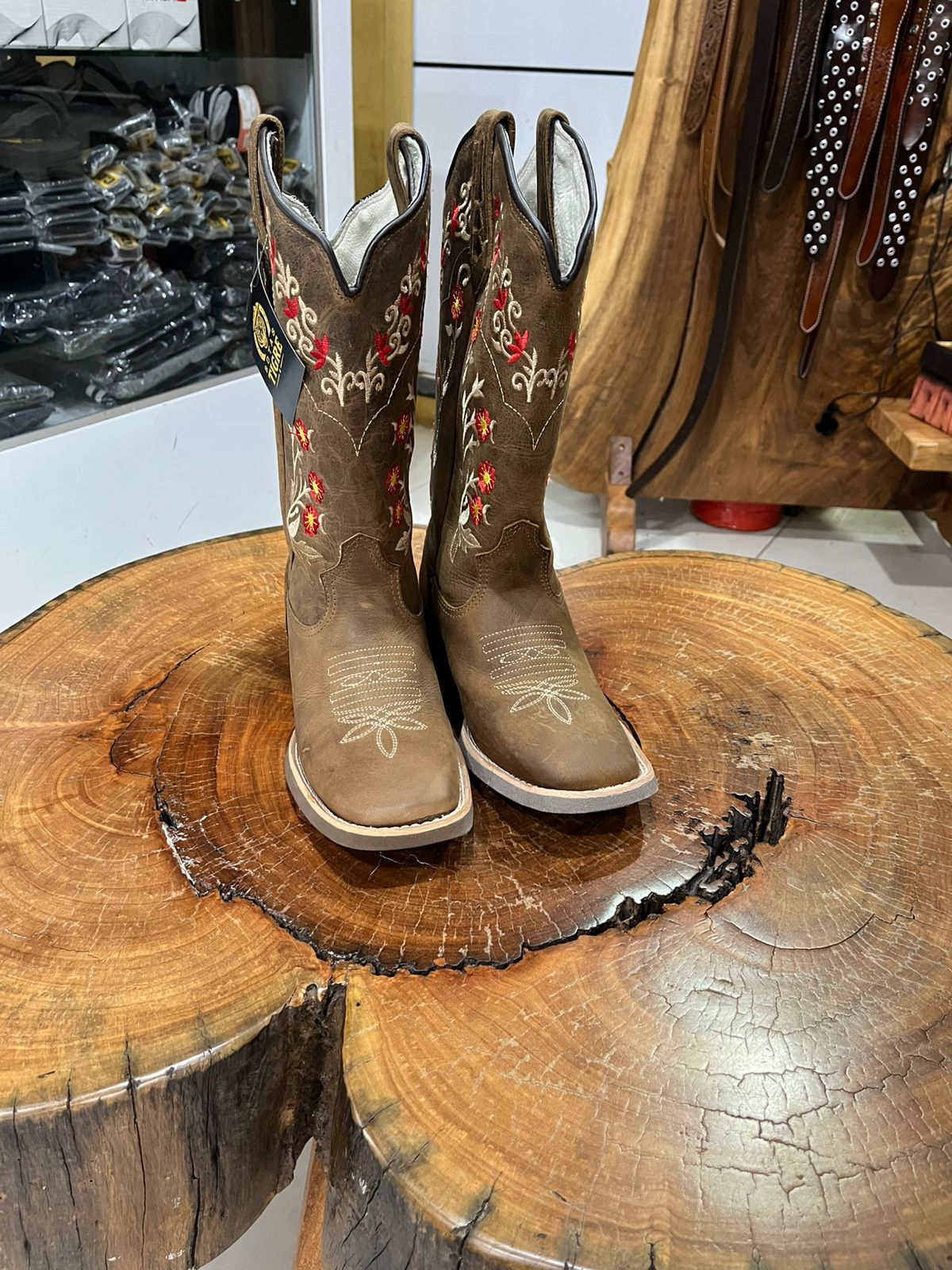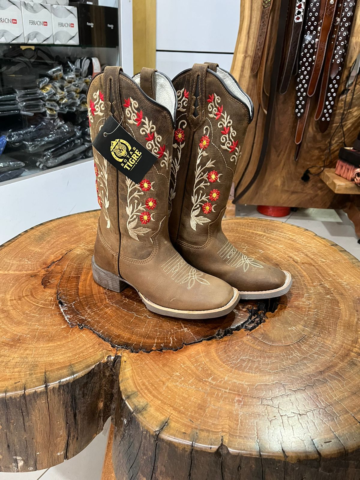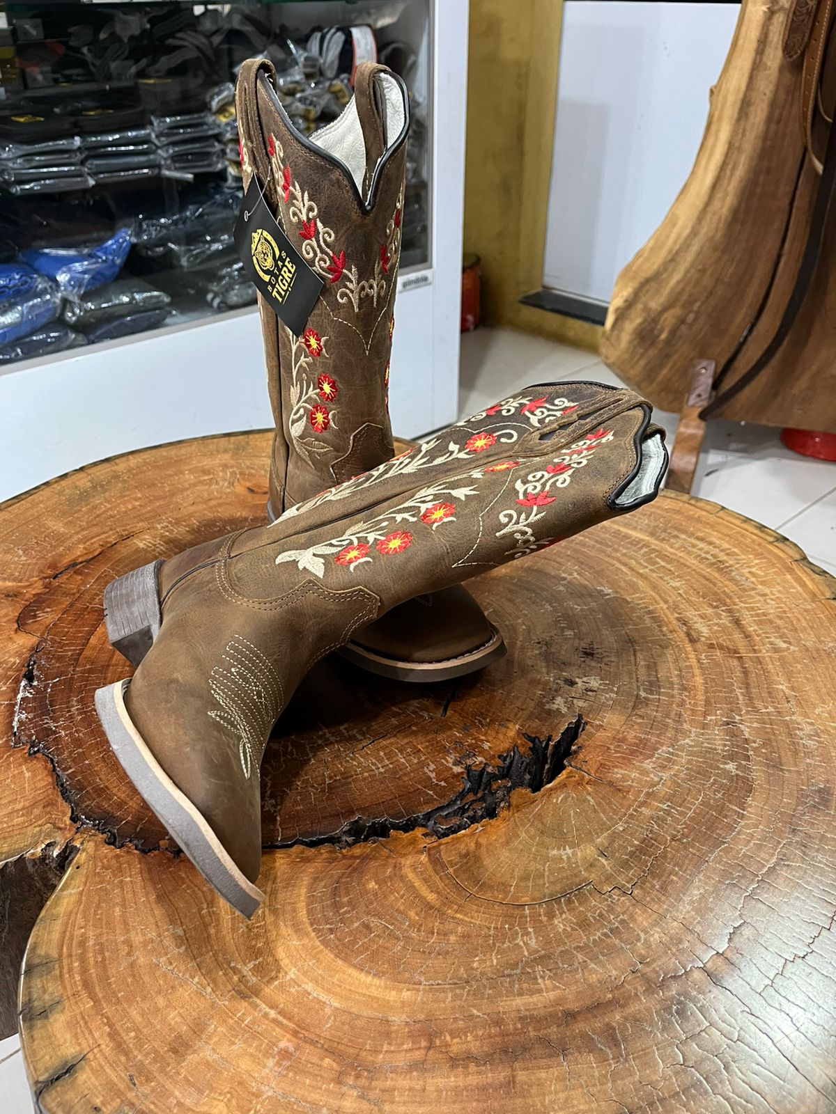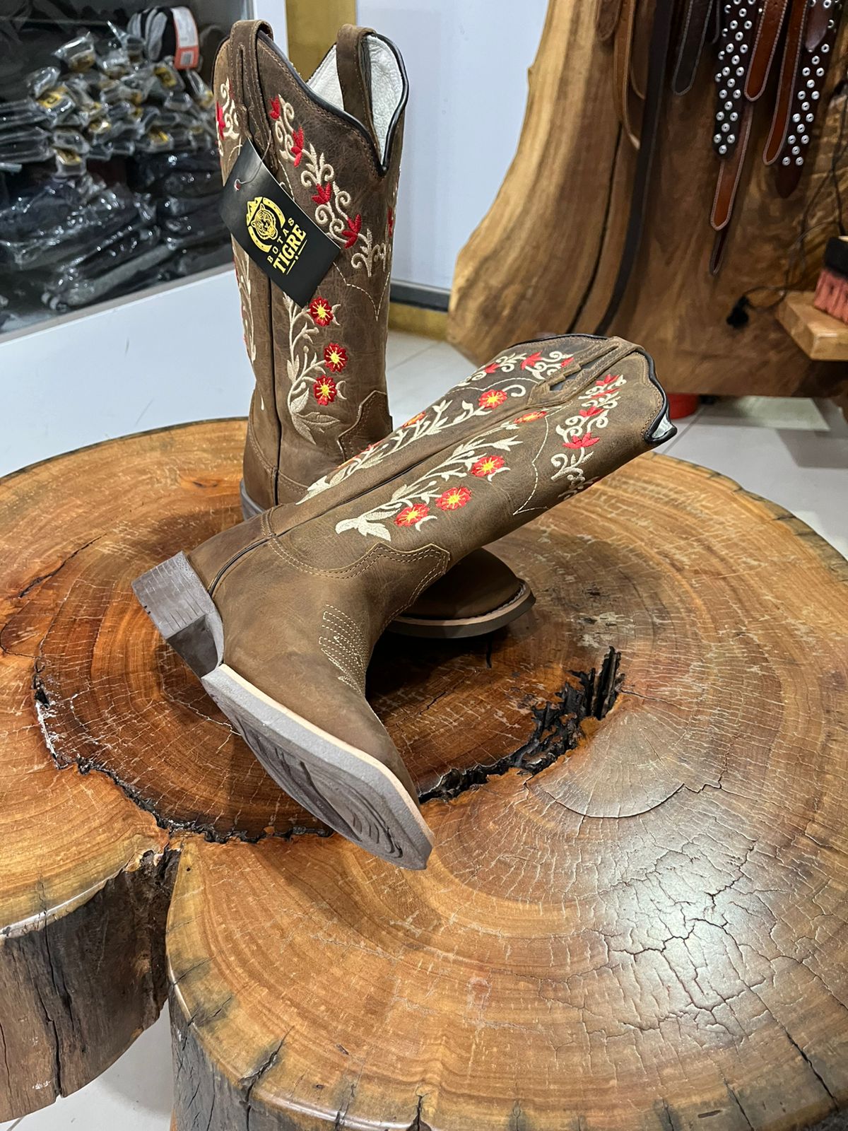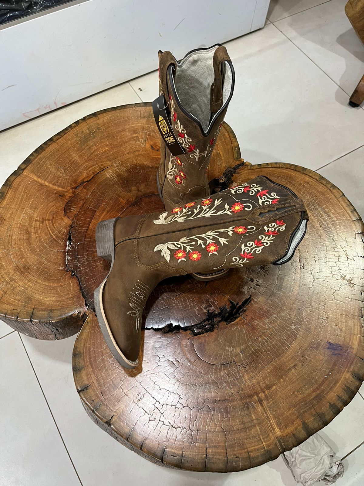 Traga a verdadeira essência do estilo country para o seu guarda-roupa com esta deslumbrante bota texana marrom da Botas Tigre. Com um acabamento rústico que esbanja autenticidade e atitude, o grande destaque deste modelo fica por conta do seu maravilhoso trabalho de bordado ao longo do cano. As vibrantes flores vermelhas, acentuadas por miolos amarelos, se entrelaçam com delicados ramos e folhas em tons claros, criando uma composição feminina, romântica e de muito destaque.