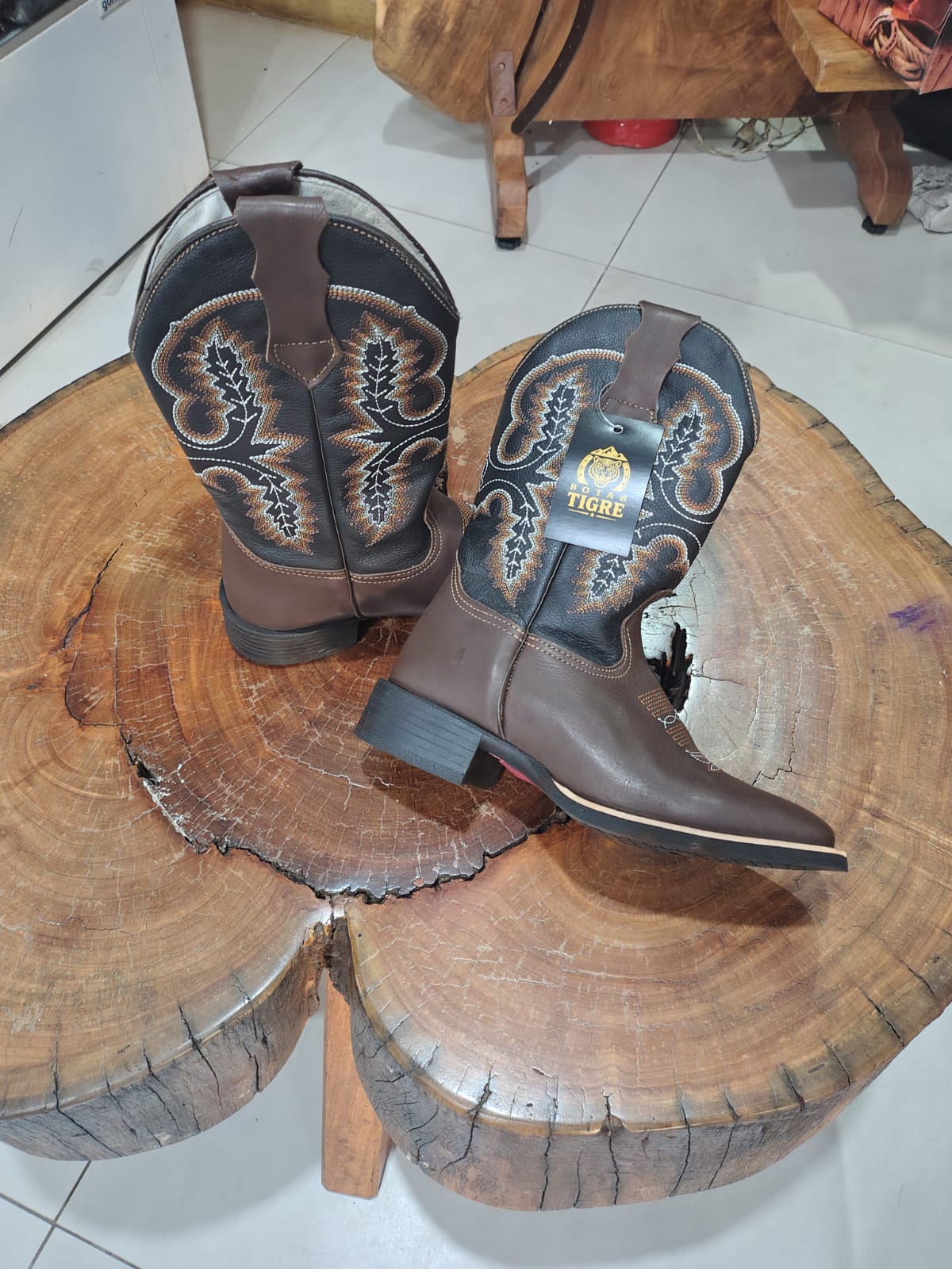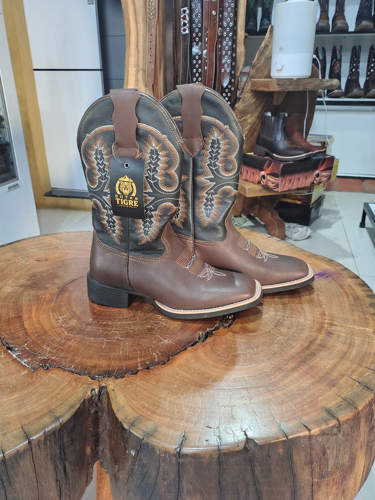 O modelo conta com o tradicional bico quadrado, oferecendo conforto e durabilidade para o uso intenso. Detalhes adicionais incluem bordados decorativos em linha clara no peito do pé e puxadores integrados em marrom que facilitam o calce. O solado preto de alta resistência é finalizado com uma vira em tom claro pespontada, garantindo um acabamento refinado e autêntico. É o calçado ideal para compor looks de personalidade em rodeios, exposições ou para o dia a dia no campo com máximo estilo.