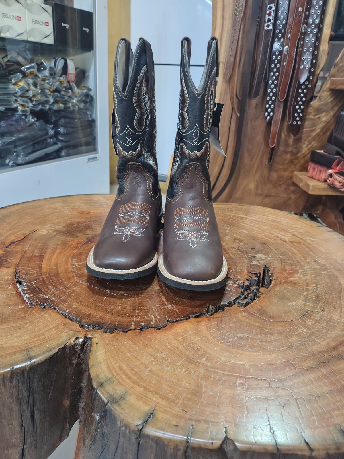 Bota Texana Marrom e Preta com Bordado Étnico Ocre