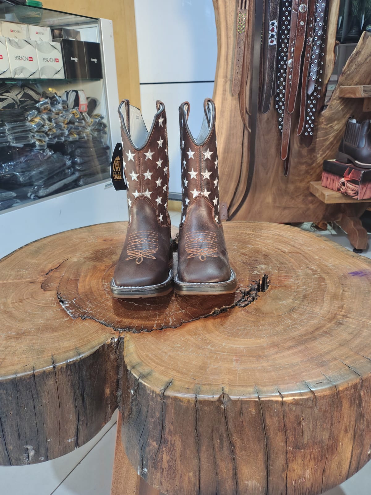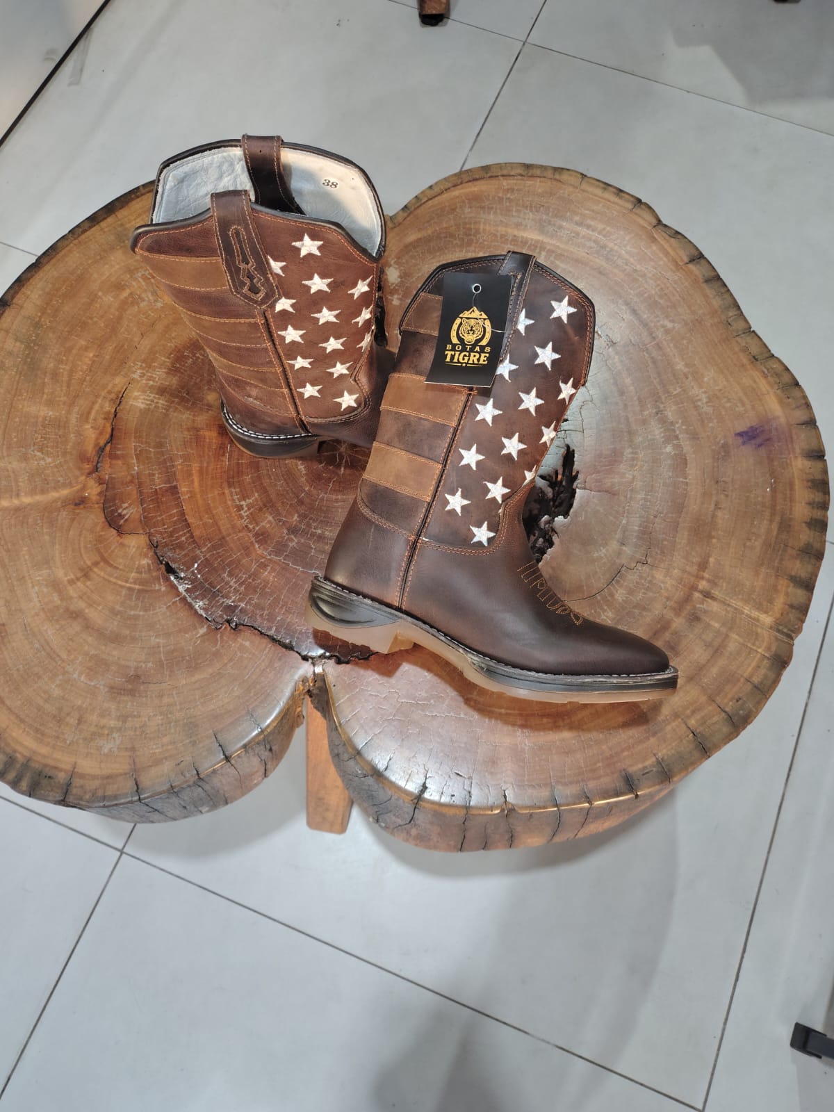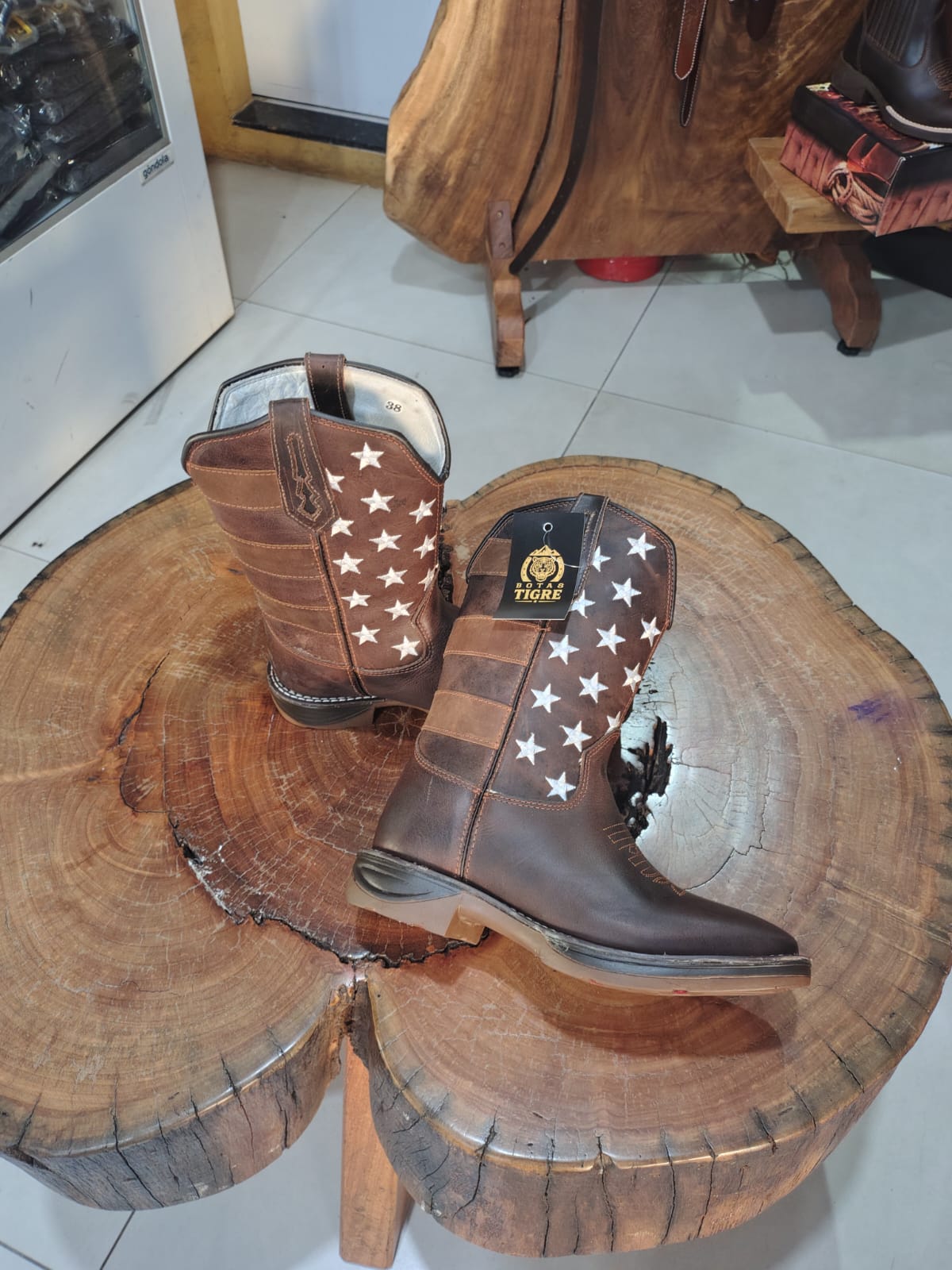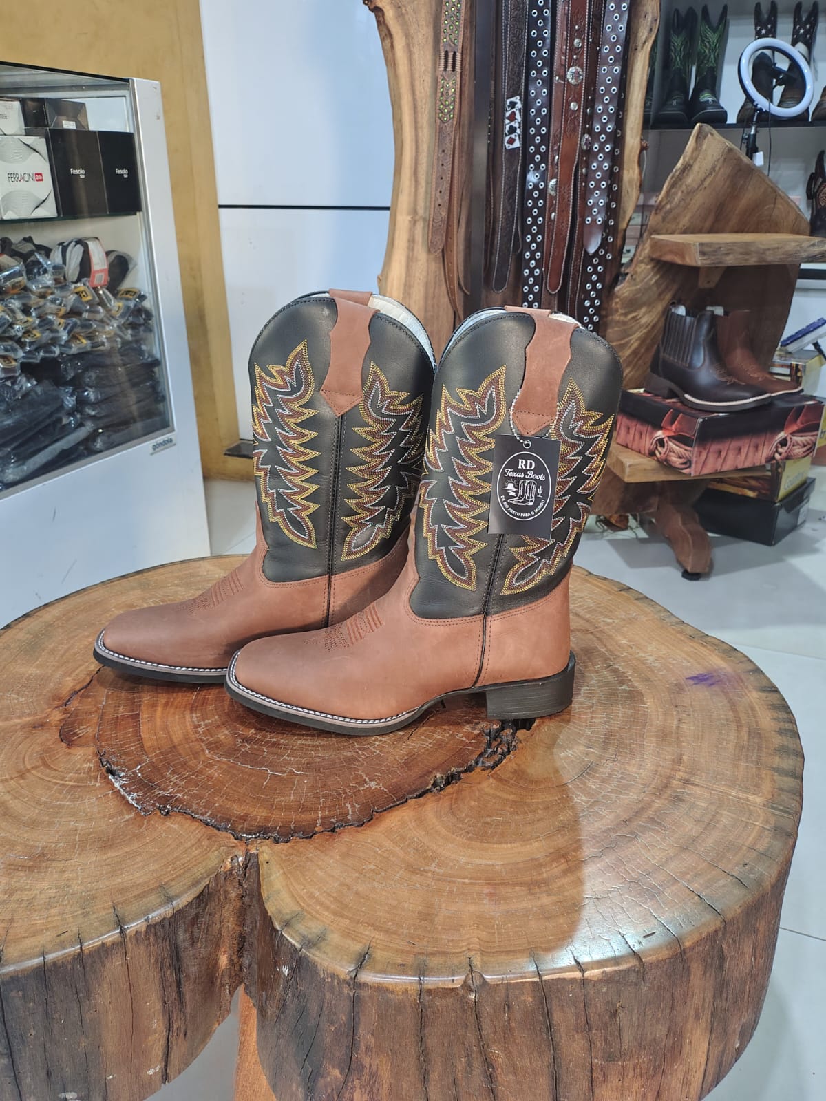 O grande diferencial visual desta peça reside no cano, que exibe um bordado em formato de asa estilizada com múltiplas camadas de cores. Utilizando linhas em tons de ocre, cinza e contornos em bordô, o bordado cria um efeito de profundidade e movimento. No peito do pé, pespontos decorativos discretos em linha ocre complementam o estilo western. O modelo possui bico quadrado para máximo conforto, puxadores superiores integrados em tom caramelo que facilitam o calce e solado de borracha preto com vira clara pespontada, garantindo durabilidade e estabilidade para o dia a dia no campo ou eventos sertanejos.