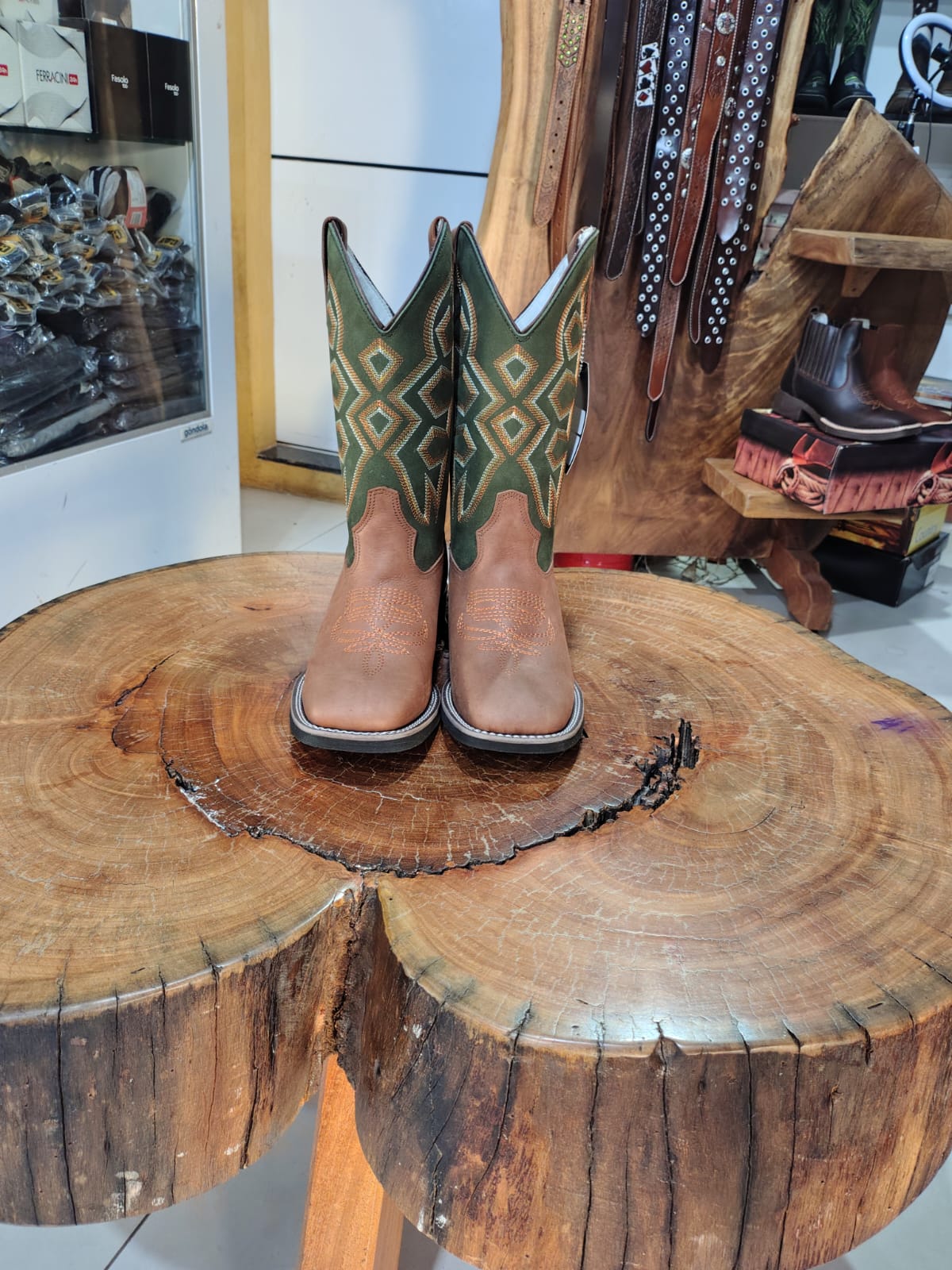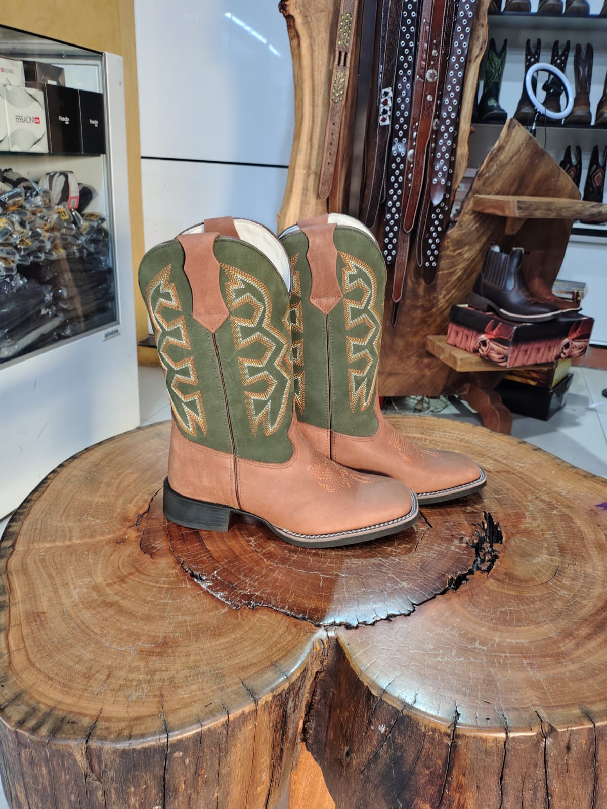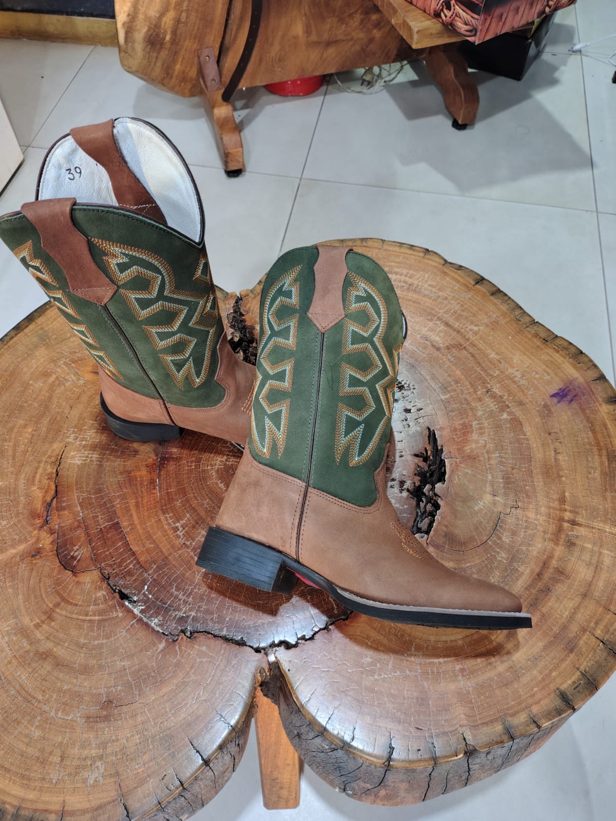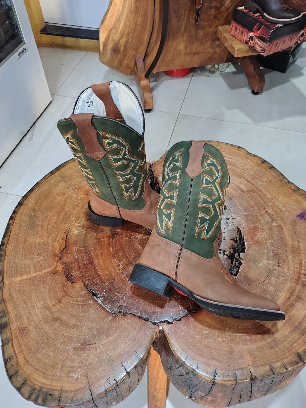 Esta bota de cano alto é uma escolha distinta para quem busca fugir do tradicional sem abrir mão da elegância rústica. O design bicolor combina perfeitamente o pé em tom caramelo suave com um cano alto em verde musgo, criando um visual harmônico que remete às cores da natureza. O cano apresenta uma textura aveludada que serve de base para bordados geométricos western em linha ocre e cinza, proporcionando um acabamento detalhado e de alta qualidade.