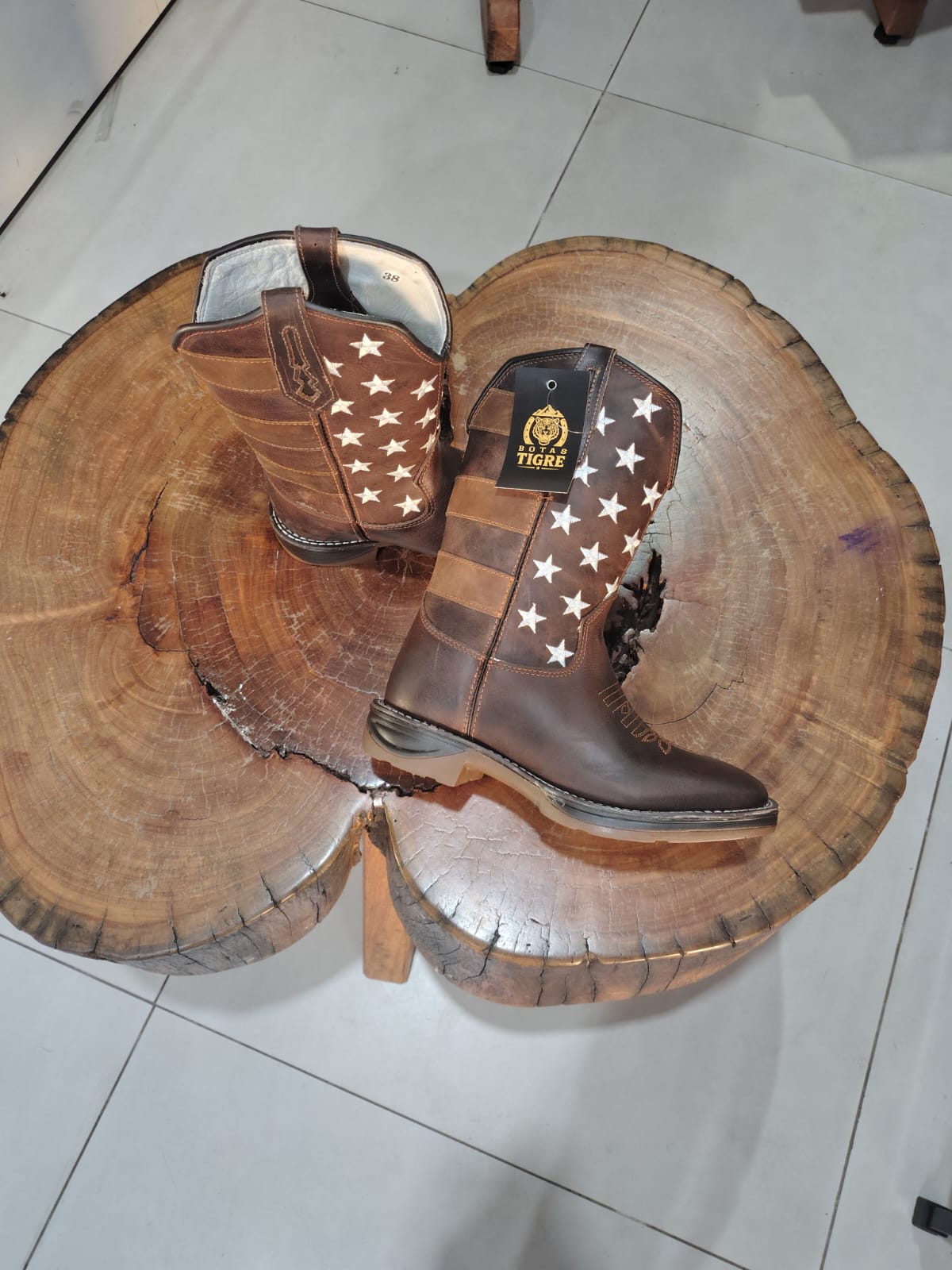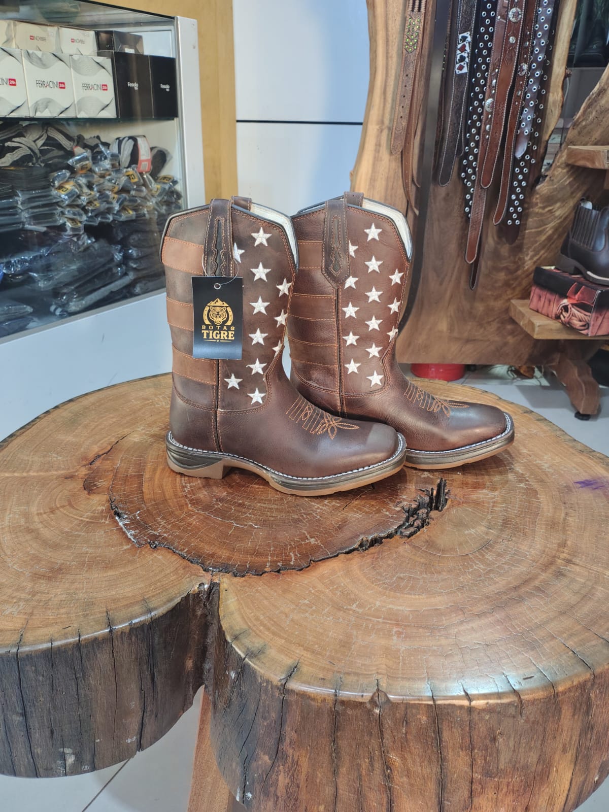 Esta bota masculina é ideal para quem busca um visual country com forte influência do estilo western. Confeccionada em couro marrom café com acabamento rústico, o modelo traz uma interpretação elegante da bandeira dos EUA. O cano alto é dividido em duas partes: a frontal exibe diversas estrelas brancas bordadas em destaque, enquanto a parte traseira apresenta listras horizontais em relevo, criando uma peça com muita personalidade e textura.