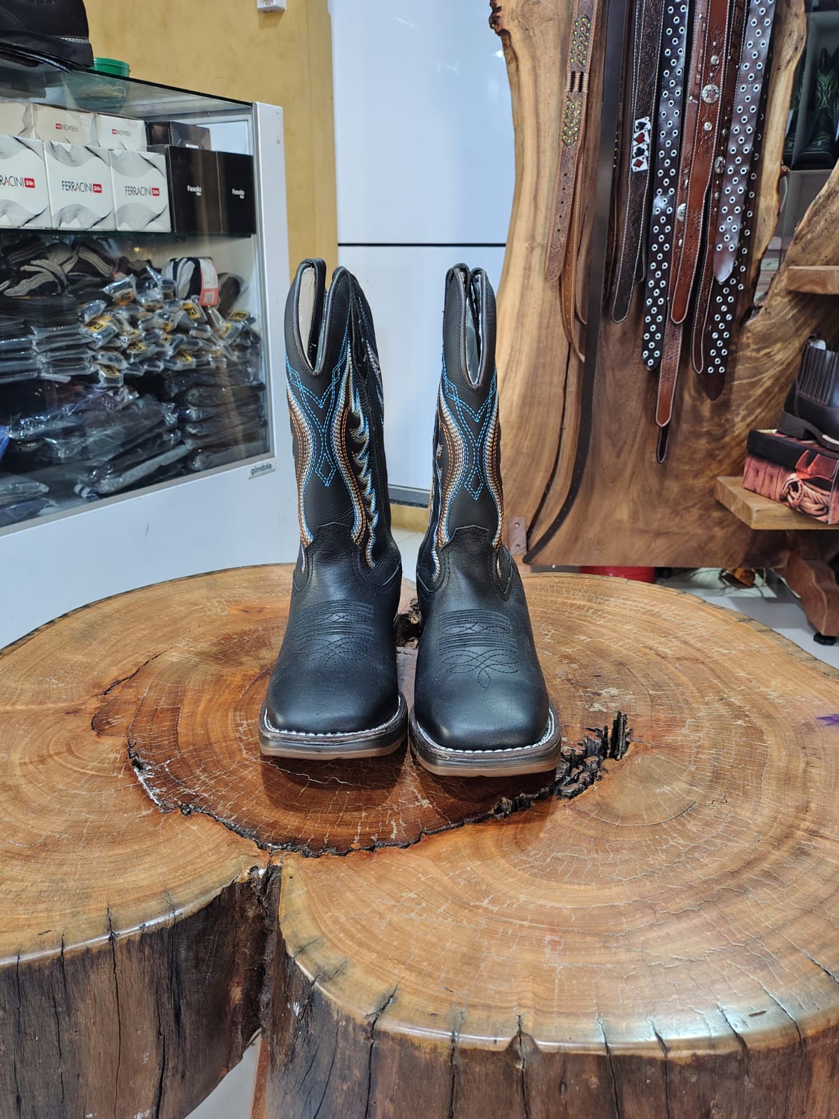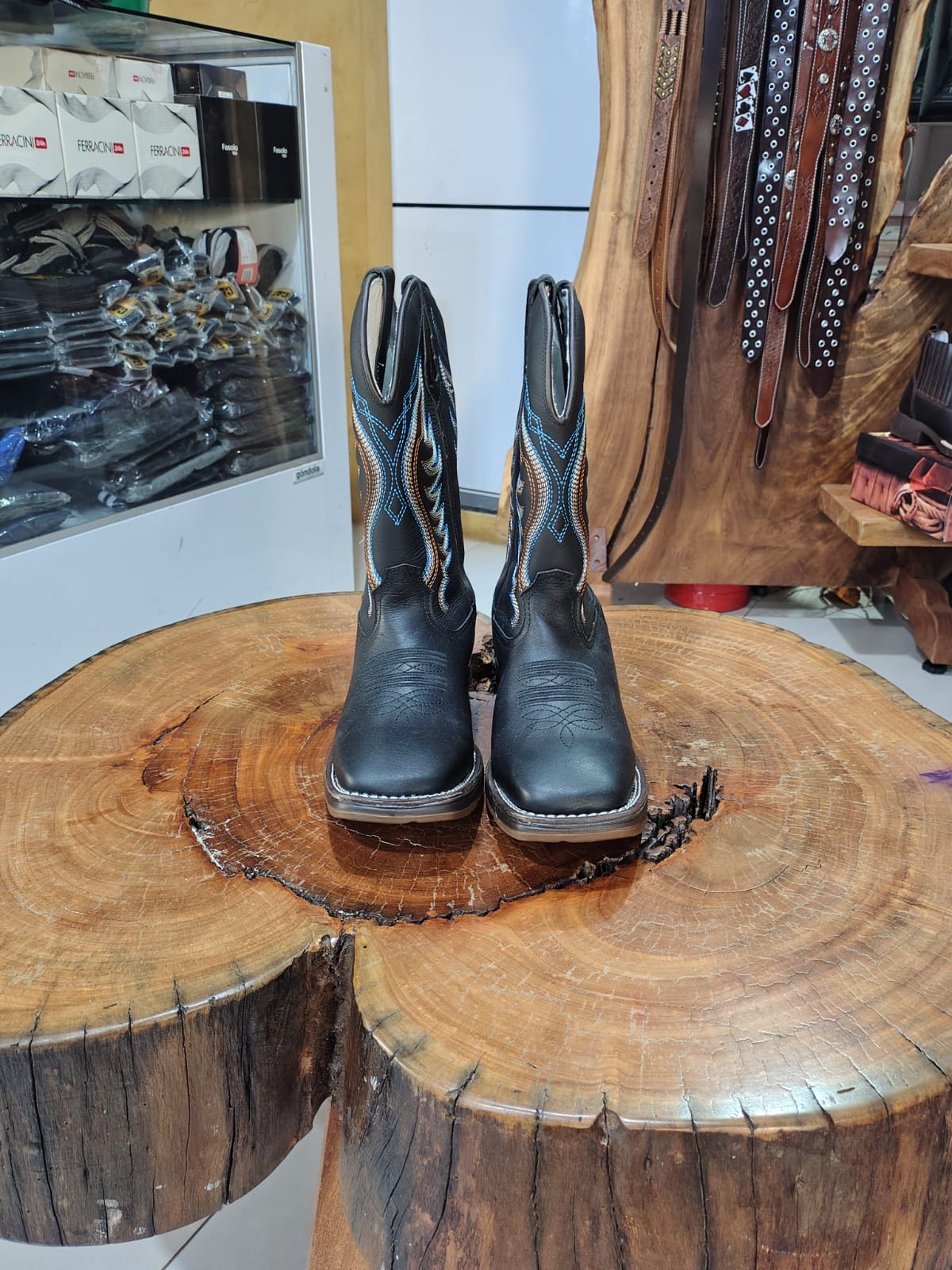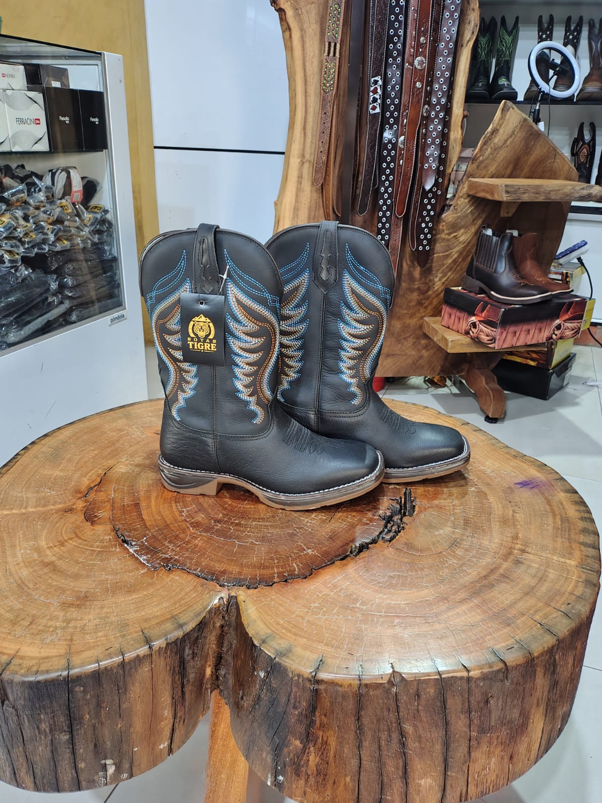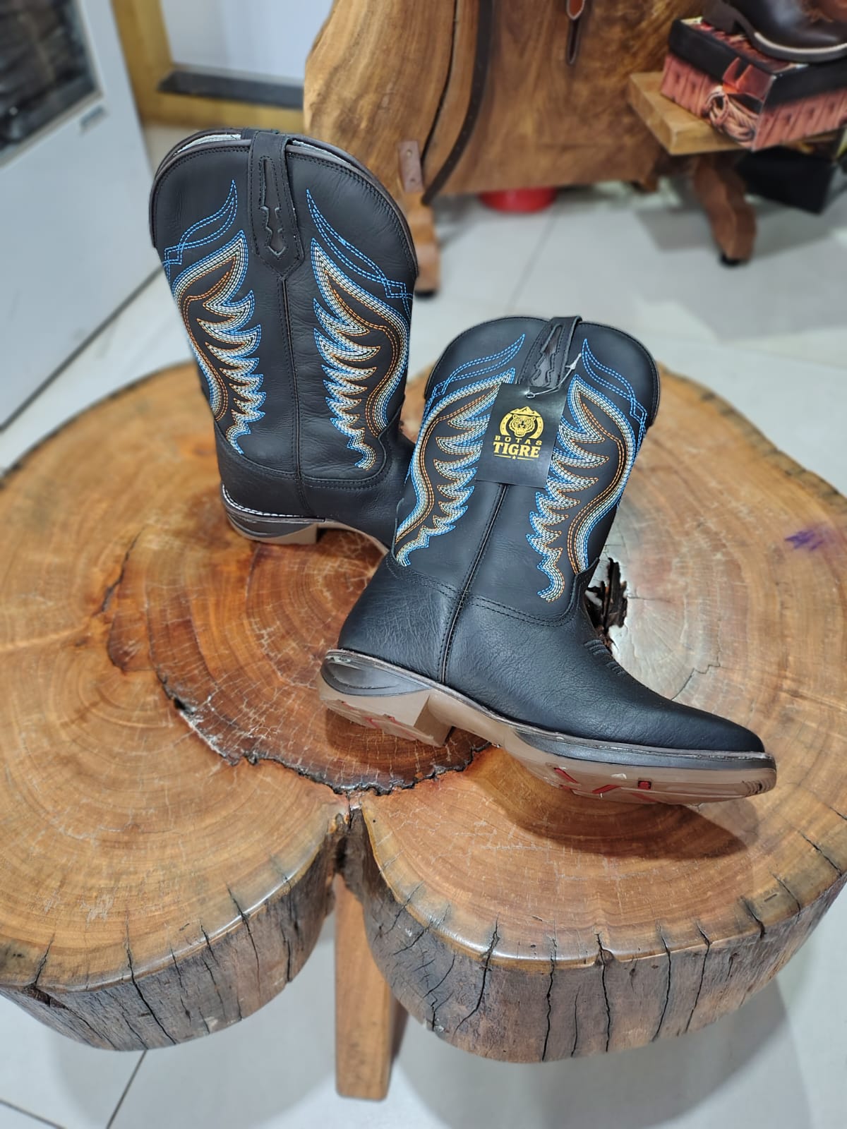 Esta bota de cano alto é a escolha ideal para quem busca um visual country moderno, com personalidade e atitude. Confeccionada na cor preta com acabamento fosco, o modelo serve como base para um trabalho de bordado tecnológico e de alto impacto visual. O grande diferencial desta peça está no cano, que exibe um bordado em formato de asa estilizada em tons de azul vibrante e ocre, criando um contraste marcante e contemporâneo.