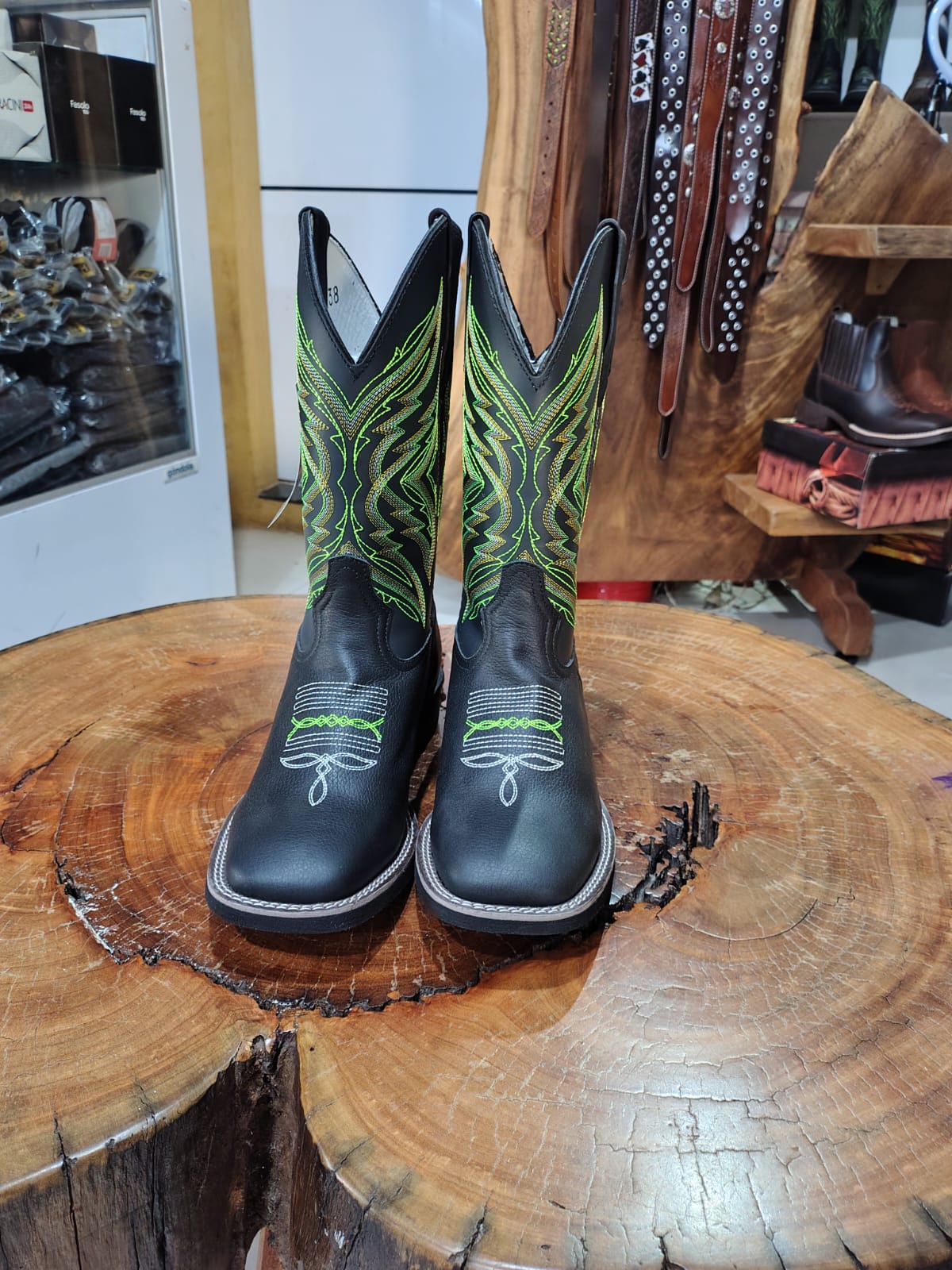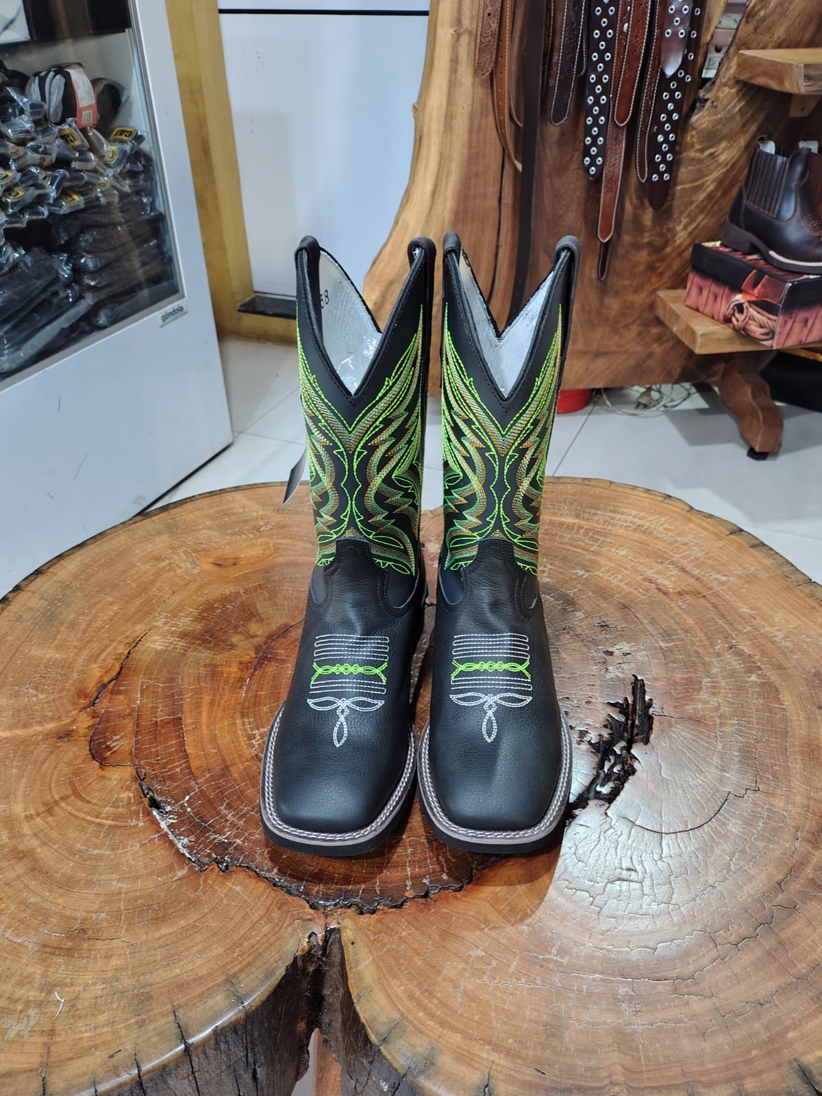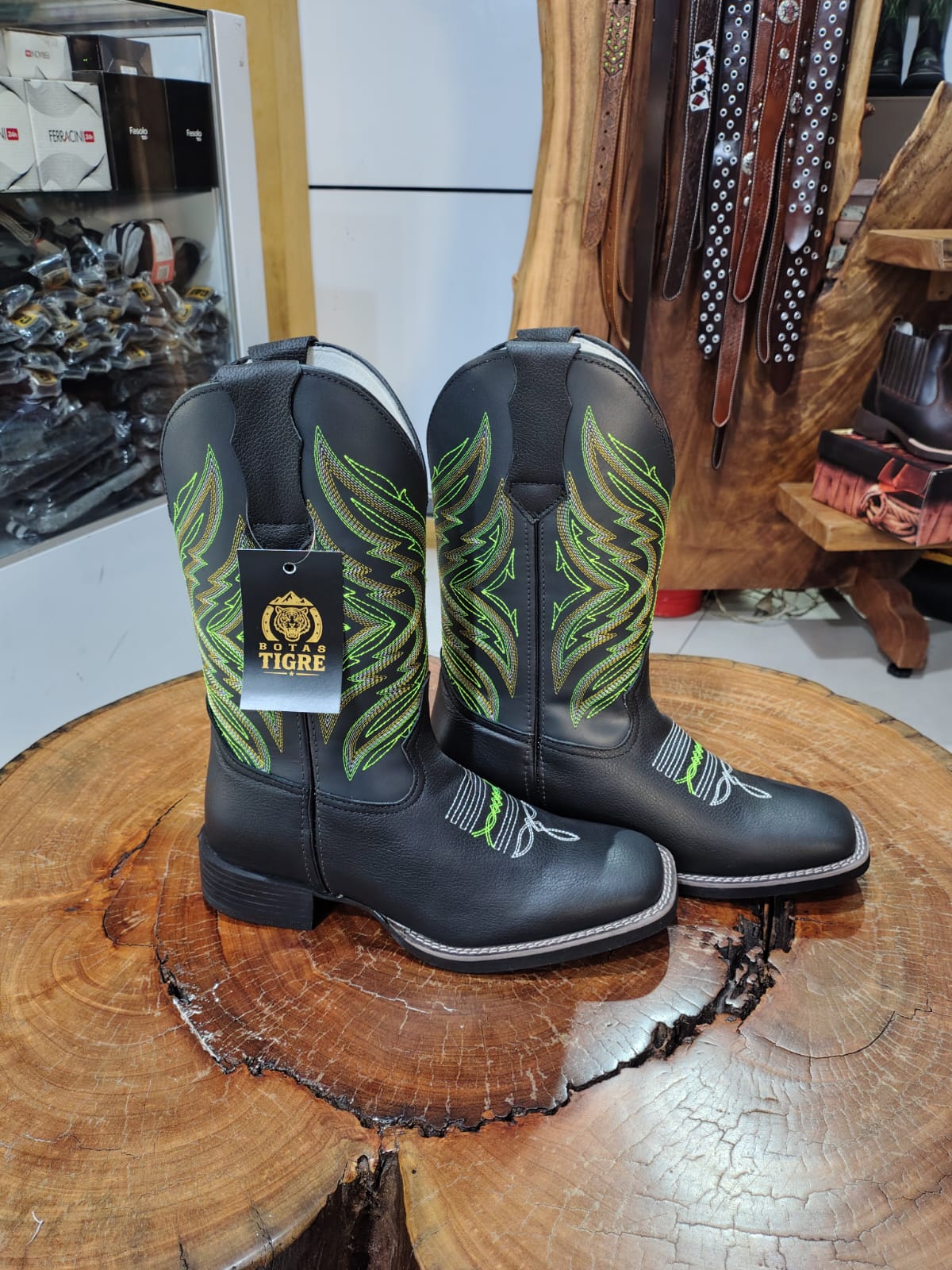 O design conta com o tradicional bico quadrado, garantindo conforto e a robustez necessária para o uso prolongado. No peito do pé, bordados adicionais em linha branca e verde neon reforçam a identidade visual da peça. Para facilitar o calce, a bota possui puxadores laterais integrados. O solado preto de alta durabilidade apresenta uma vira clara pespontada, proporcionando um acabamento refinado e resistente. É o calçado ideal para se destacar em rodeios, festas de peão e eventos do universo sertanejo.