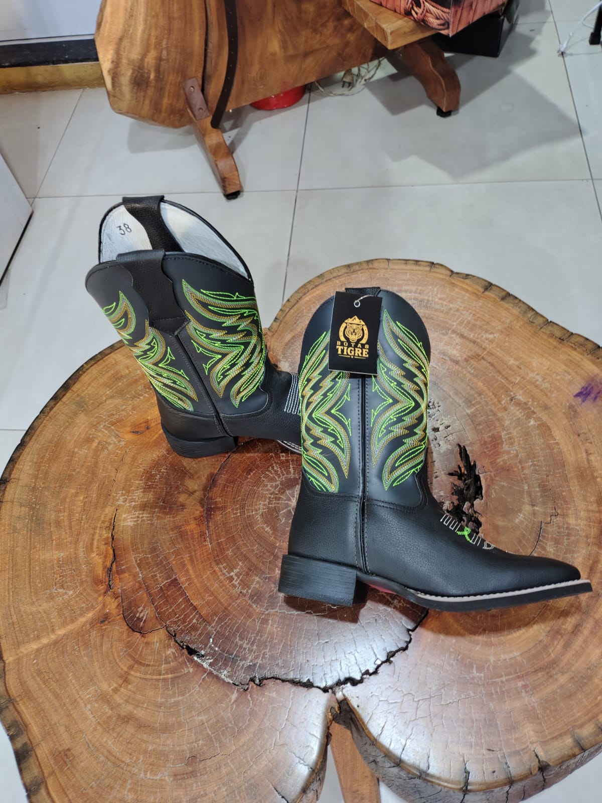 Esta bota de cano alto é a escolha perfeita para quem busca um visual country moderno e de alto impacto. Confeccionada na cor preta com acabamento fosco, o modelo serve como base para um trabalho de bordado tecnológico e vibrante. O cano é ricamente decorado com padrões geométricos em linha verde e ocre, criando um efeito visual dinâmico e contemporâneo.