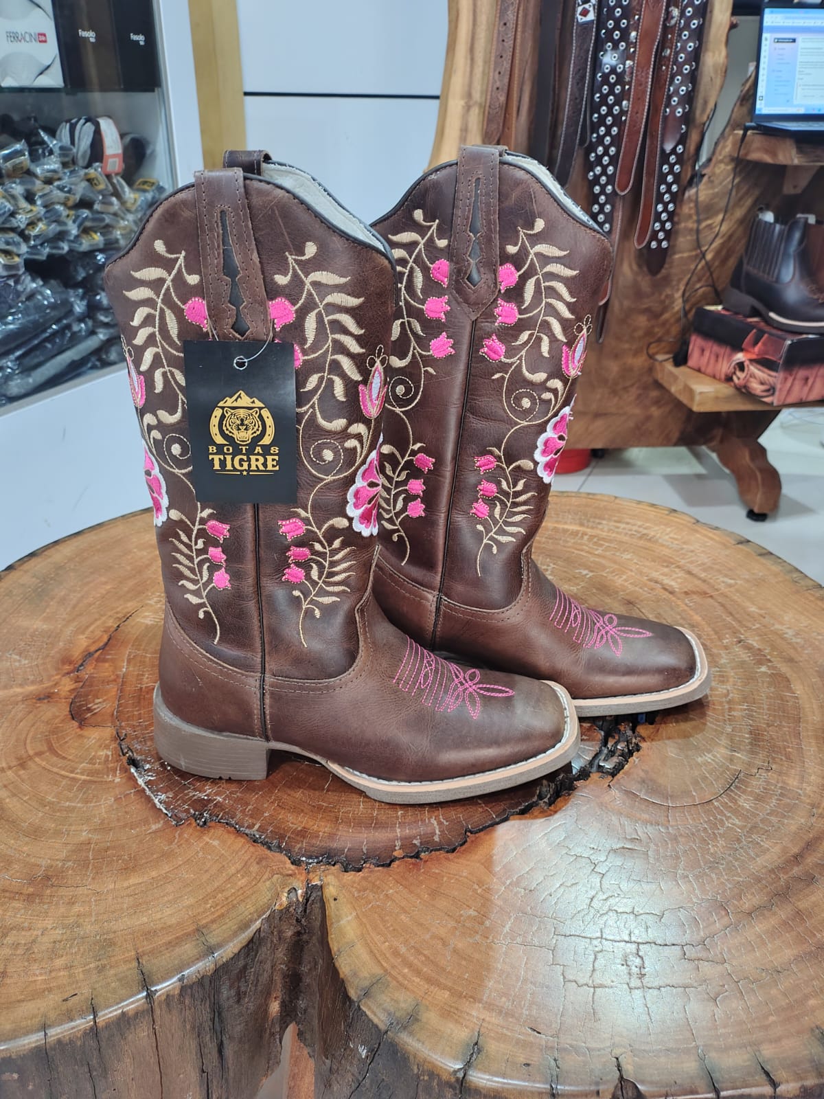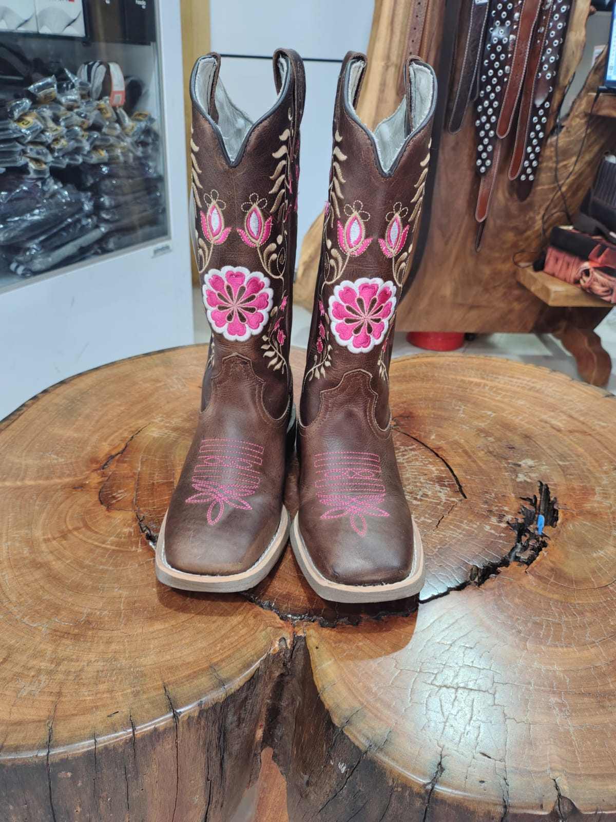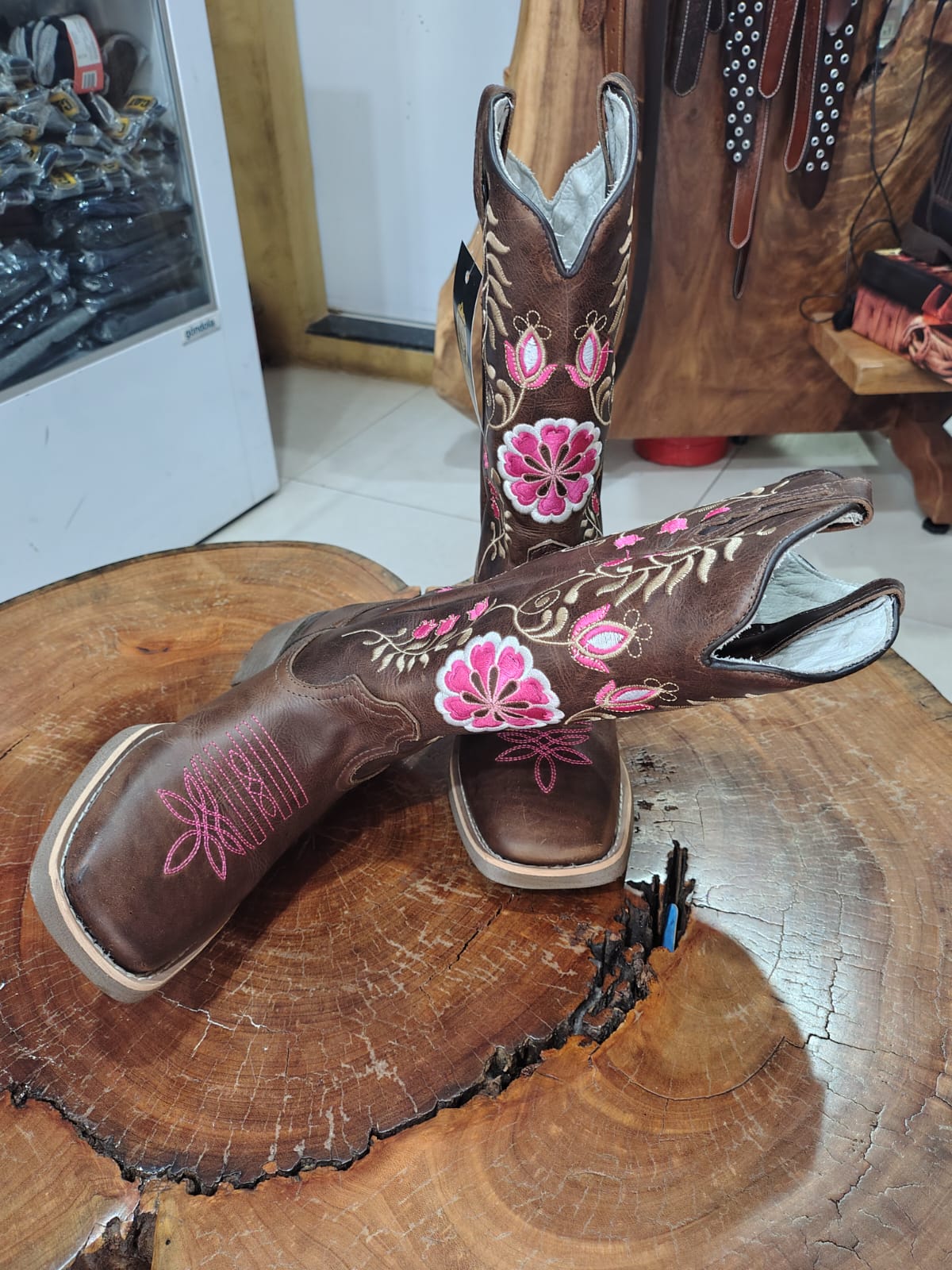 Adicione muito mais estilo e personalidade ao seu visual country com esta belíssima bota texana marrom de bico quadrado. O grande diferencial desta peça é o seu trabalho detalhado de bordado no cano, que exibe um lindo desenho floral com flores e botões vibrantes em tons de rosa e branco, perfeitamente harmonizados com ramos em cores mais claras.