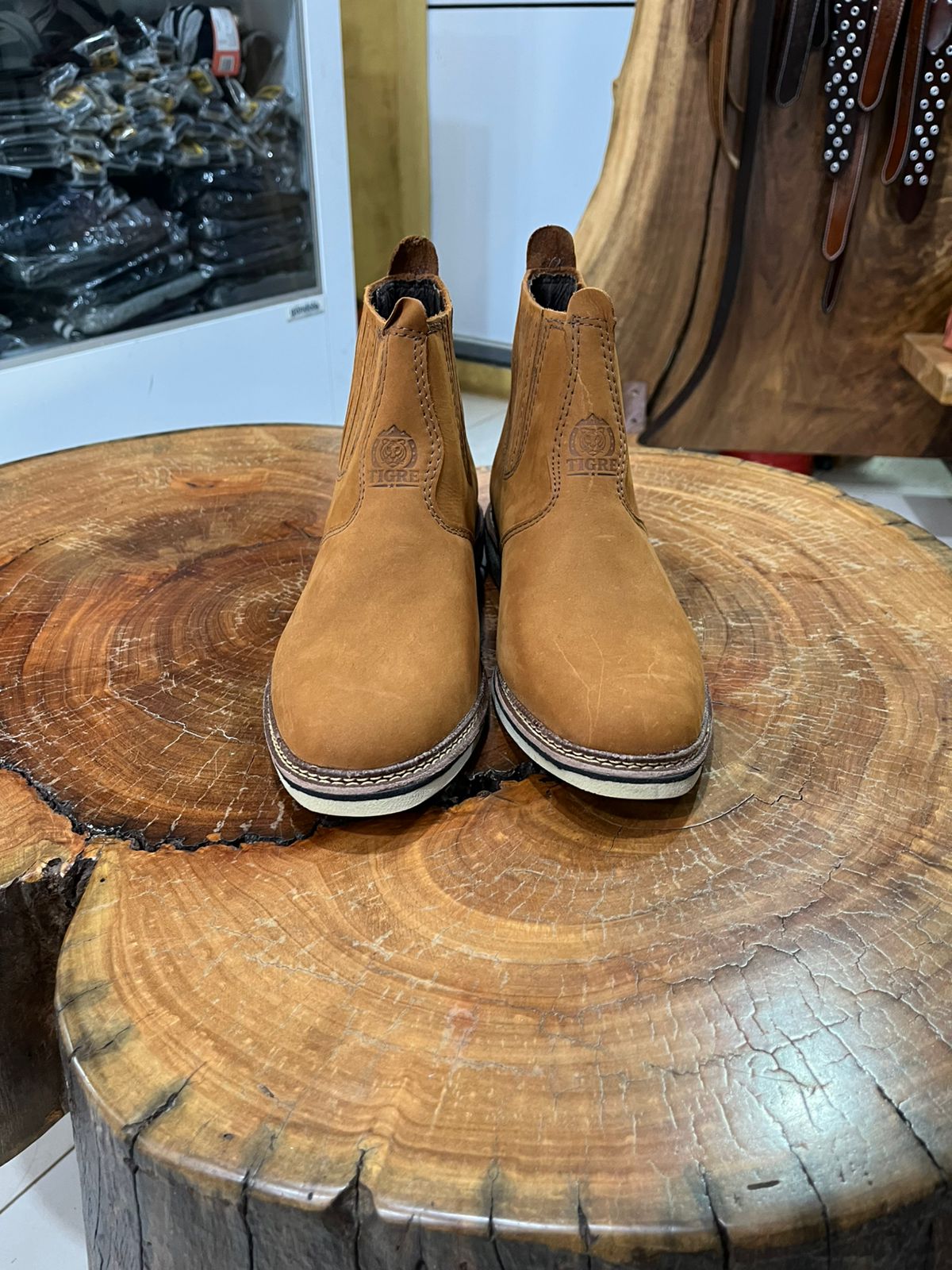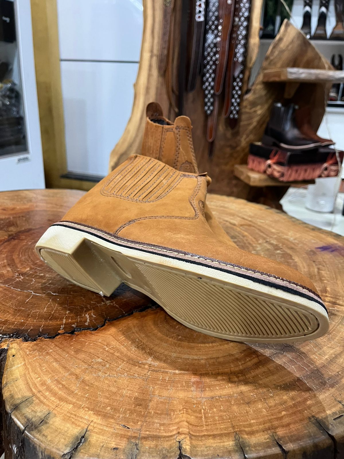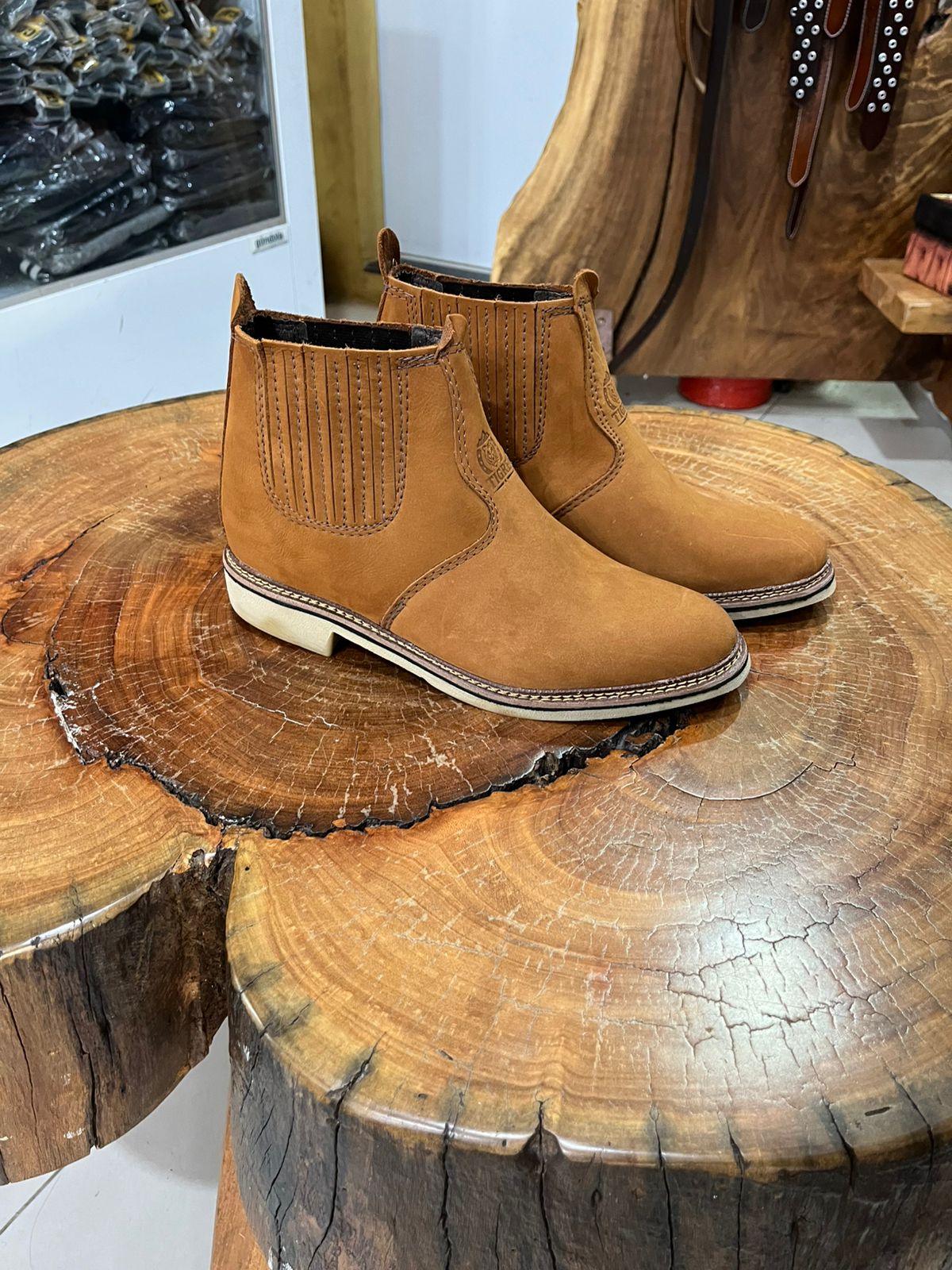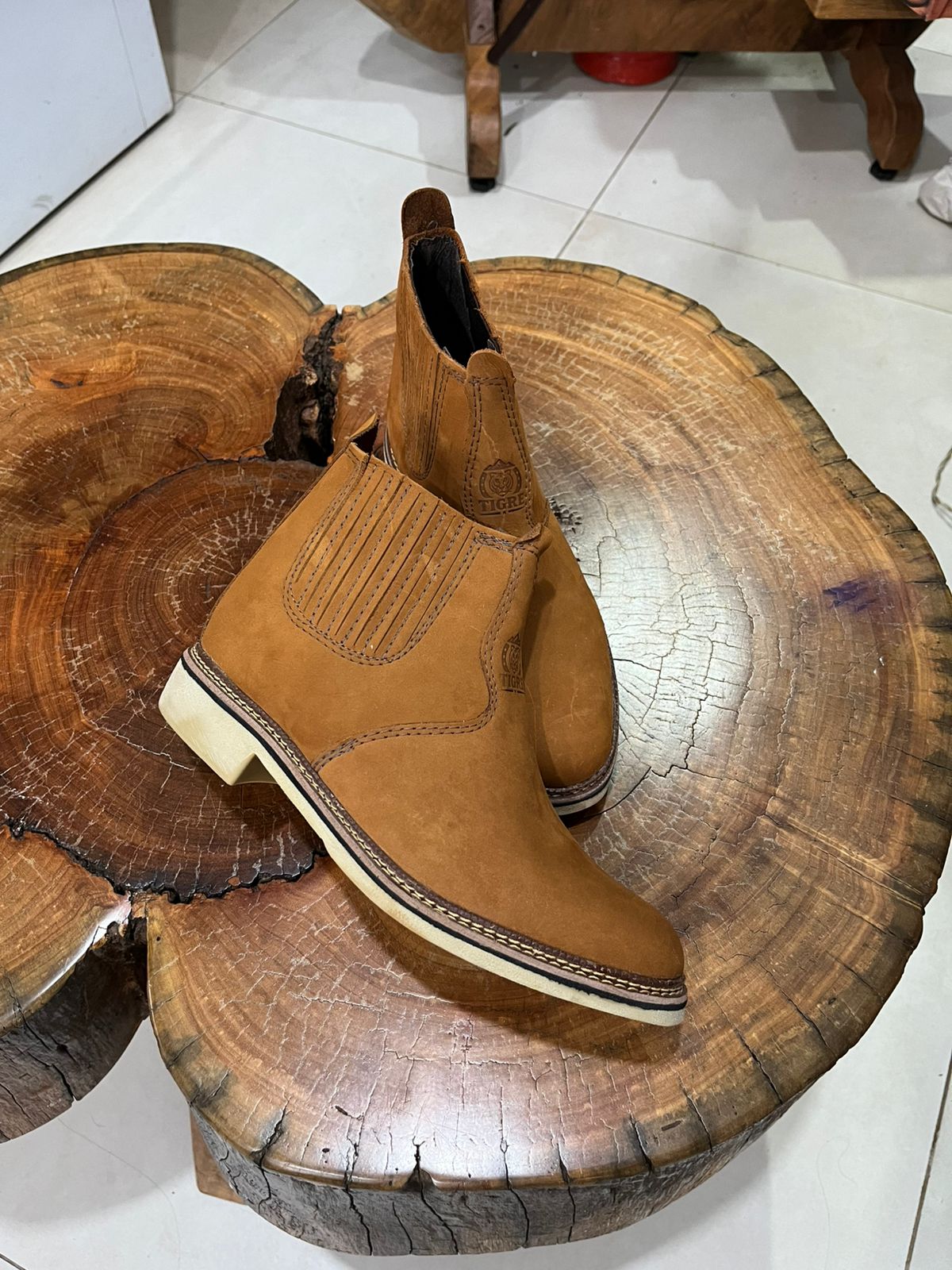 O design conta com amplos painéis de elástico nas laterais em um tom de marrom contrastante, facilitando o calce e garantindo que a botina se molde perfeitamente ao tornozelo. Um detalhe de refinamento é a costura escura aparente na vira do solado, que reforça a estrutura e adiciona um charme artesanal à peça. O solado em tom bege claro completa o visual, proporcionando leveza estética e excelente durabilidade. É uma botina prática e resistente, indispensável para compor looks sertanejos autênticos ou produções casuais com jeans.