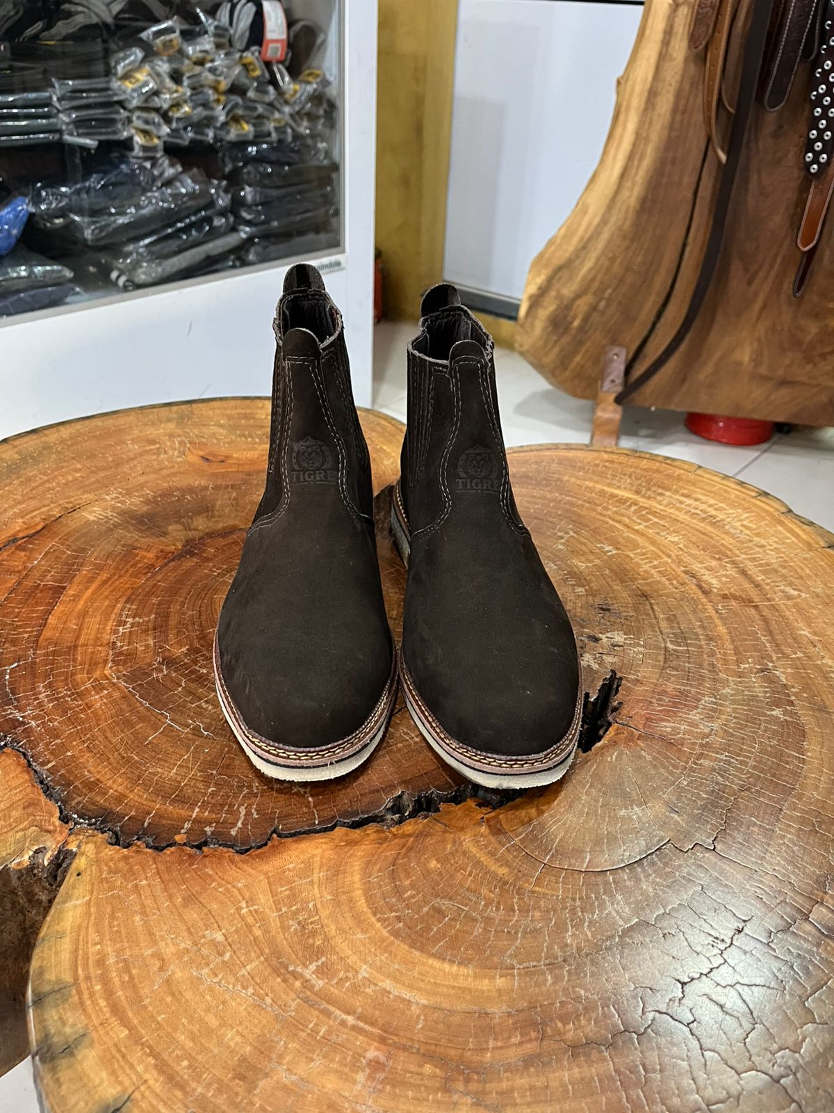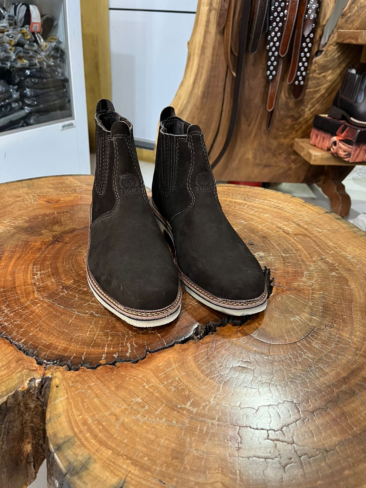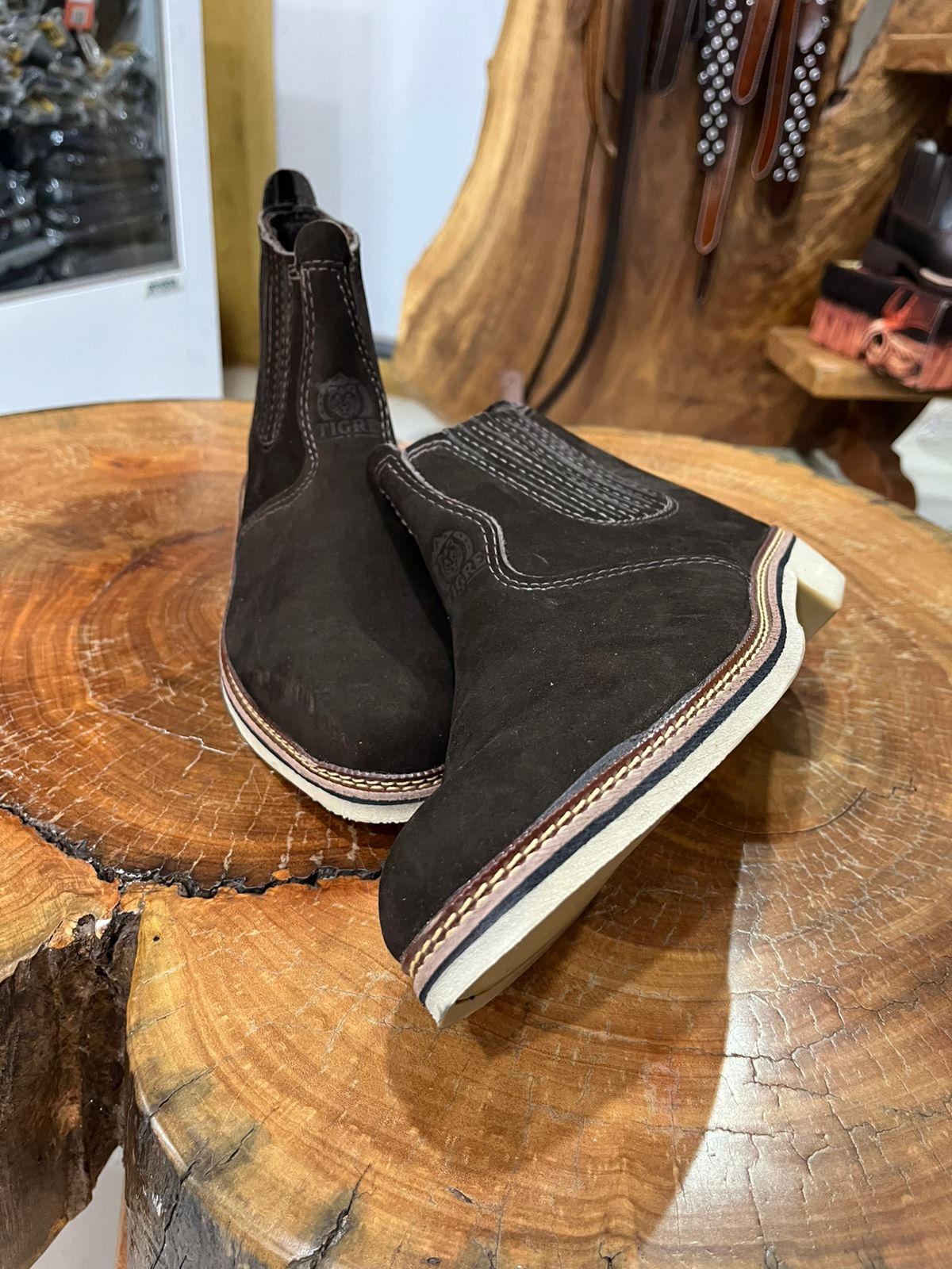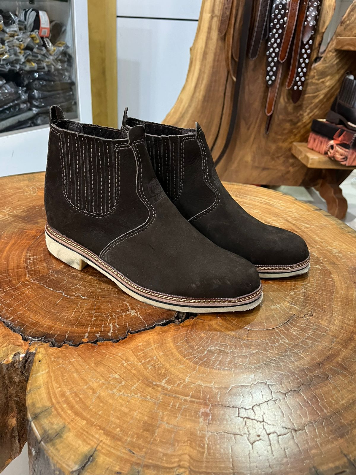 O modelo possui painéis de elástico nas laterais reforçados por costuras verticais, garantindo um ajuste seguro e facilitando o calce. Um diferencial marcante é o contraste entre o cabedal escuro e o solado claro, que recebe uma vira pespontada com linha em tom claro, reforçando o acabamento artesanal e a durabilidade da peça. Equipada com puxador traseiro para maior praticidade, esta botina une a essência rústica com um toque de elegância discreta, sendo um item duradouro para qualquer guarda-roupa sertanejo.