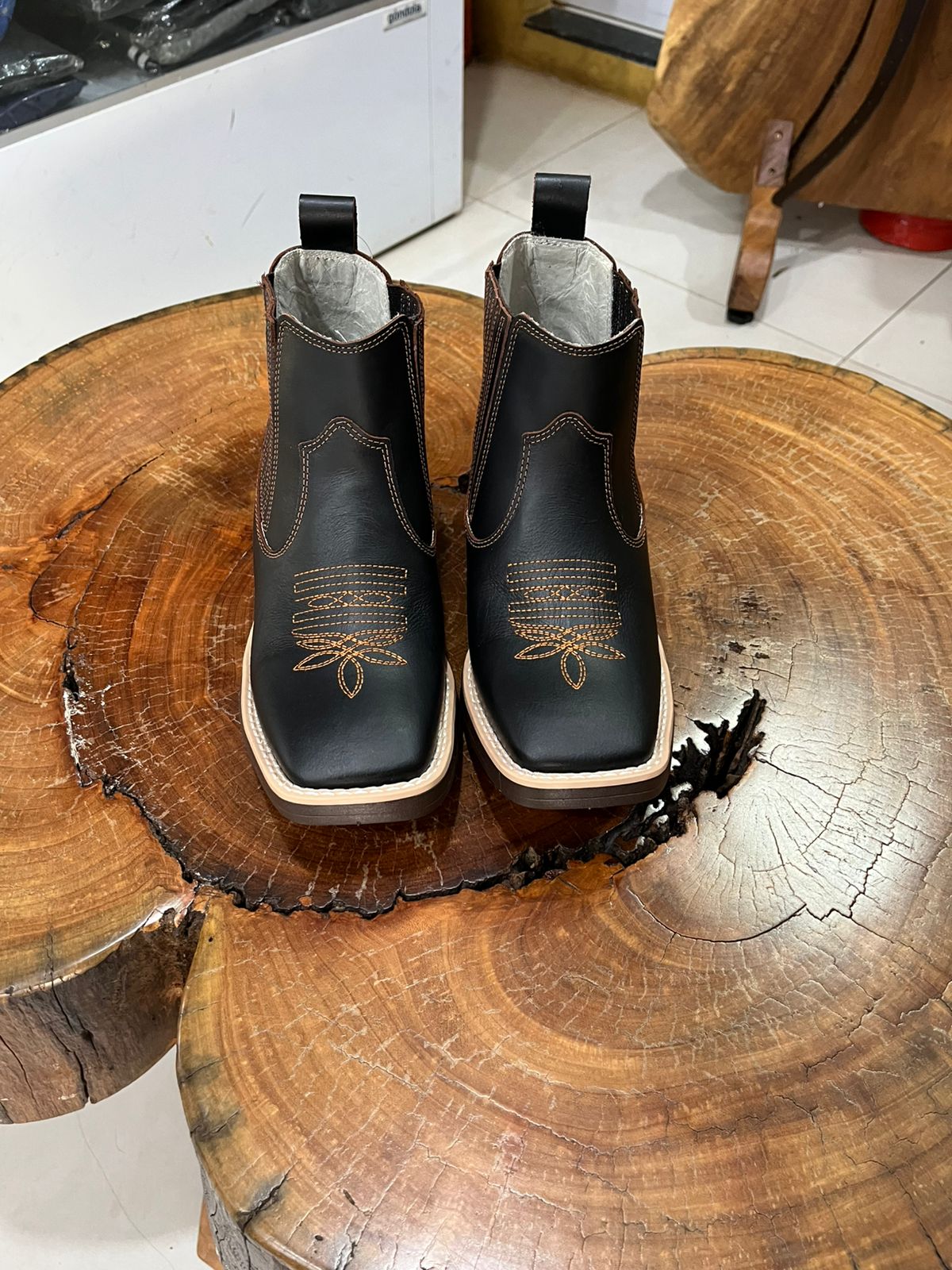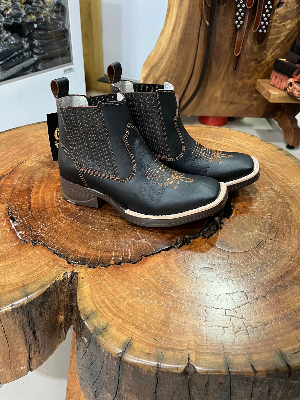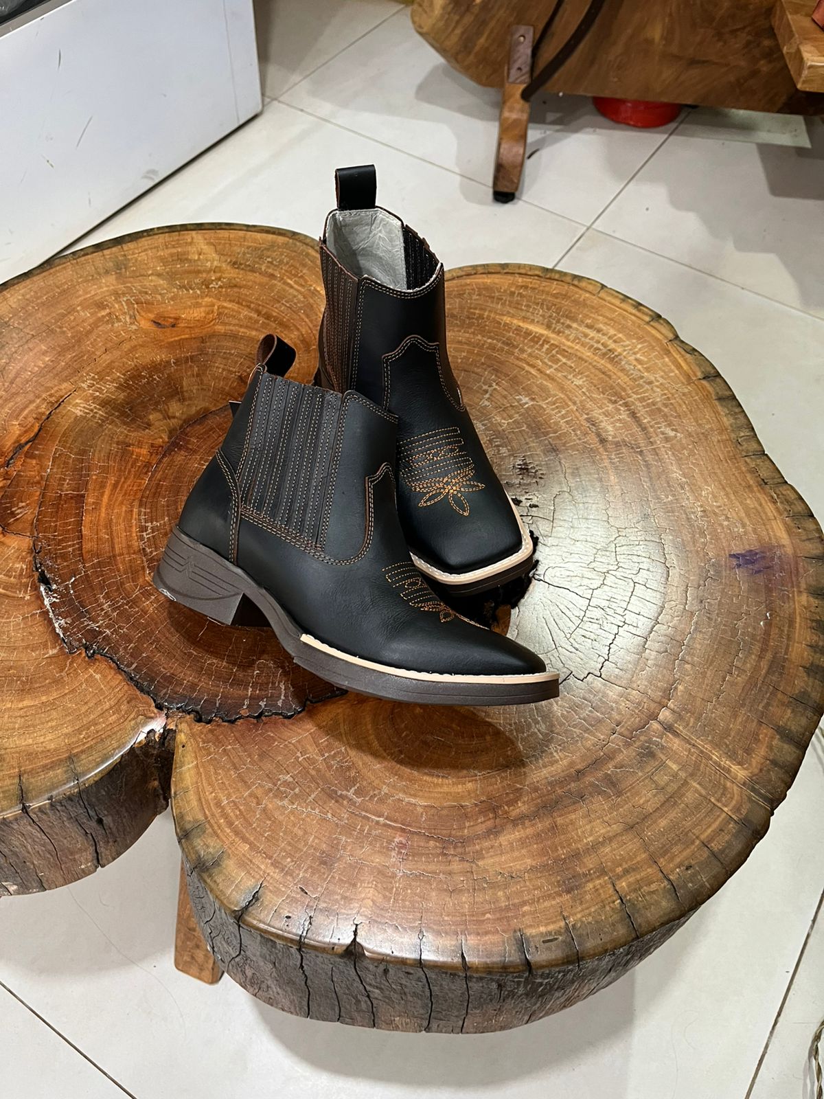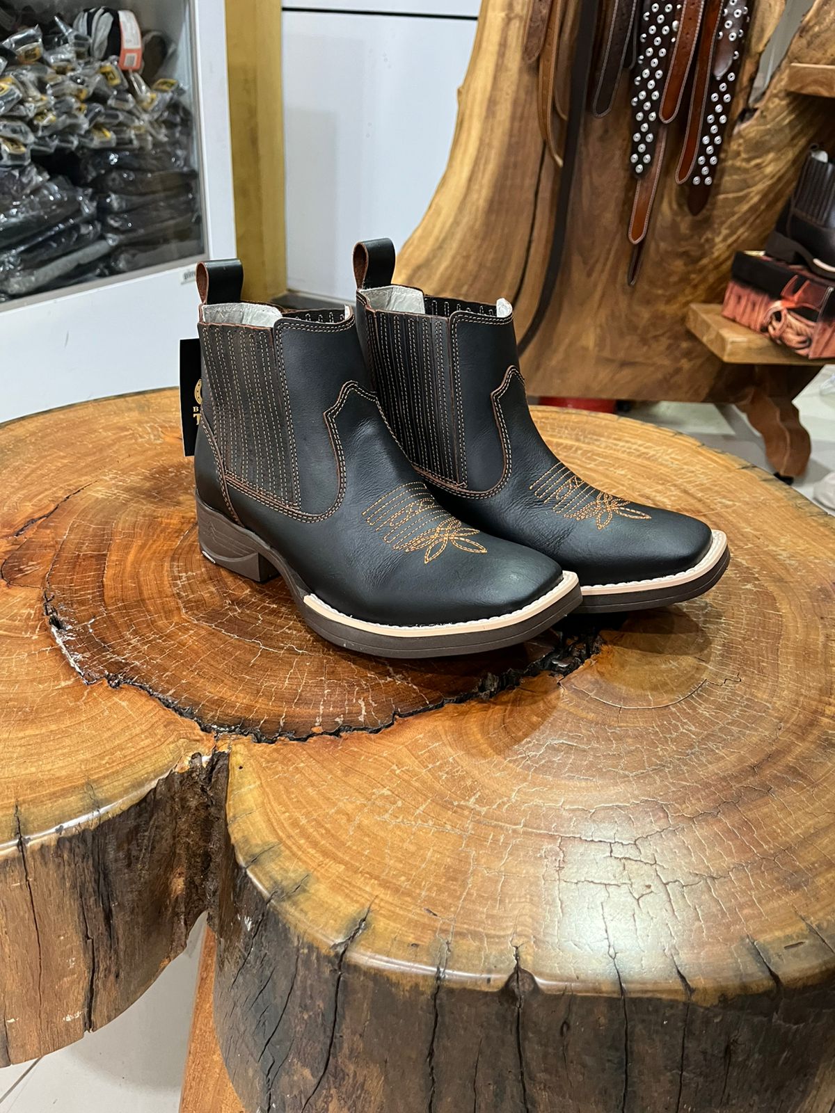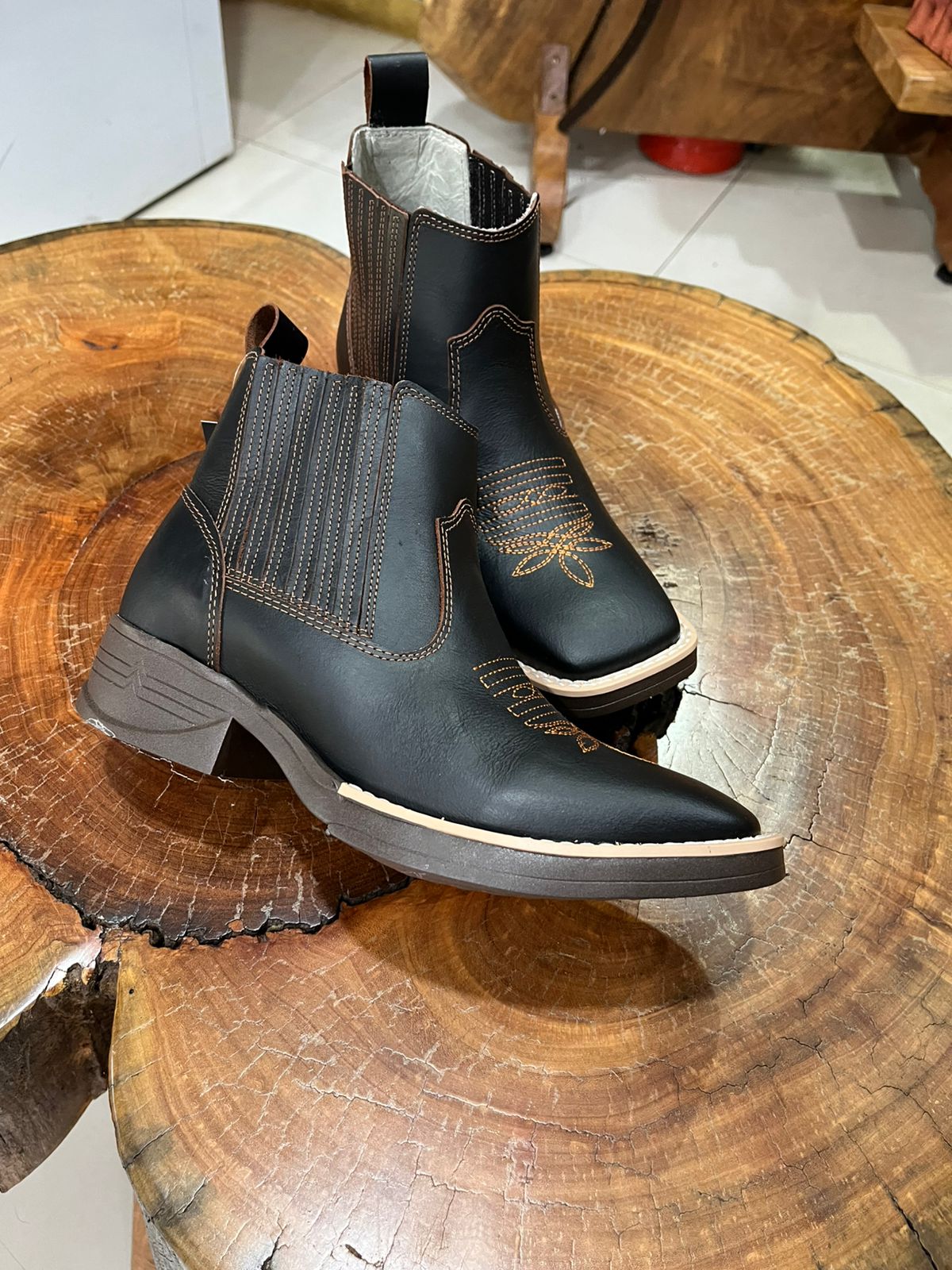 Esta botina preta une a tradição do estilo country com a tecnologia do solado jump, oferecendo um visual robusto e moderno. O modelo apresenta bico quadrado clássico e se destaca pelas costuras decorativas em linha de tom ocre, que criam um contraste elegante sobre o fundo escuro. No peito do pé, um bordado geométrico detalhado reforça a identidade sertaneja da peça.