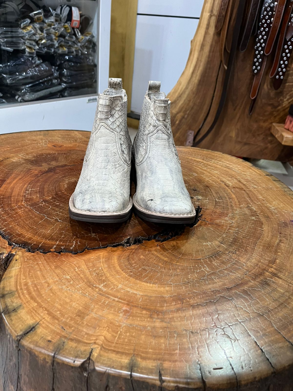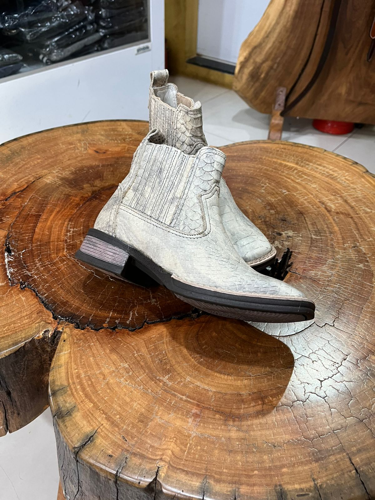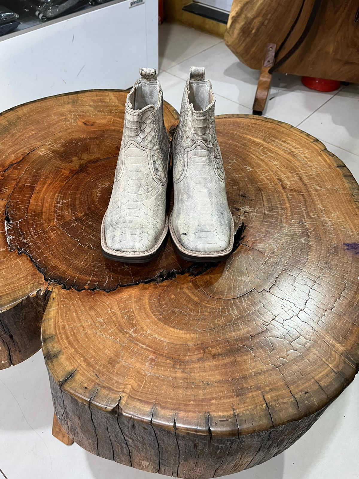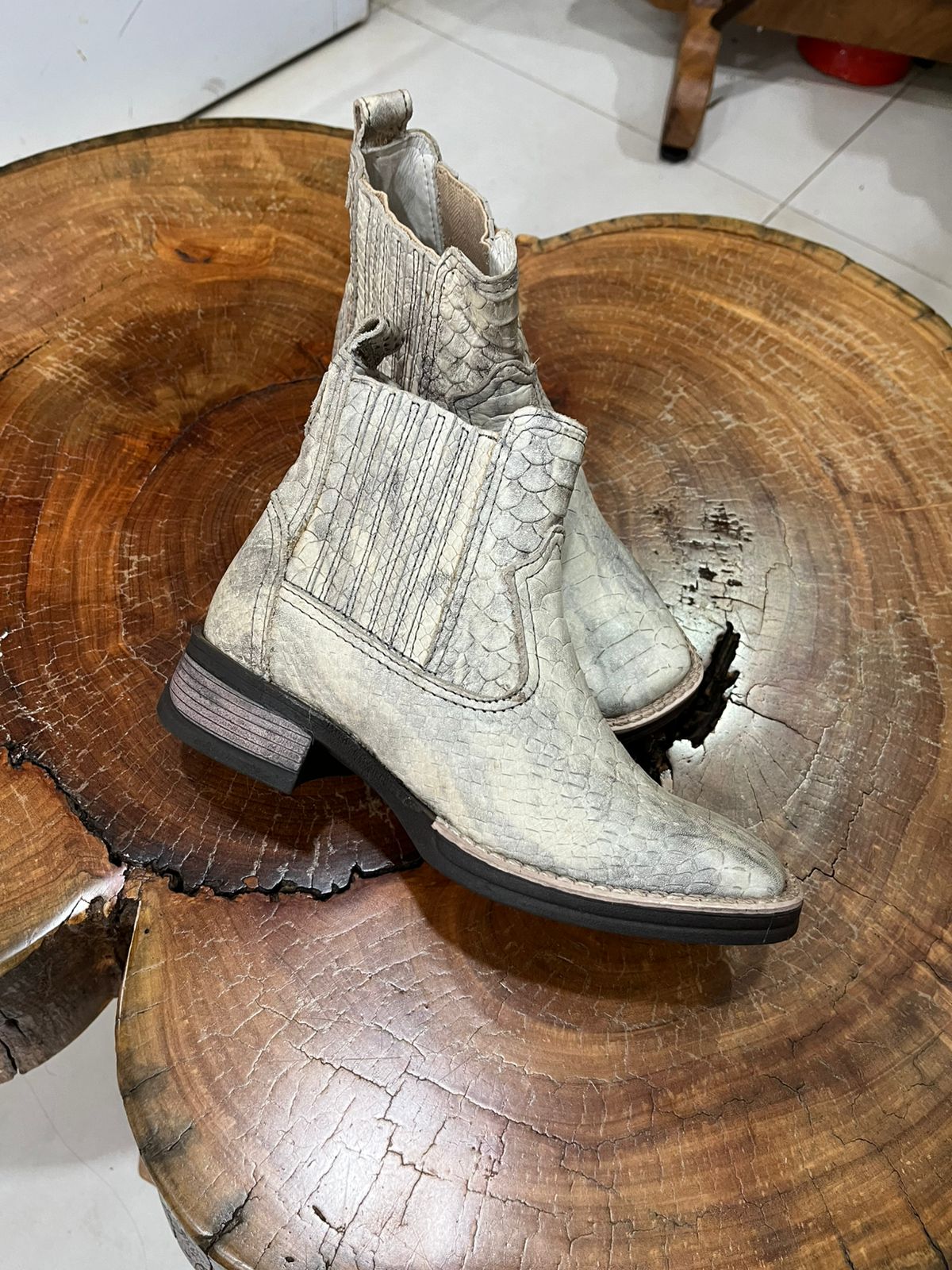 Esta botina de cano curto se destaca pelo seu visual marcante e diferenciado, apresentando uma tonalidade branca com efeito levemente acinzentado que ressalta os detalhes da peça. O grande diferencial está em toda a sua superfície, que conta com uma textura em relevo que imita o padrão de escamas, conferindo um toque exótico e moderno ao calçado.