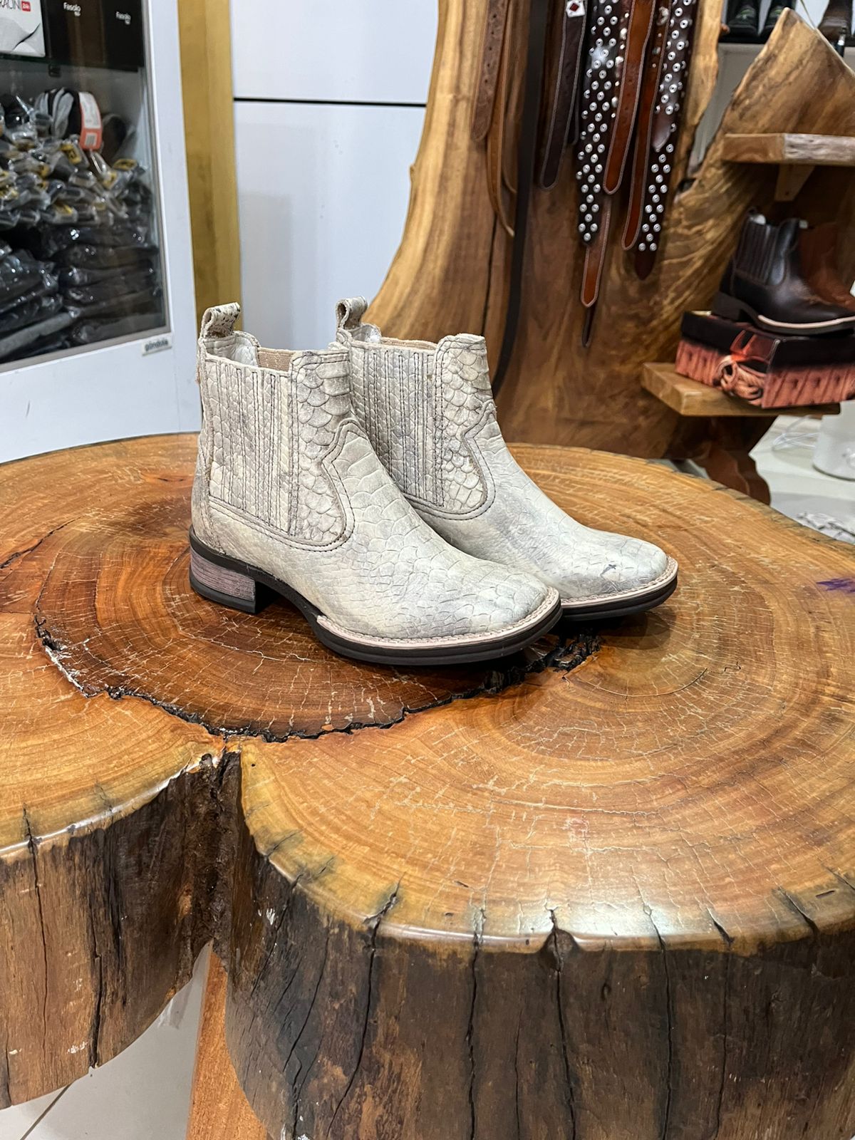 O modelo segue o estilo tradicional com bico quadrado e recortes pespontados que desenham o peito do pé, trazendo a essência country para o design. Para garantir praticidade, as laterais possuem painéis de elástico que permitem um calce justo e confortável, complementados por um puxador na parte traseira. O solado escuro cria um contraste elegante com o corpo claro da botina, finalizado com uma vira em tom natural. É a escolha ideal para quem busca um calçado versátil e com textura única para compor diferentes looks.