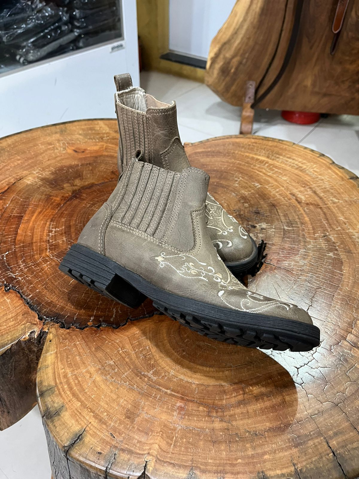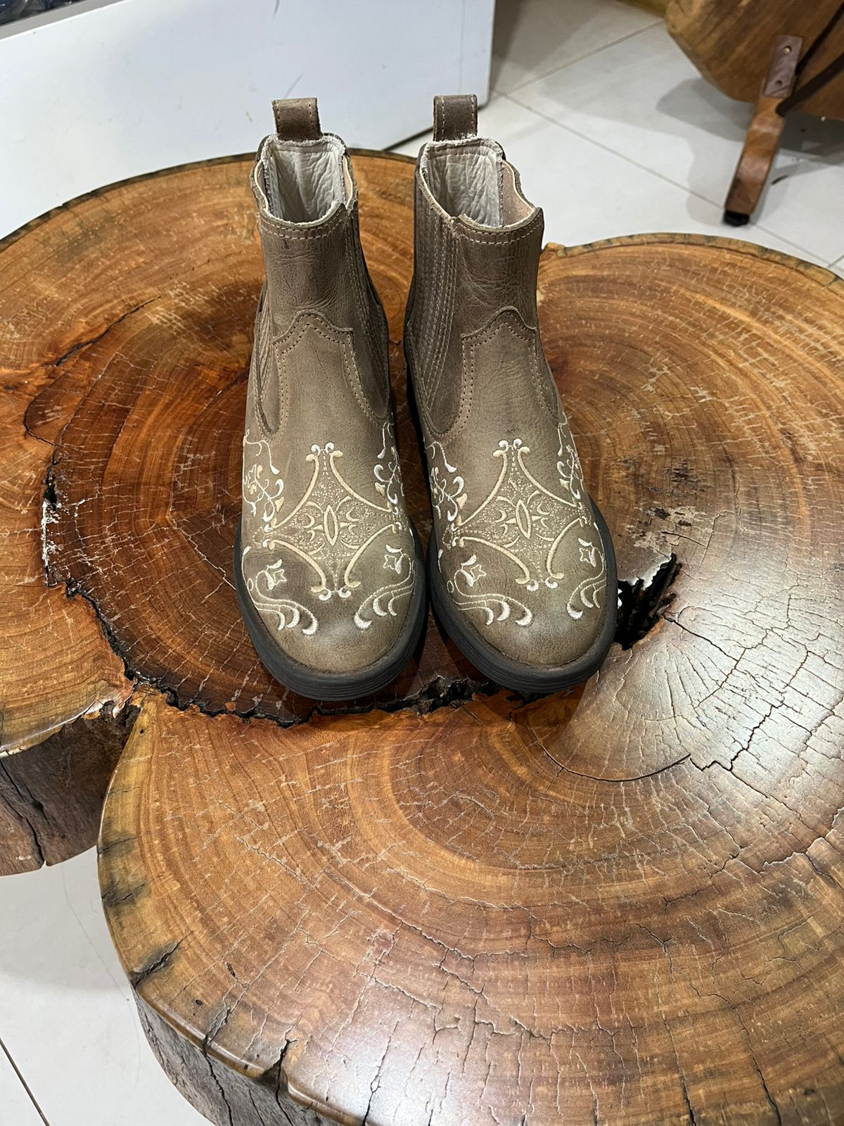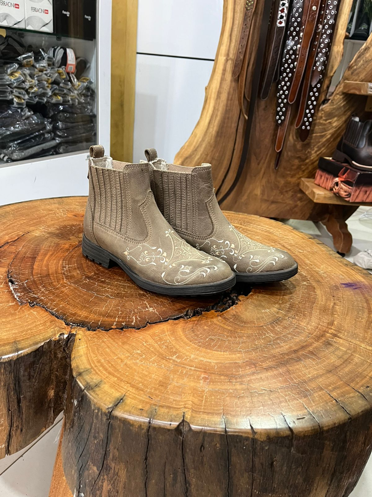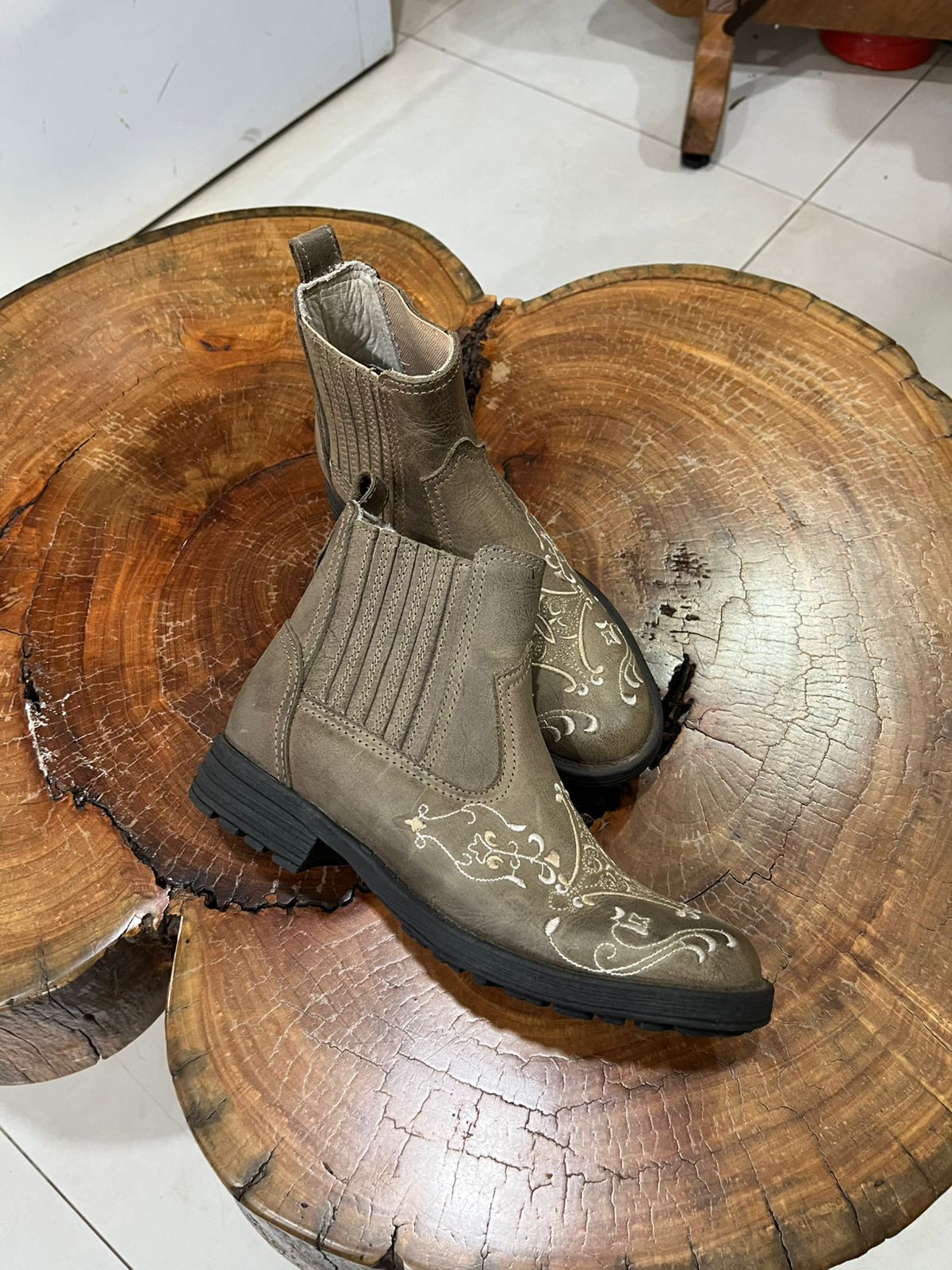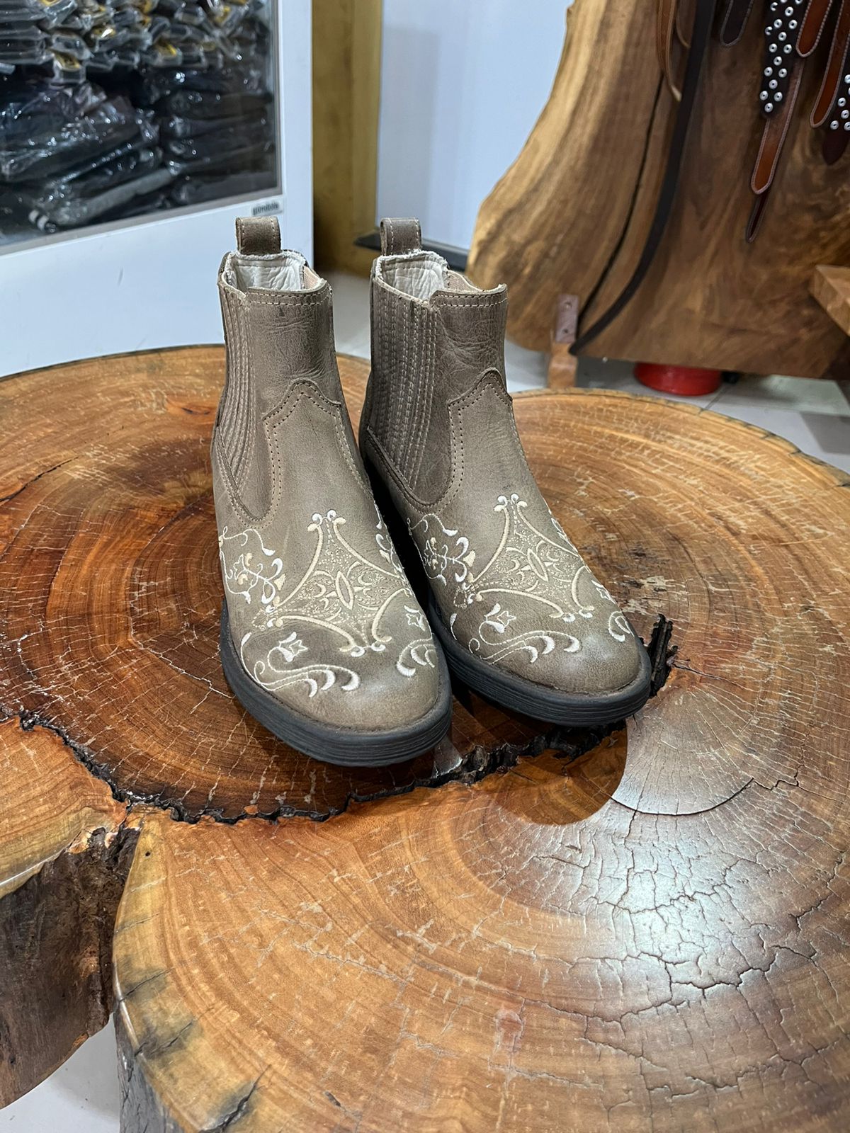 Esta botina de cano curto traz um visual rústico e sofisticado, apresentando uma tonalidade cinza com acabamento envelhecido que confere um aspecto de peça única. O grande diferencial deste modelo é o bordado artístico em estilo arabesco na cor branca, que cobre quase todo o peito do pé com desenhos curvos e detalhados, criando um contraste luminoso sobre o fundo acinzentado.