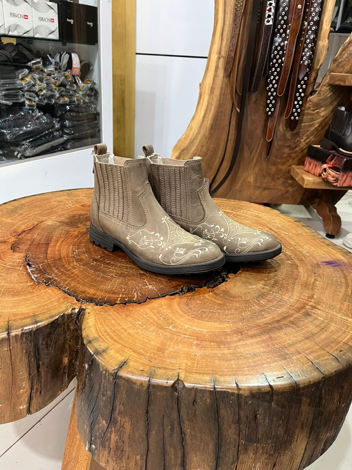 O design foi pensado para oferecer conforto e praticidade no dia a dia, contando com bico arredondado e painéis de elástico nas laterais, facilitando o ajuste ao tornozelo. Além disso, possui um puxador traseiro reforçado para auxiliar no calce. O solado totalmente escuro proporciona um acabamento discreto e robusto, garantindo a durabilidade necessária para o uso frequente. É o calçado ideal para quem busca fugir do tradicional marrom ou preto, mantendo a essência country com um toque de elegância artesanal.