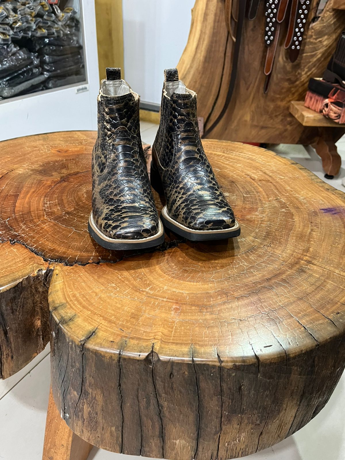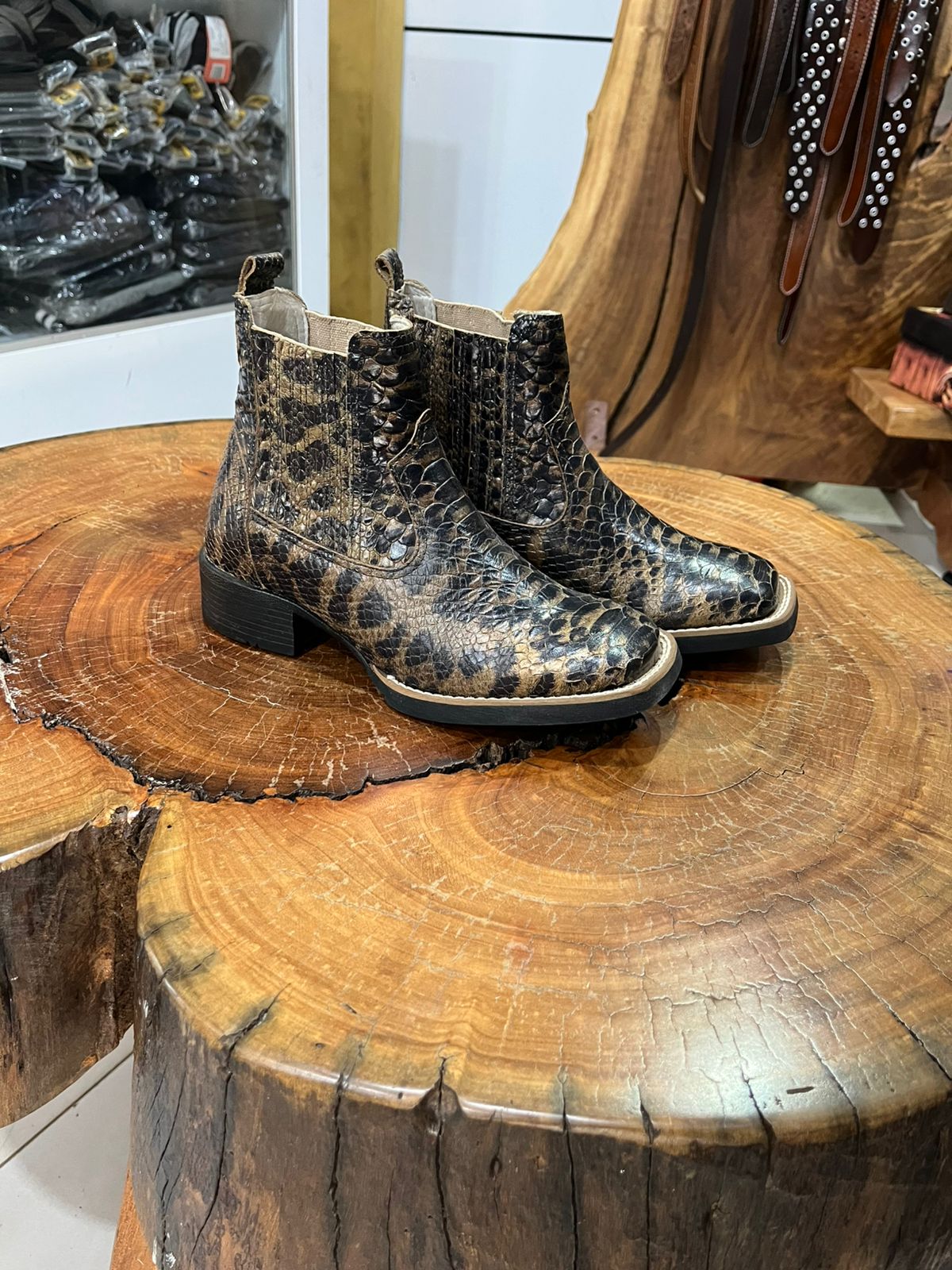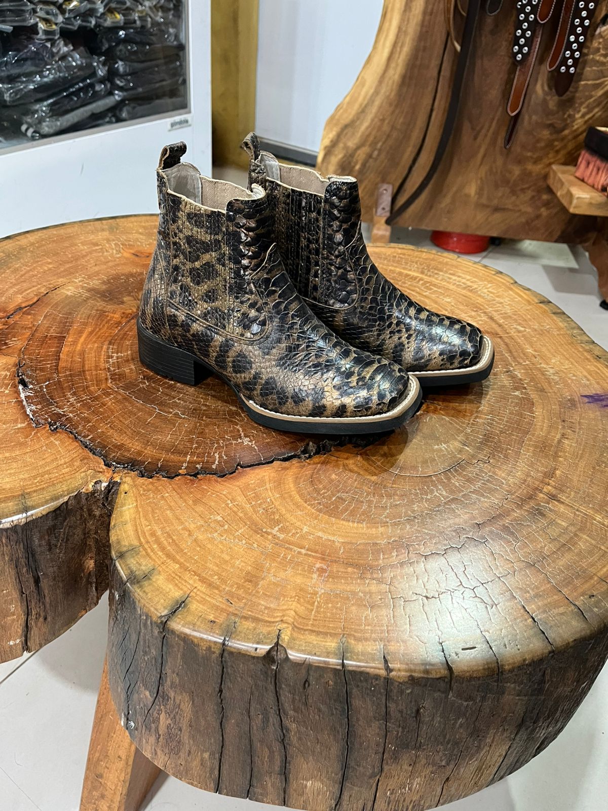 Esta botina de cano curto é a peça definitiva para quem deseja unir o estilo country com a ousadia da moda animal print. O modelo se destaca pela estampa de onça em tons metálicos de dourado e preto, que ganha uma dimensão extra graças à textura em relevo que simula escamas por toda a superfície. O design conta com bico quadrado, garantindo o conforto clássico e o visual robusto das botas sertanejas.