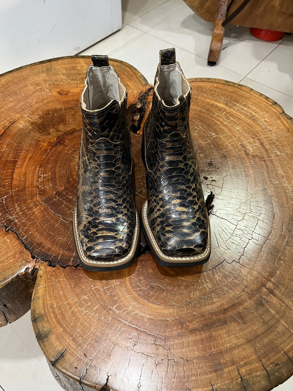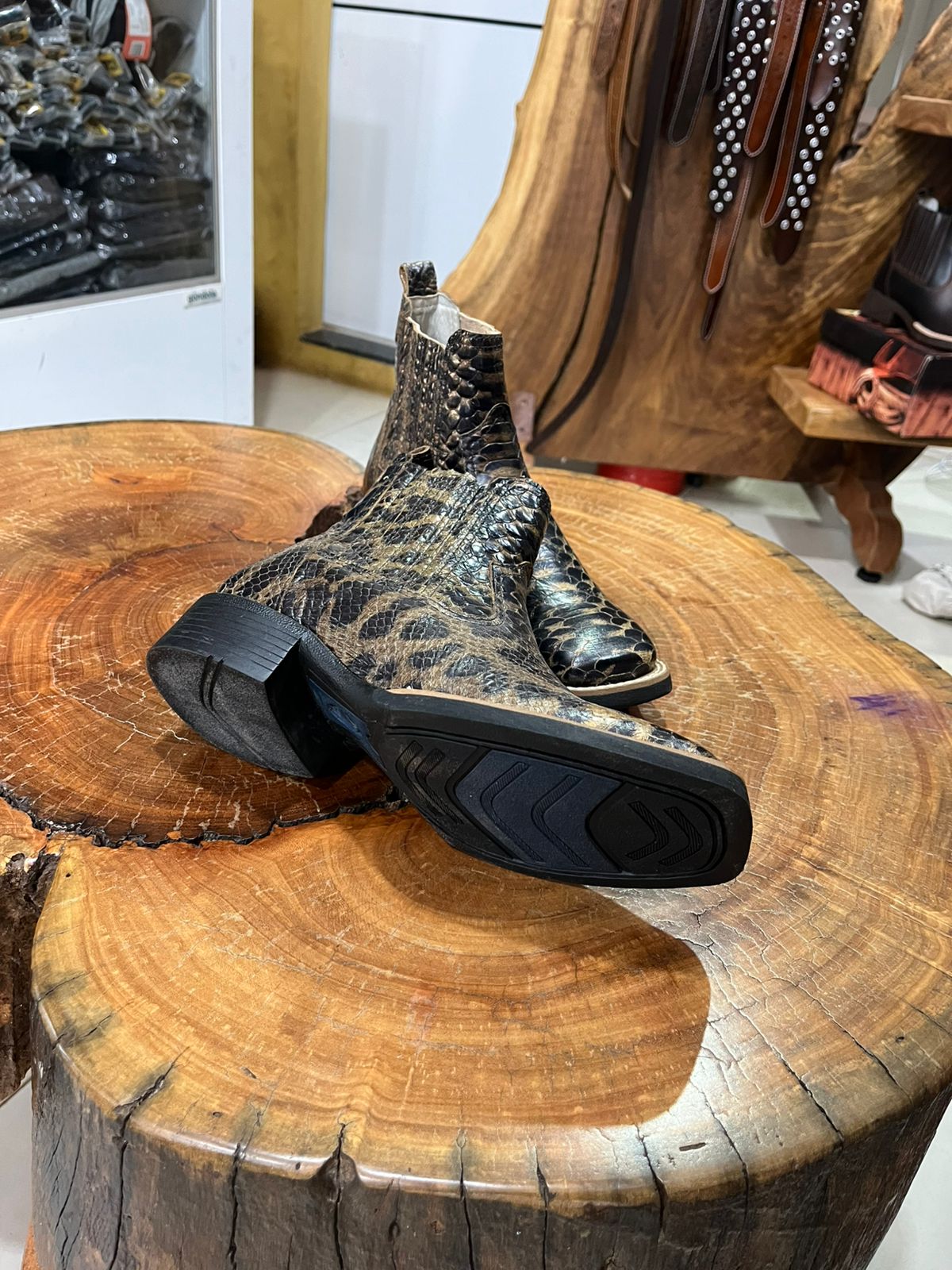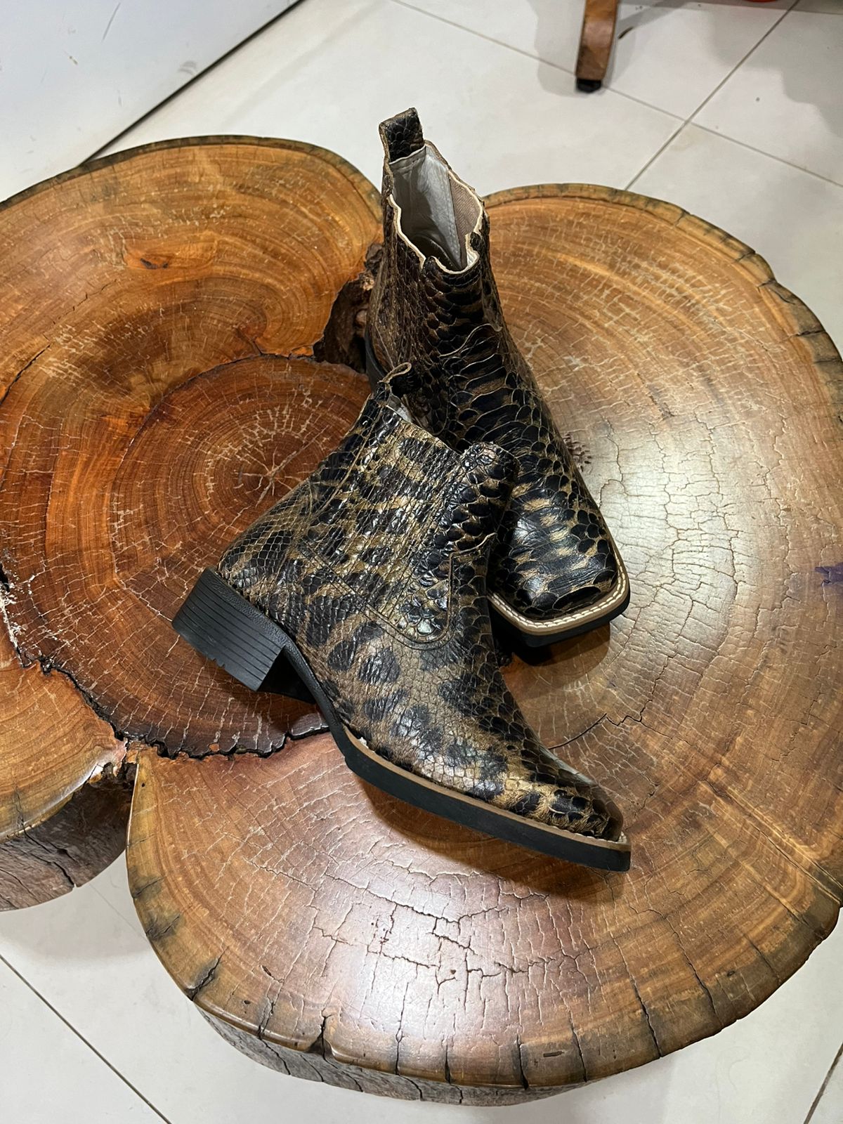 Esta botina de cano curto é a peça definitiva para quem deseja unir o estilo country com a ousadia da moda animal print. O modelo se destaca pela estampa de onça em tons metálicos de dourado e preto, que ganha uma dimensão extra graças à textura em relevo que simula escamas por toda a superfície. O design conta com bico quadrado, garantindo o conforto clássico e o visual robusto das botas sertanejas.