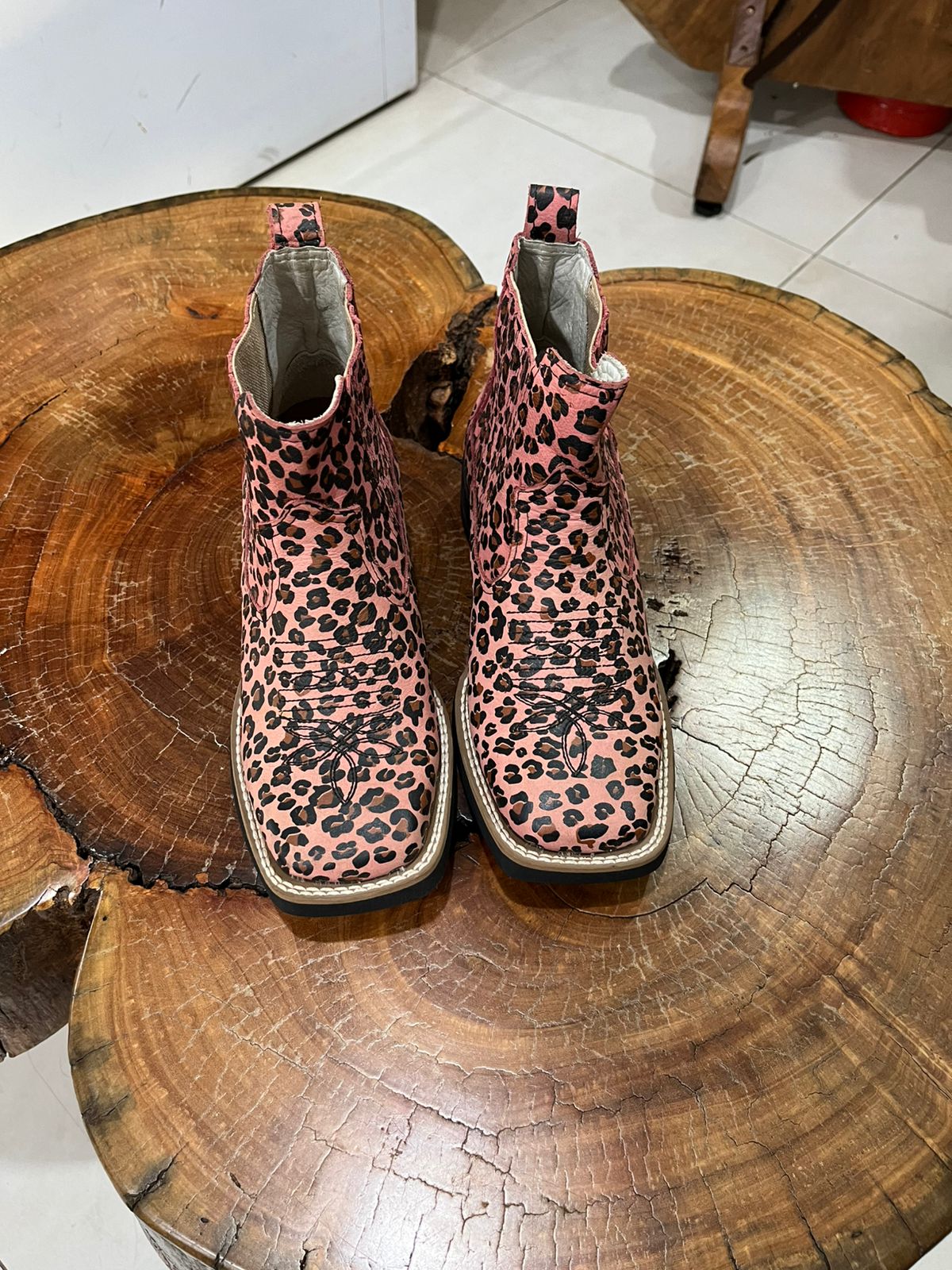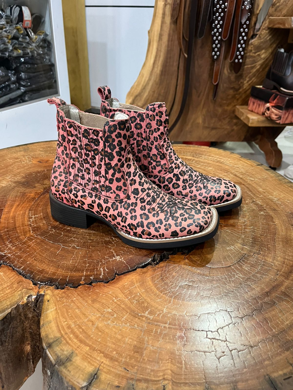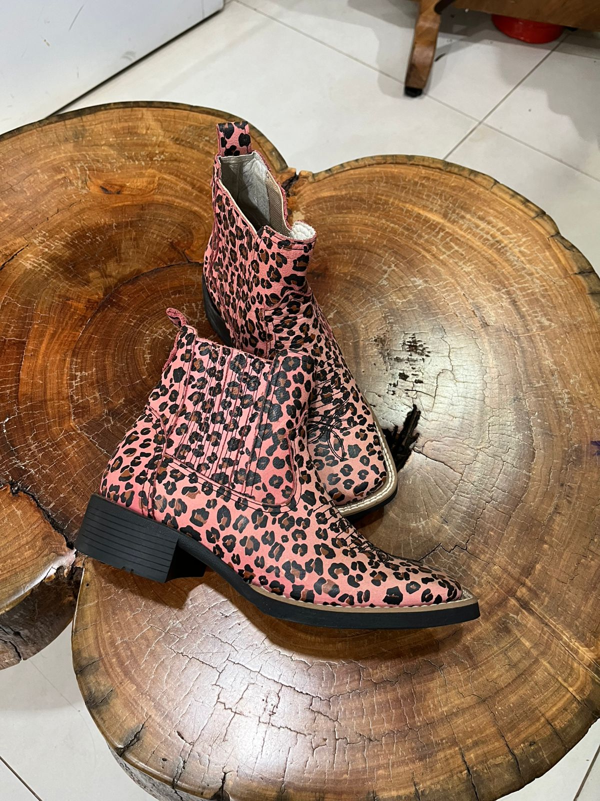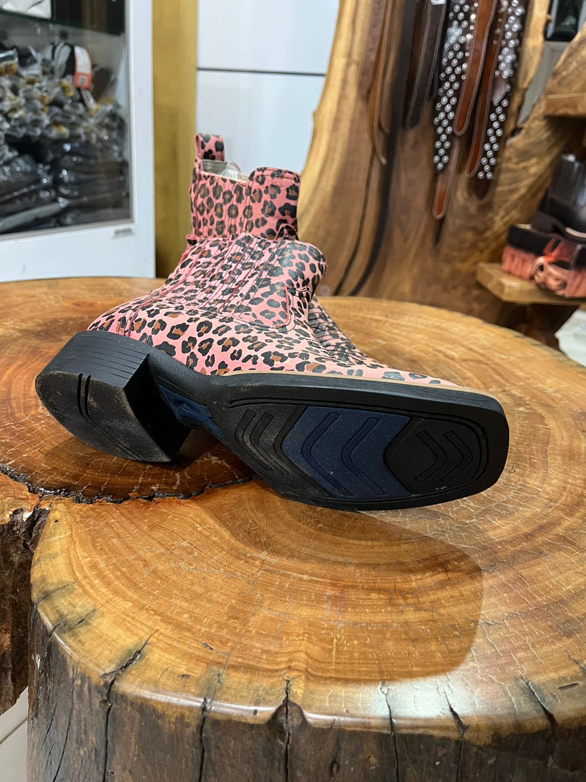 Esta botina é a escolha perfeita para quem quer unir a tradição country com uma explosão de cor e modernidade. O modelo se destaca pela estampa de onça em preto e marrom sobre um fundo rosa intenso, cobrindo todo o cabedal e até mesmo os painéis de elástico laterais, criando um visual uniforme e de muito impacto.