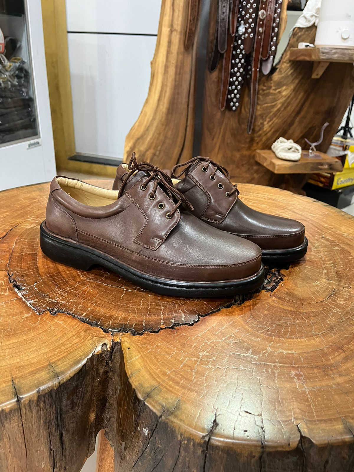 Sapato casual masculino na cor marrom café, confeccionado em couro legítimo macio com fechamento em cadarço. Apresenta solado de borracha anatômico e forração interna clara, perfeito para quem busca conforto absoluto e elegância no dia a dia.